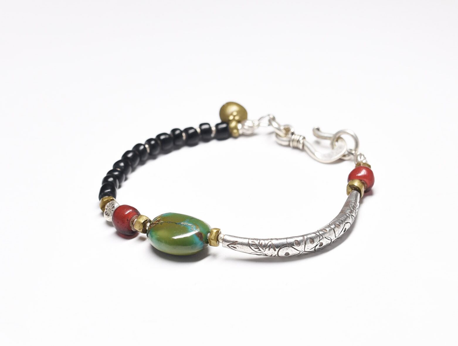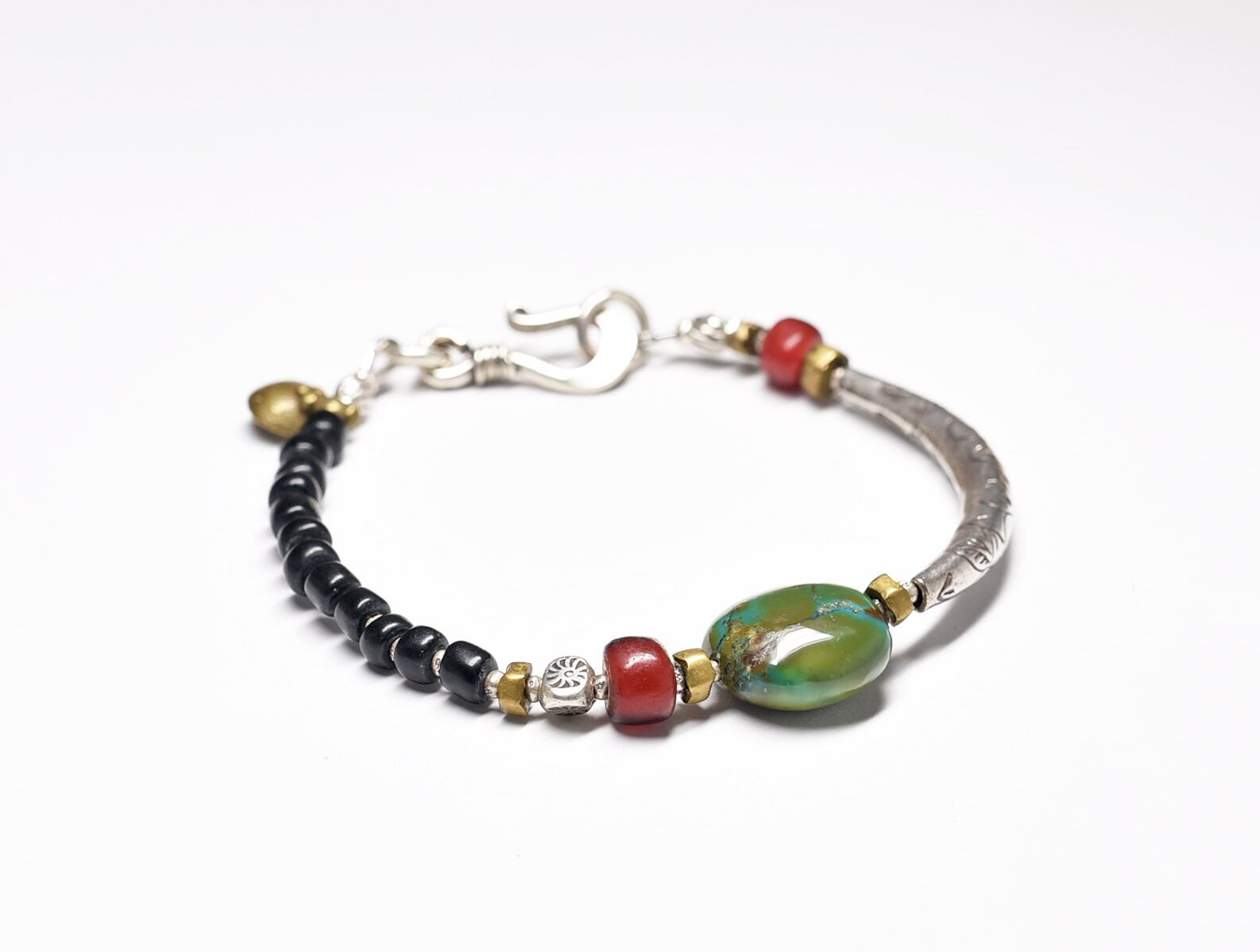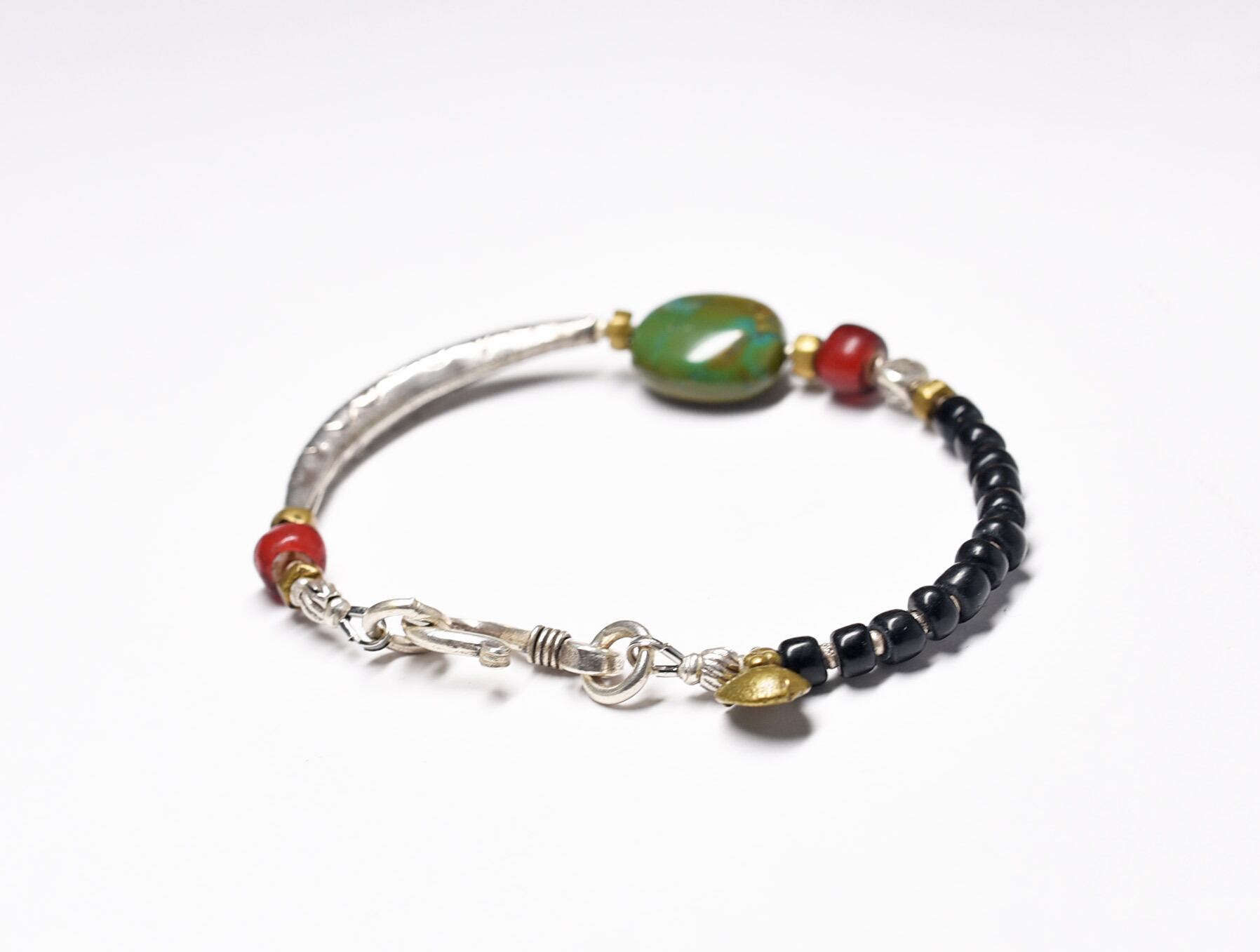 チベタンターコイズを中心に、金赤ホワイトハーツ、湾曲したカレンシルバー、ブラックのアンティークビーズなどで繋いだブレスです。