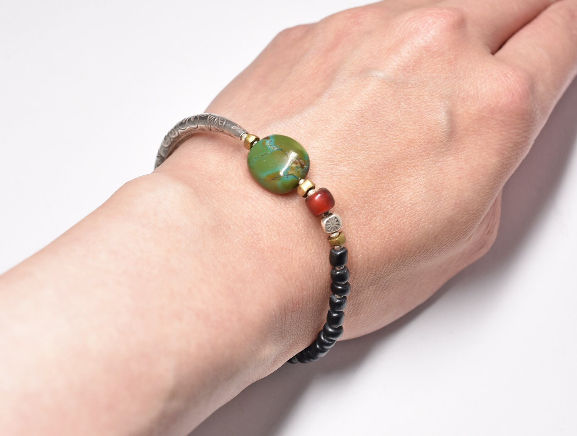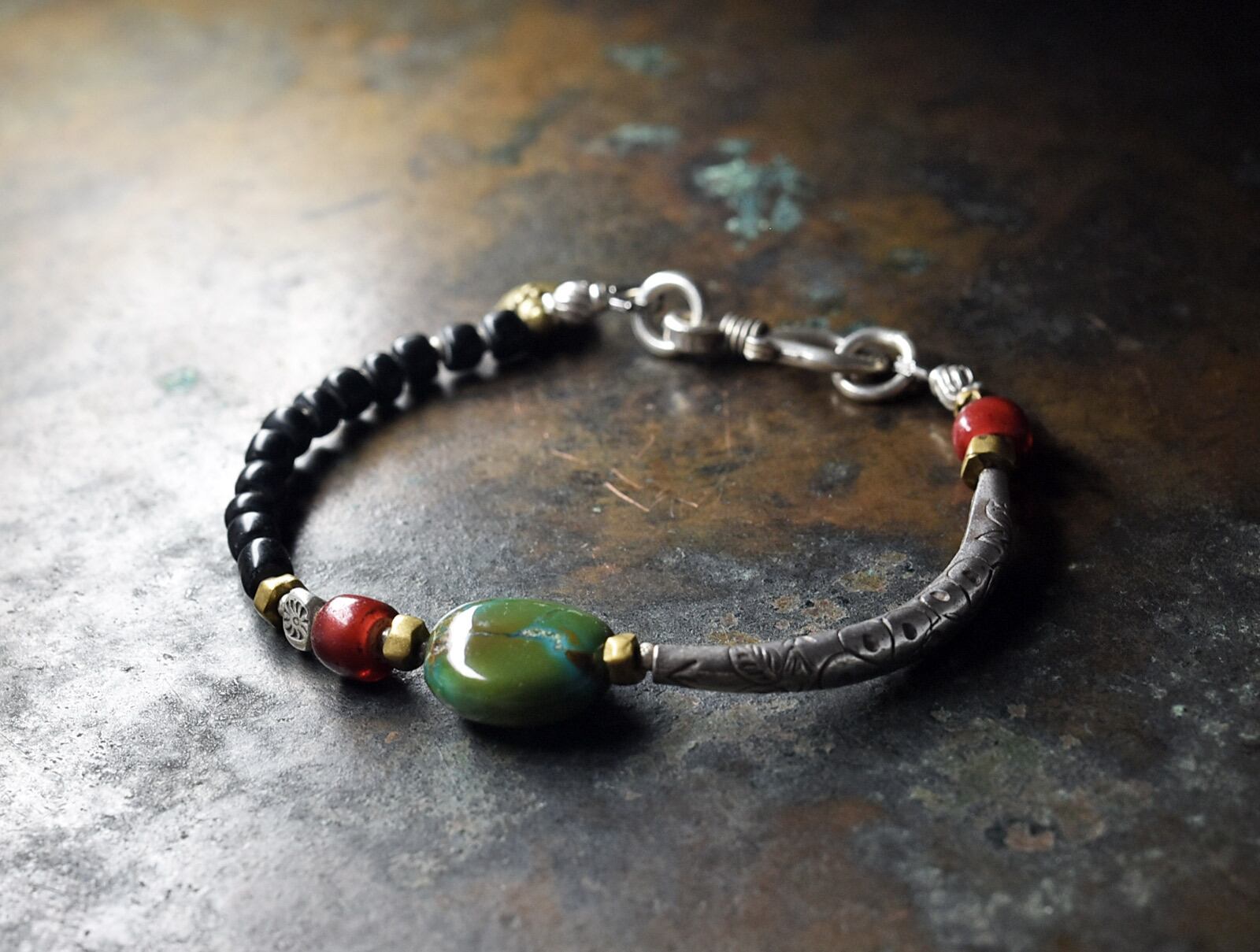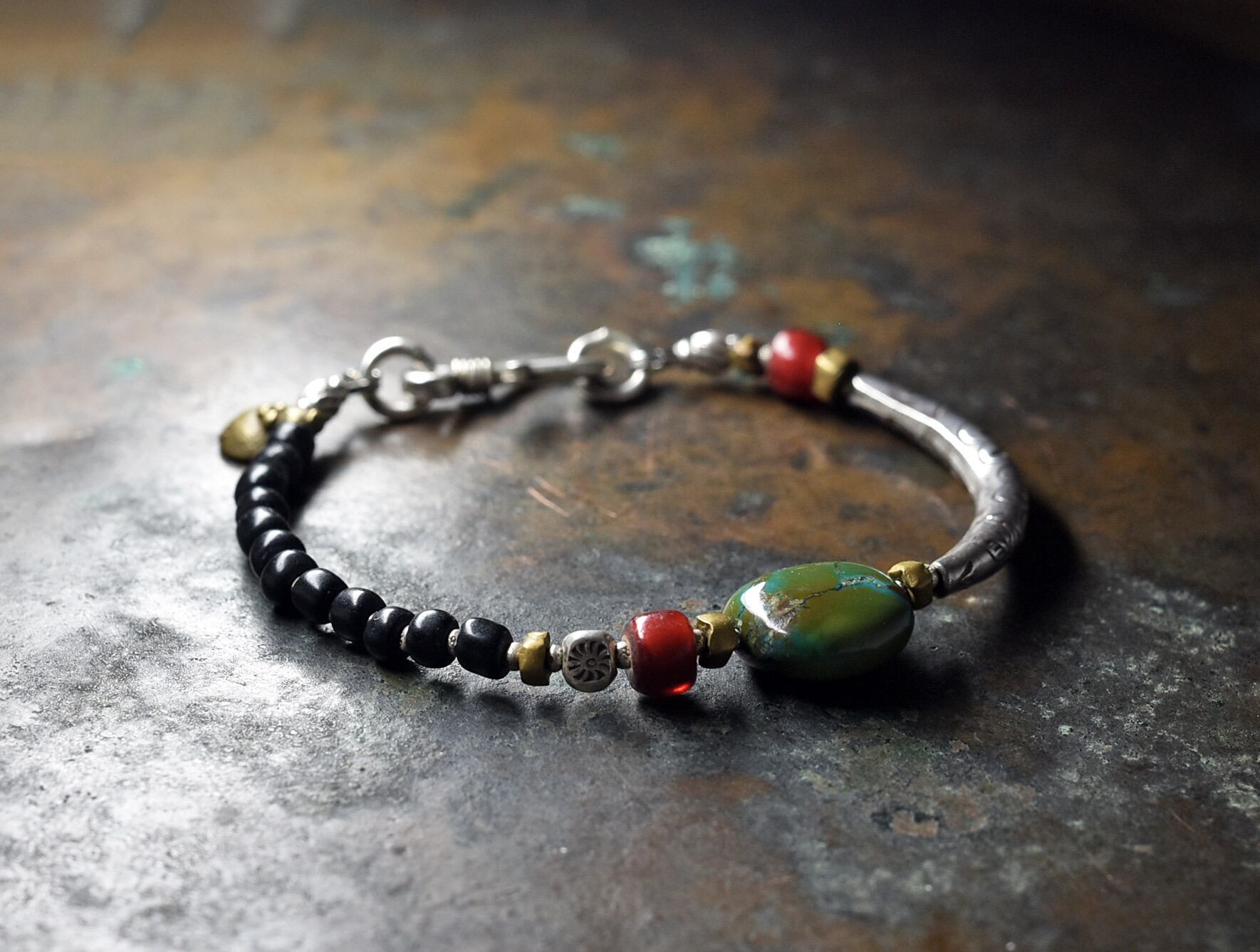 チベタンターコイズを中心に、金赤ホワイトハーツ、湾曲したカレンシルバー、ブラックのアンティークビーズなどで繋いだブレスです。