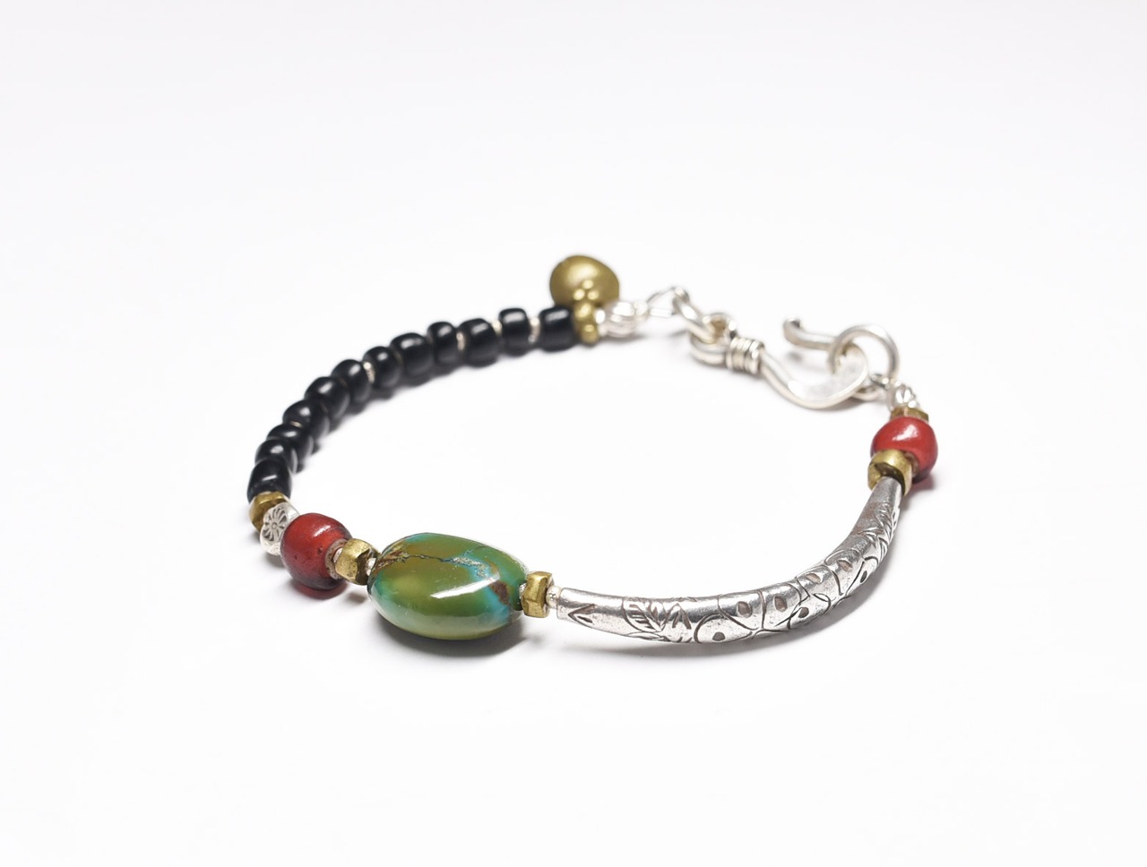 チベタンターコイズと金赤ホワイトハーツ、湾曲カレンシルバー、ブラックアンティークビーズのブレス