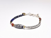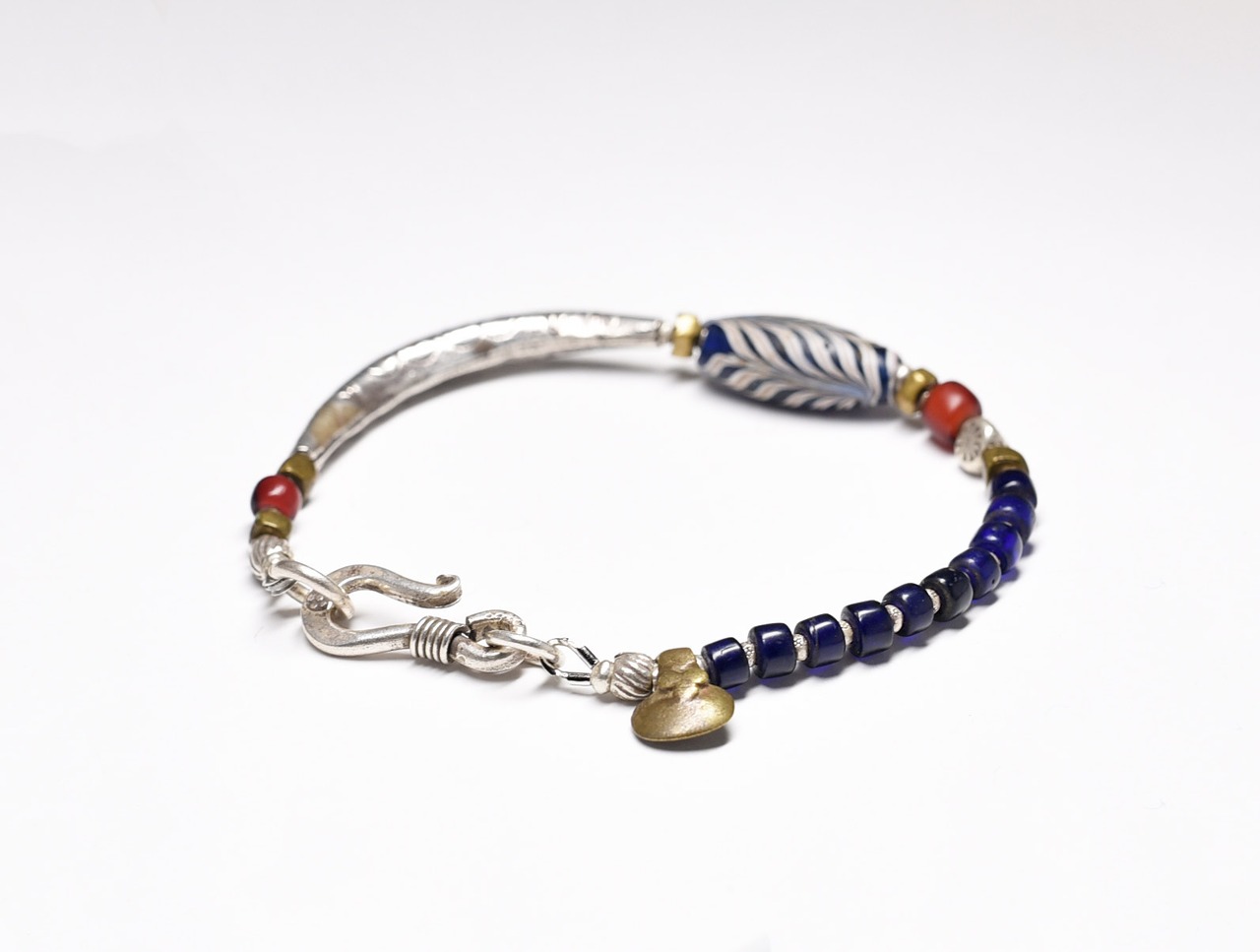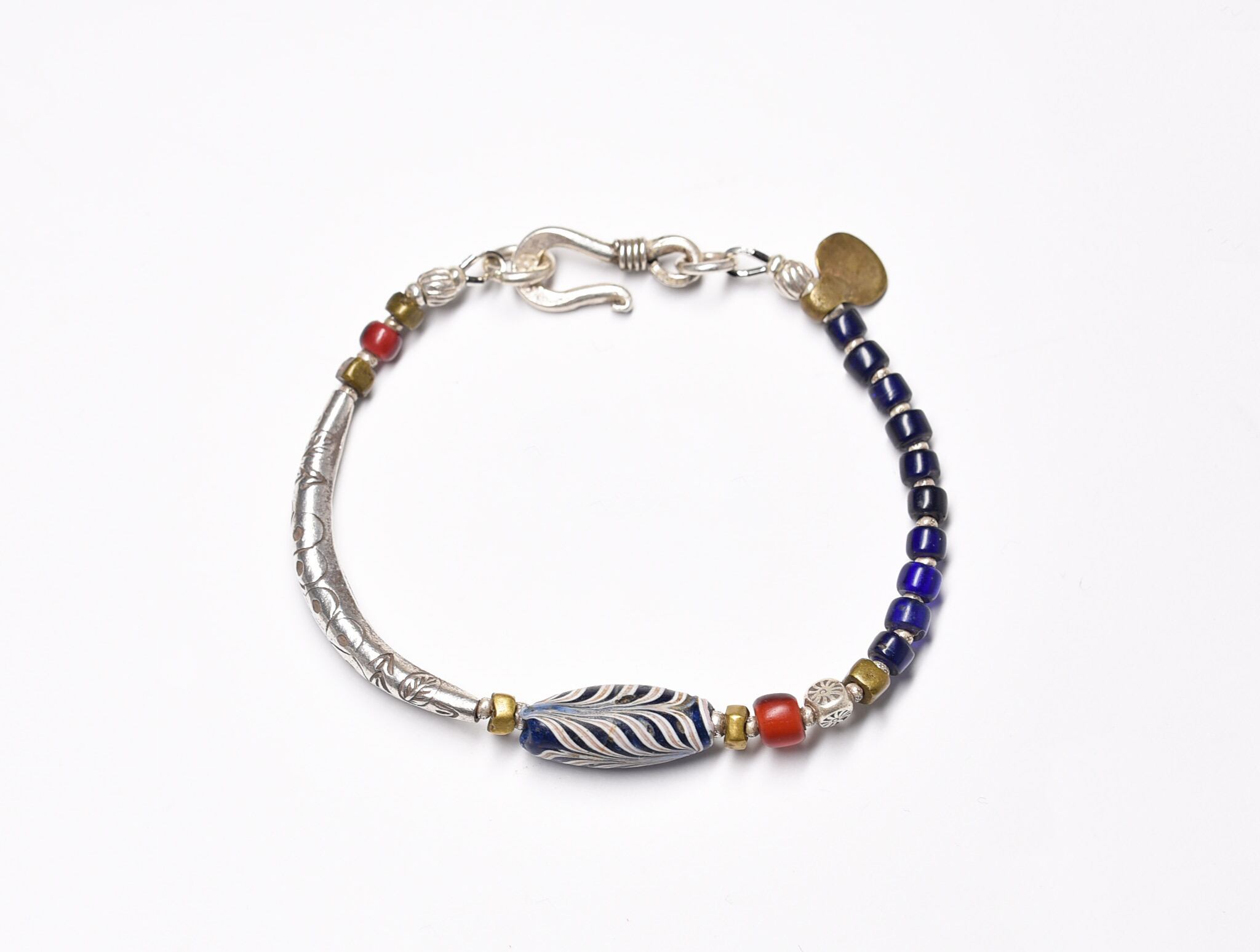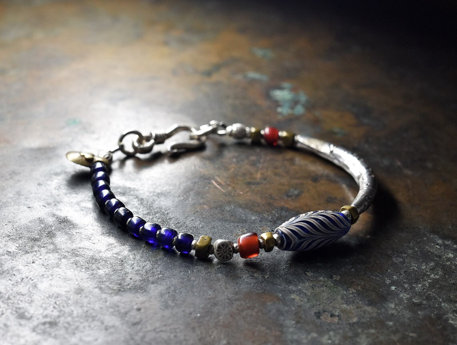 ブルーフェザービーズと金赤ホワイトハーツ、湾曲カレンシルバー、瑠璃色アンティークビーズのブレス