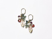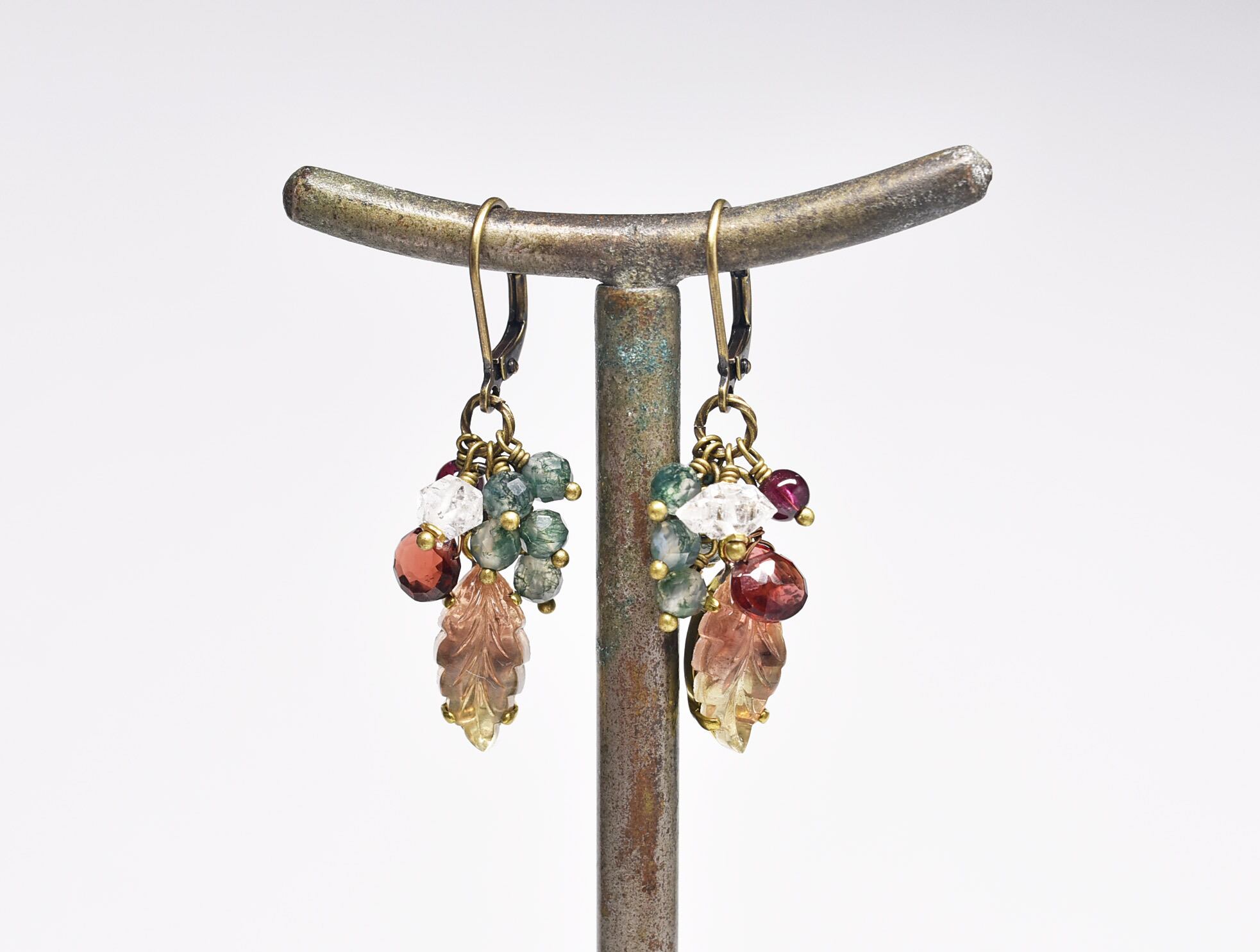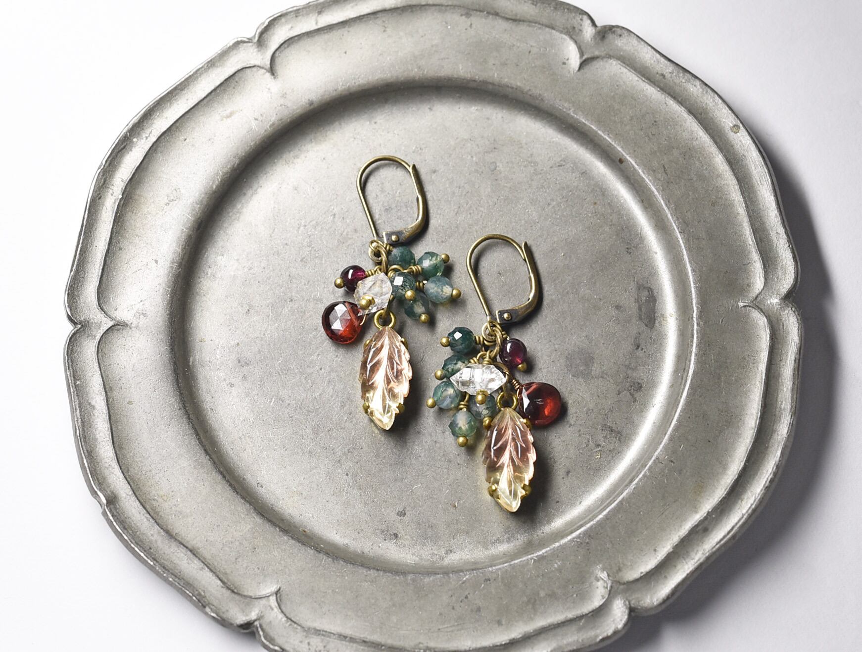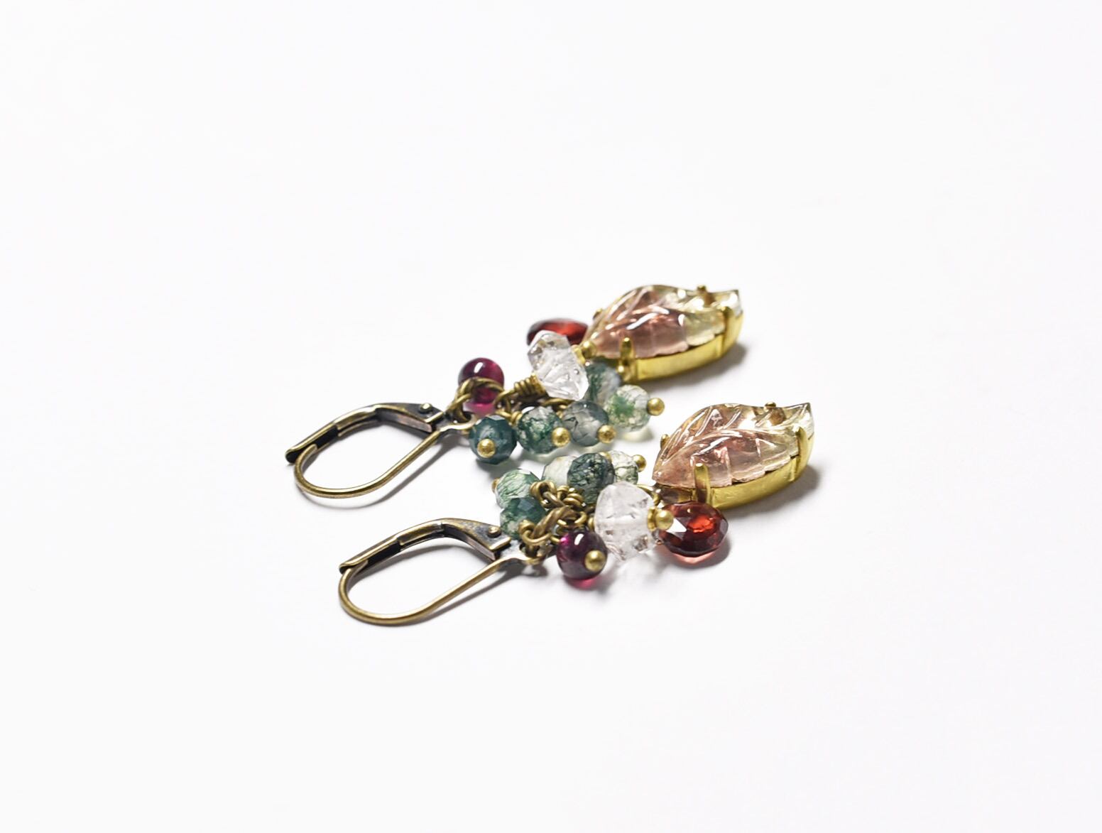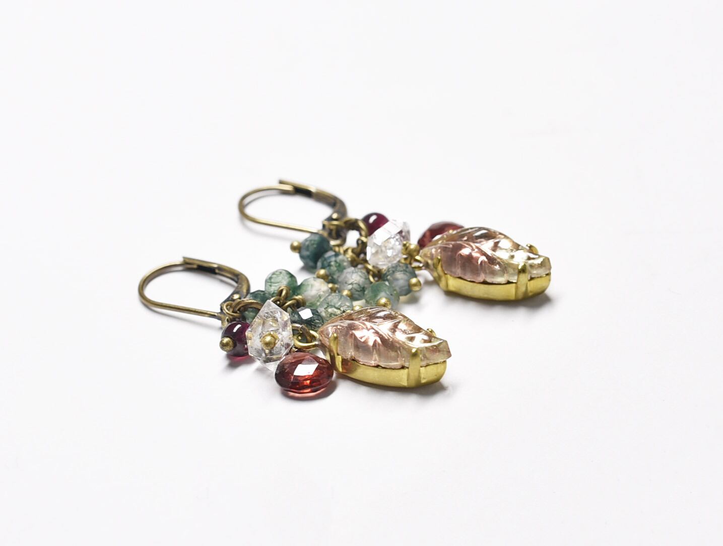 ヴィンテージビーズとたわわなモスアゲート、ハーキマーダイヤモンドと2種類のガーネットを繋いだピアスです。