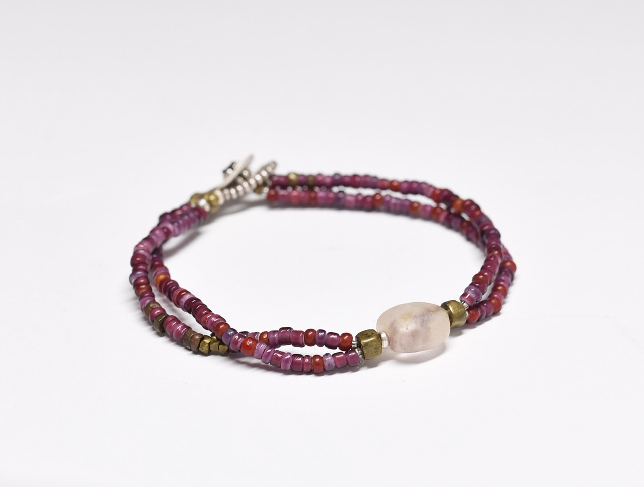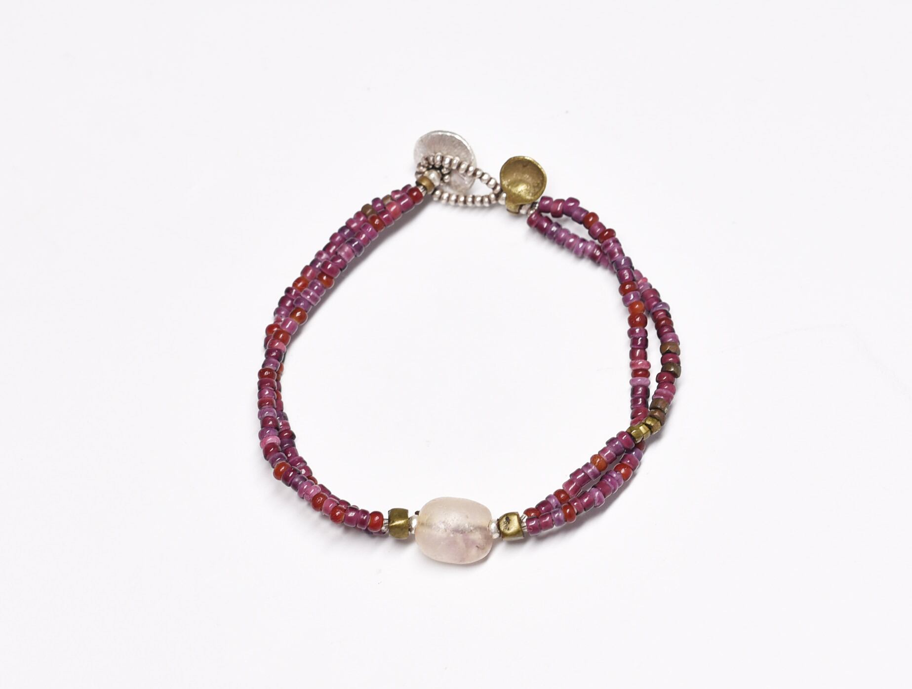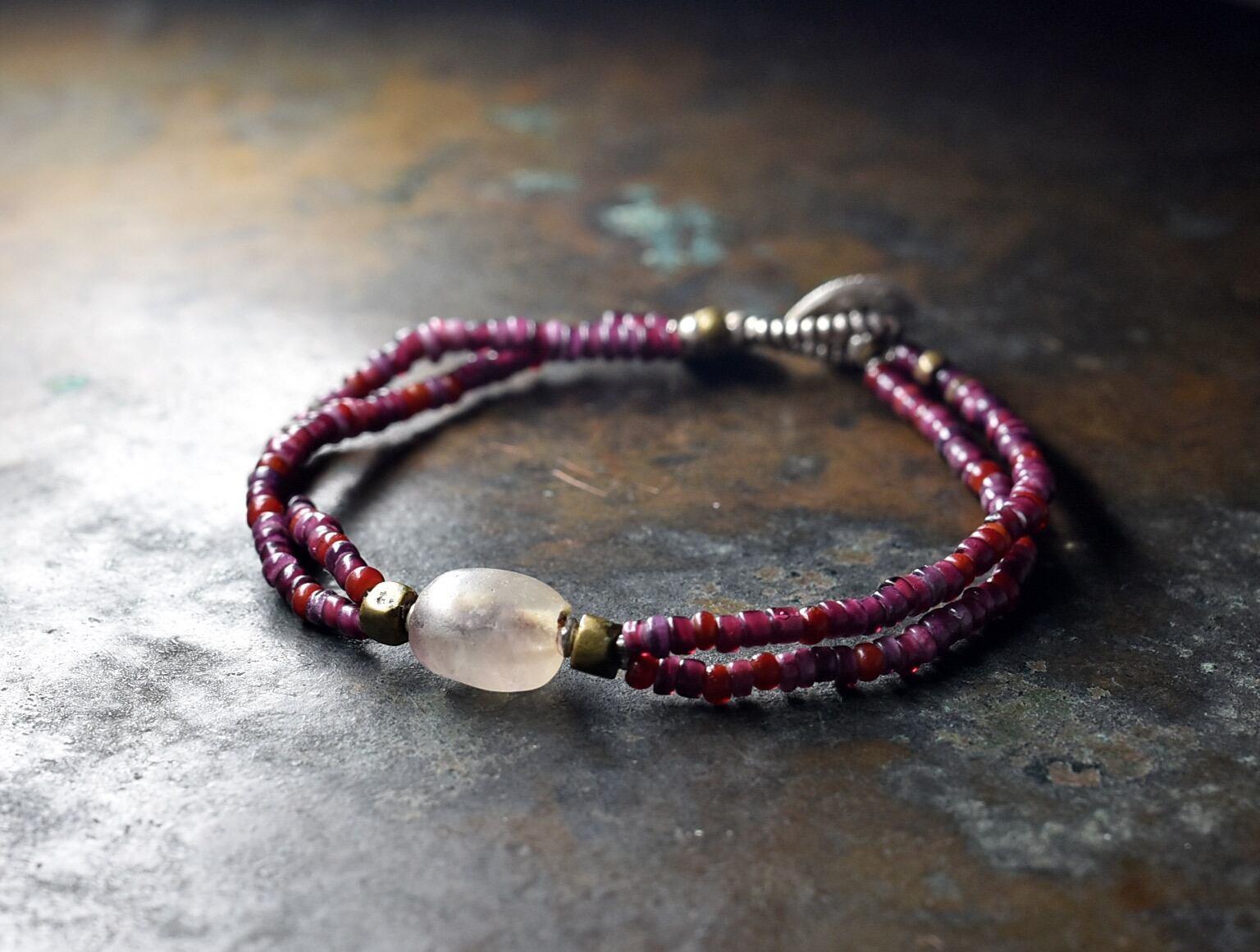 アメジスト入り古代水晶と葡萄色ホワイトハーツ、oldオリッサブラスの2連ブレス