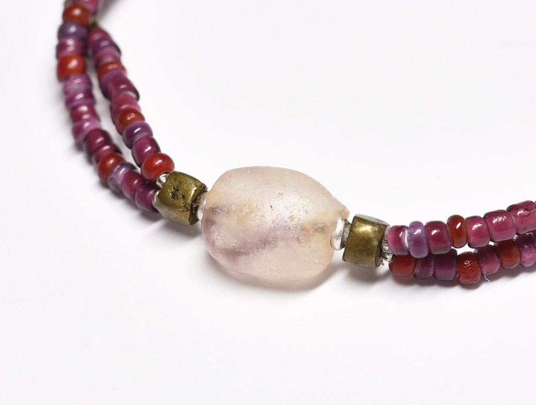 濃淡のある紫色や赤色のビーズはホワイトハーツと呼ばれるアンティークビーズです。