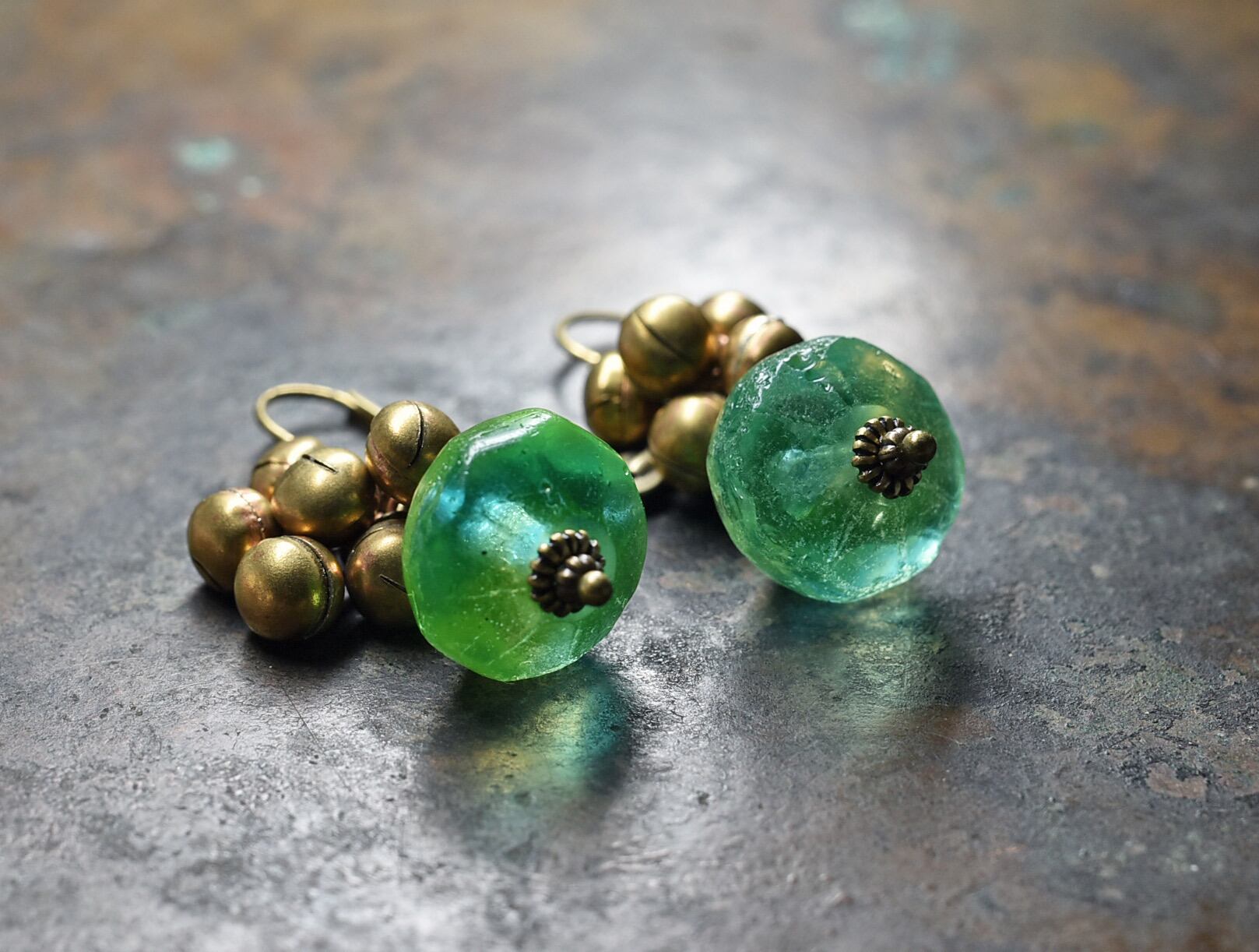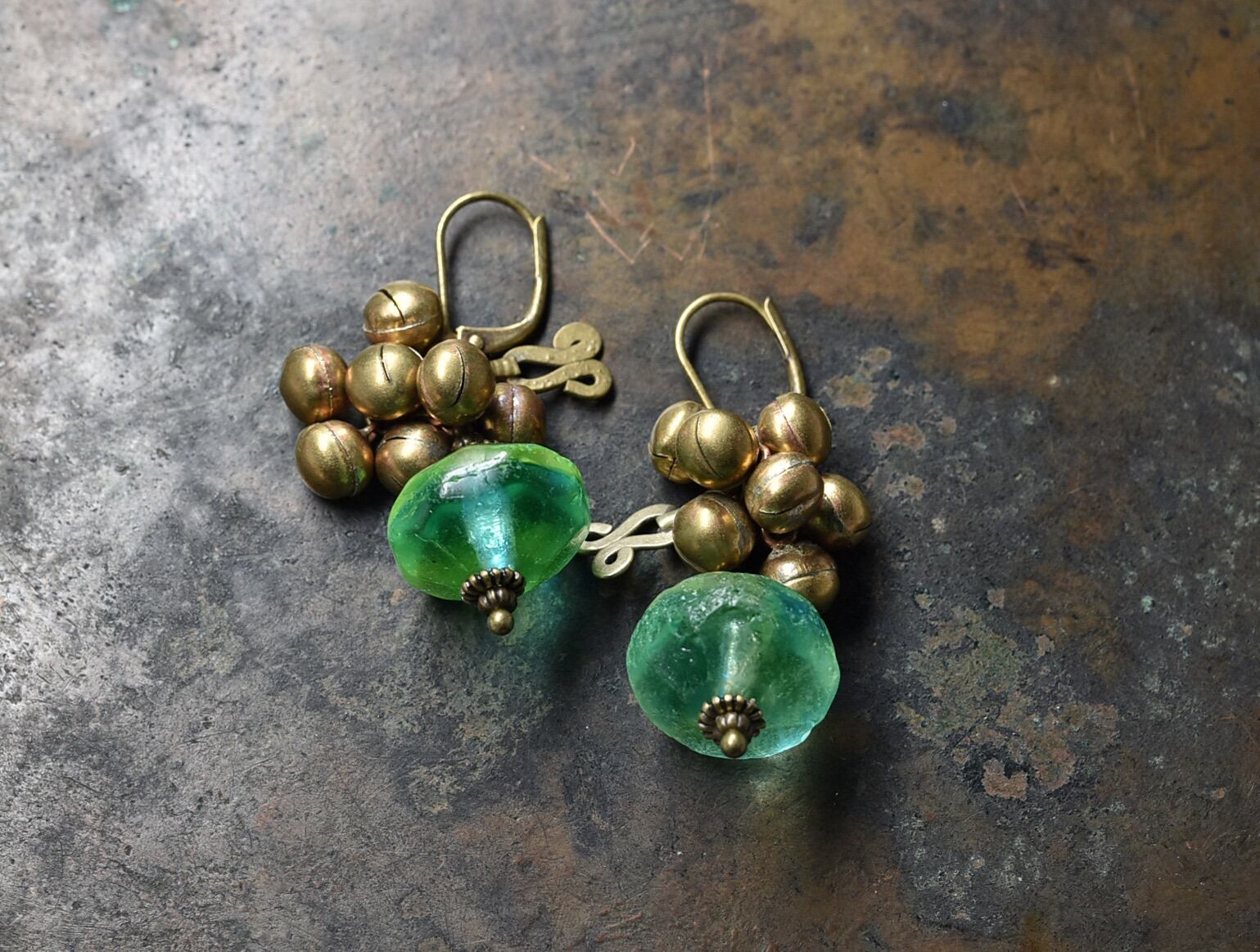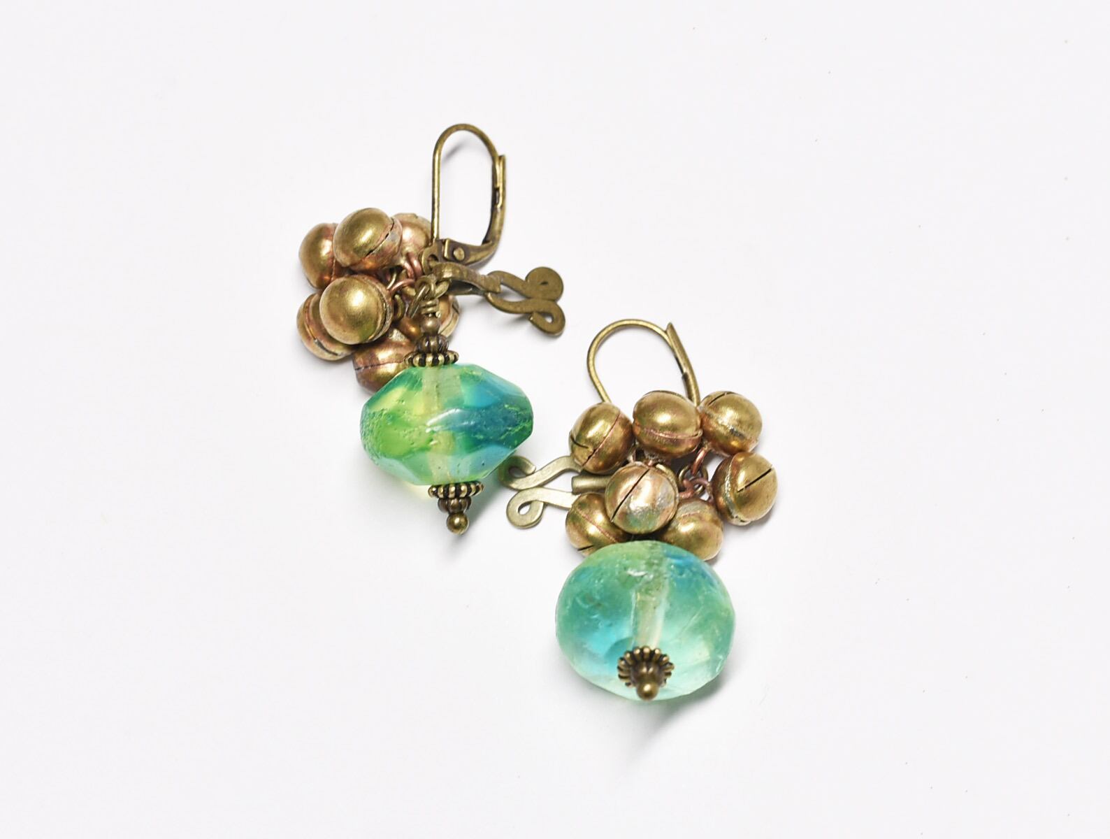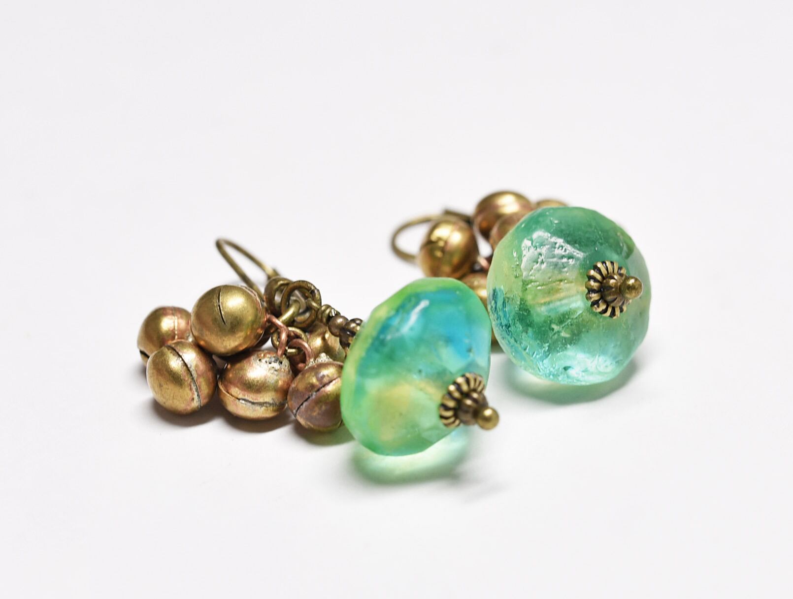 アンティークバイカラーウランガラスとたわわな鈴、アフガンパーツのピアス