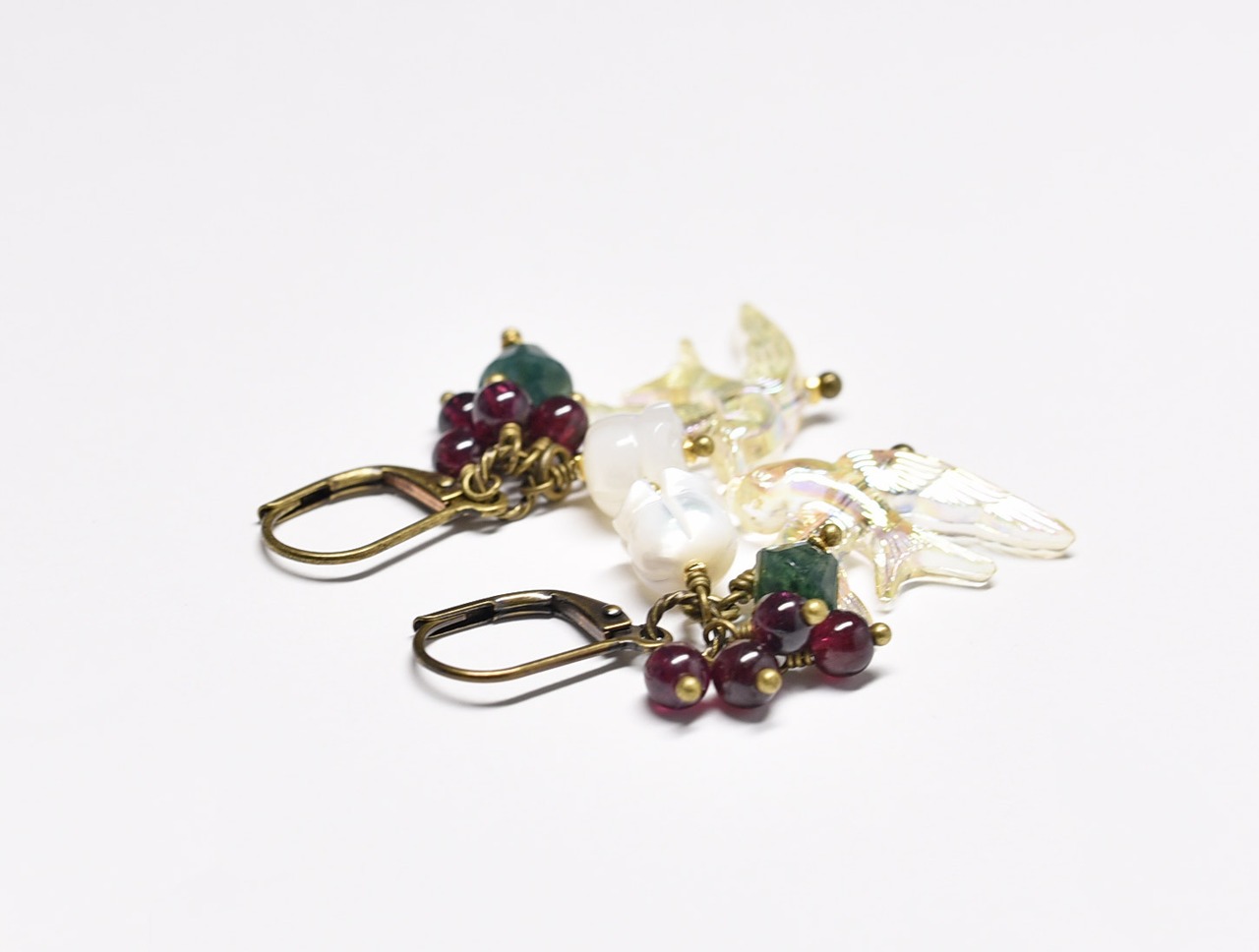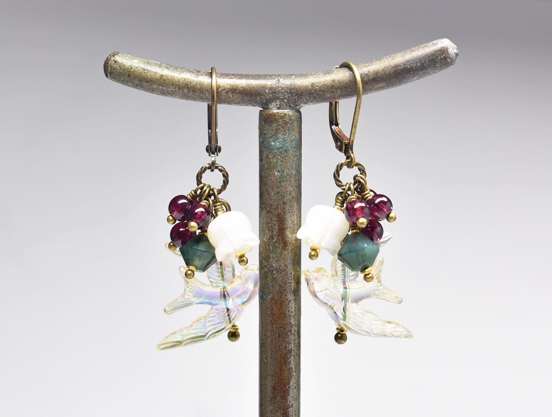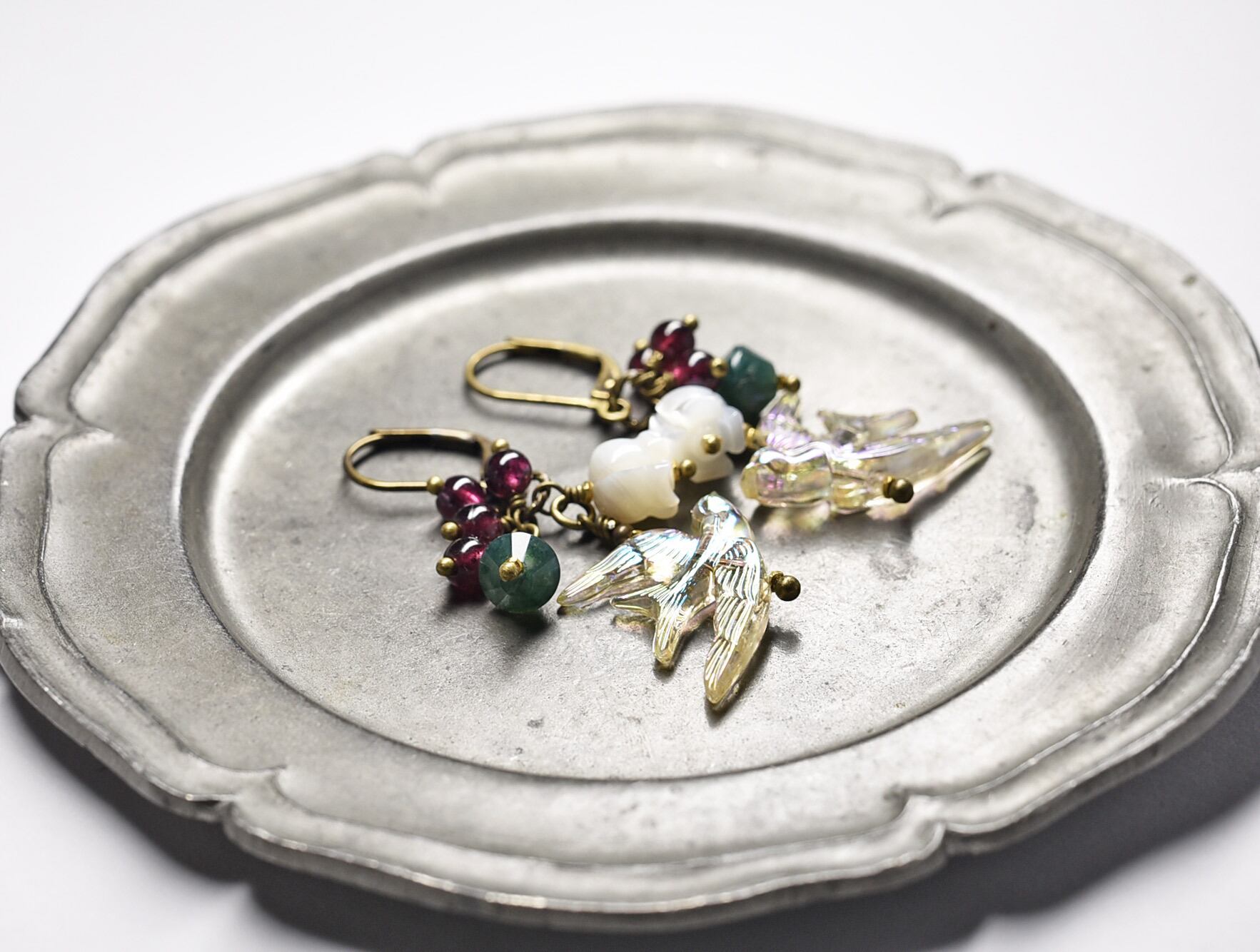 ドイツヴィンテージのツバメとたわわなガーネット、白蝶貝のすずらん、モスアゲートを繋いだピアスです。