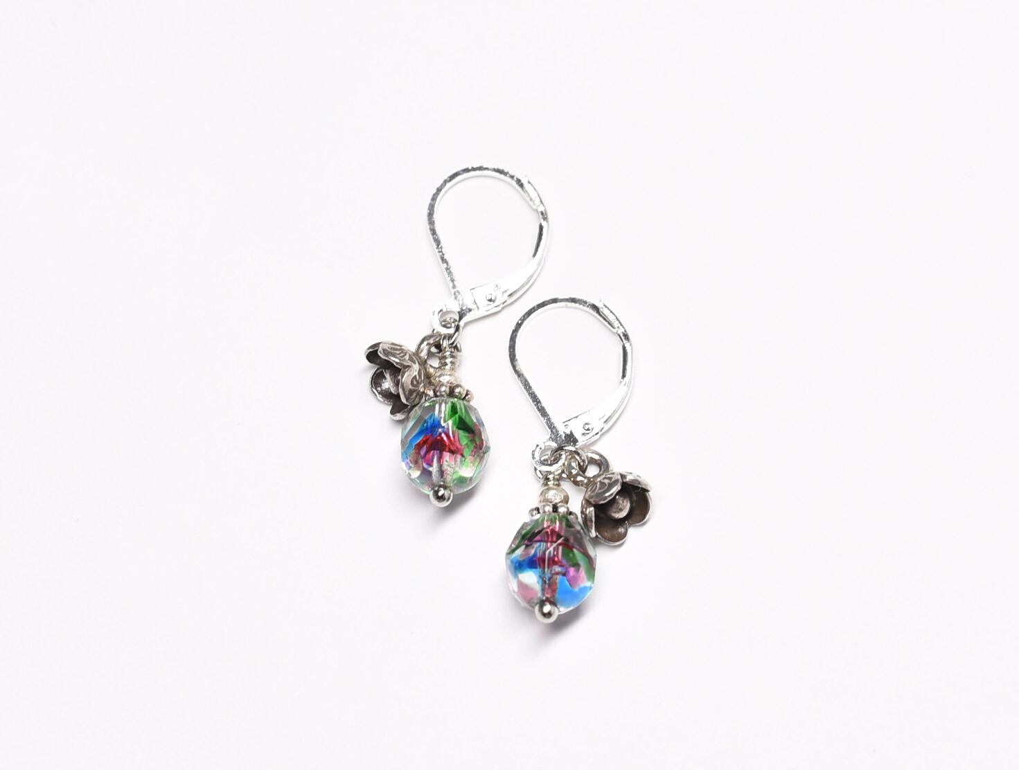 ヴィンテージアイリスガラスと小さなお花カレンシルバーのピアス