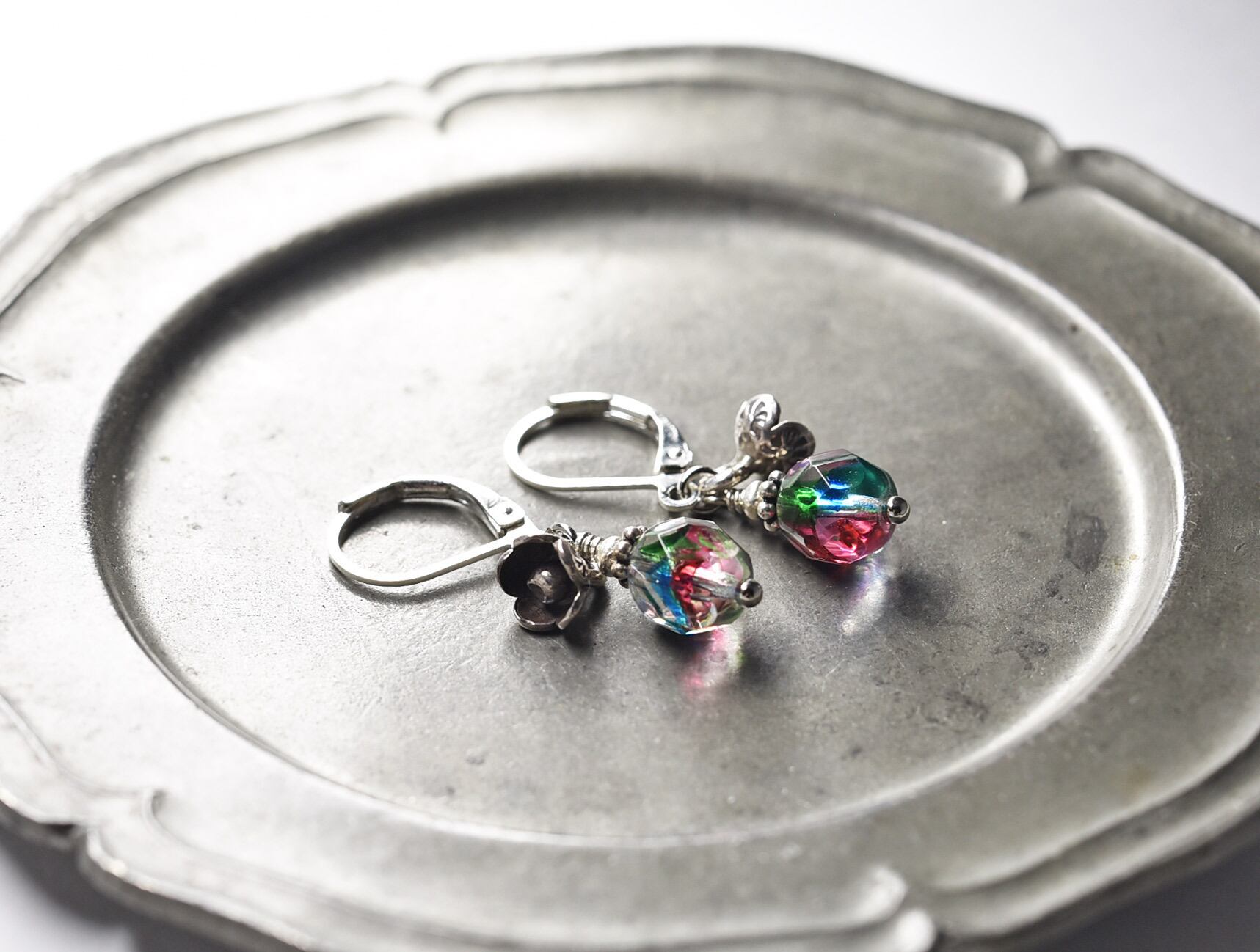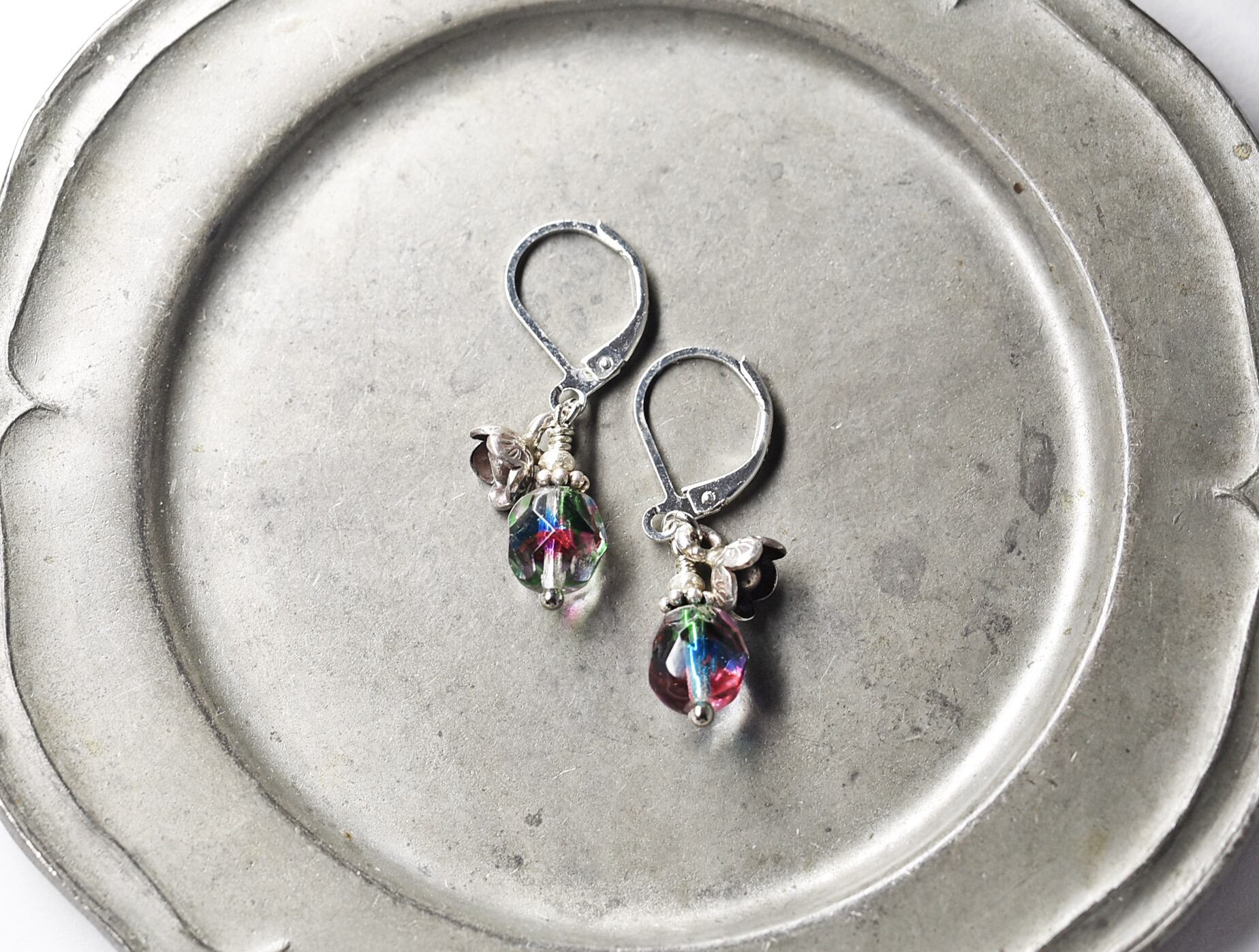 ヴィンテージアイリスガラスとカレンシルバーチャームを繋いだピアスです。