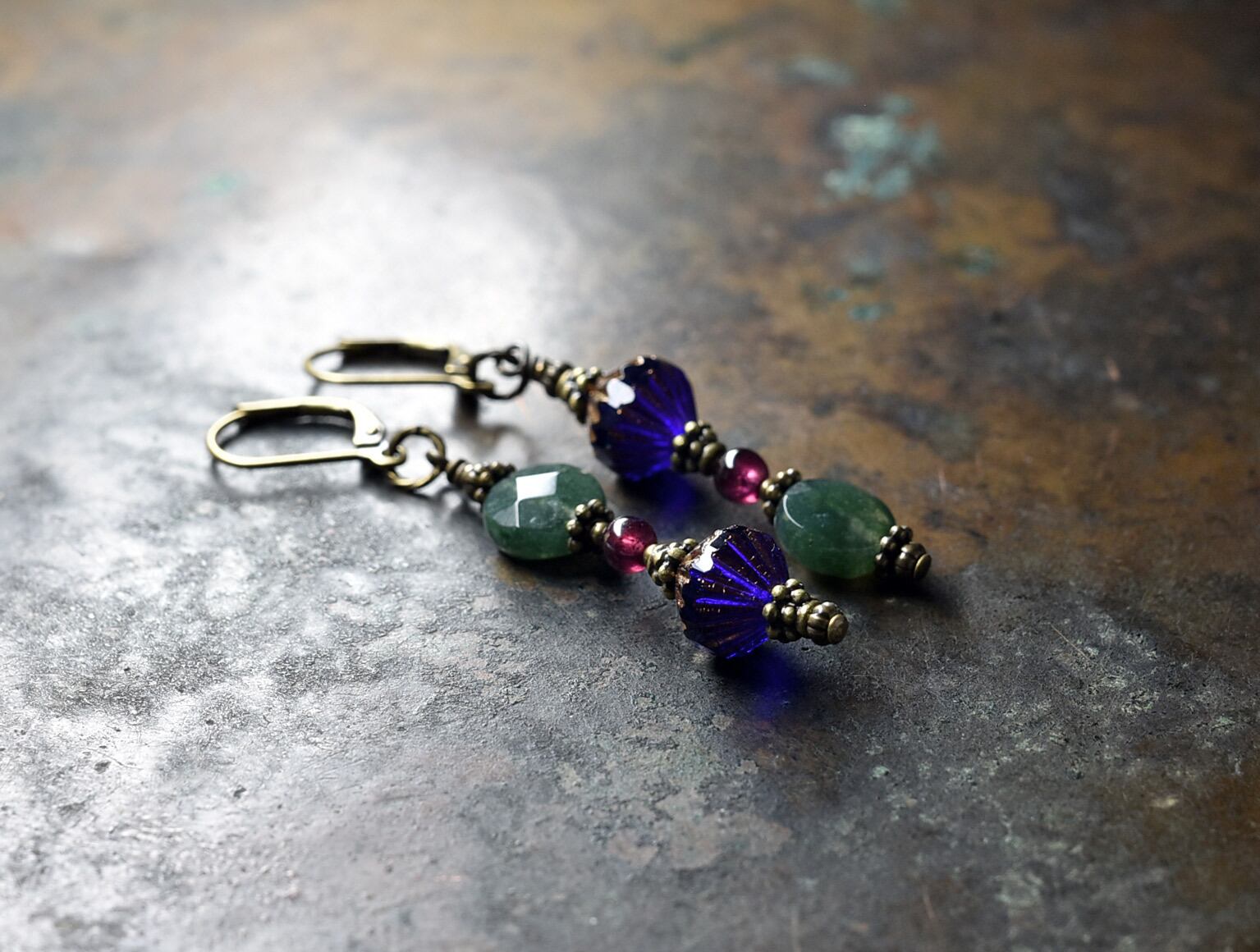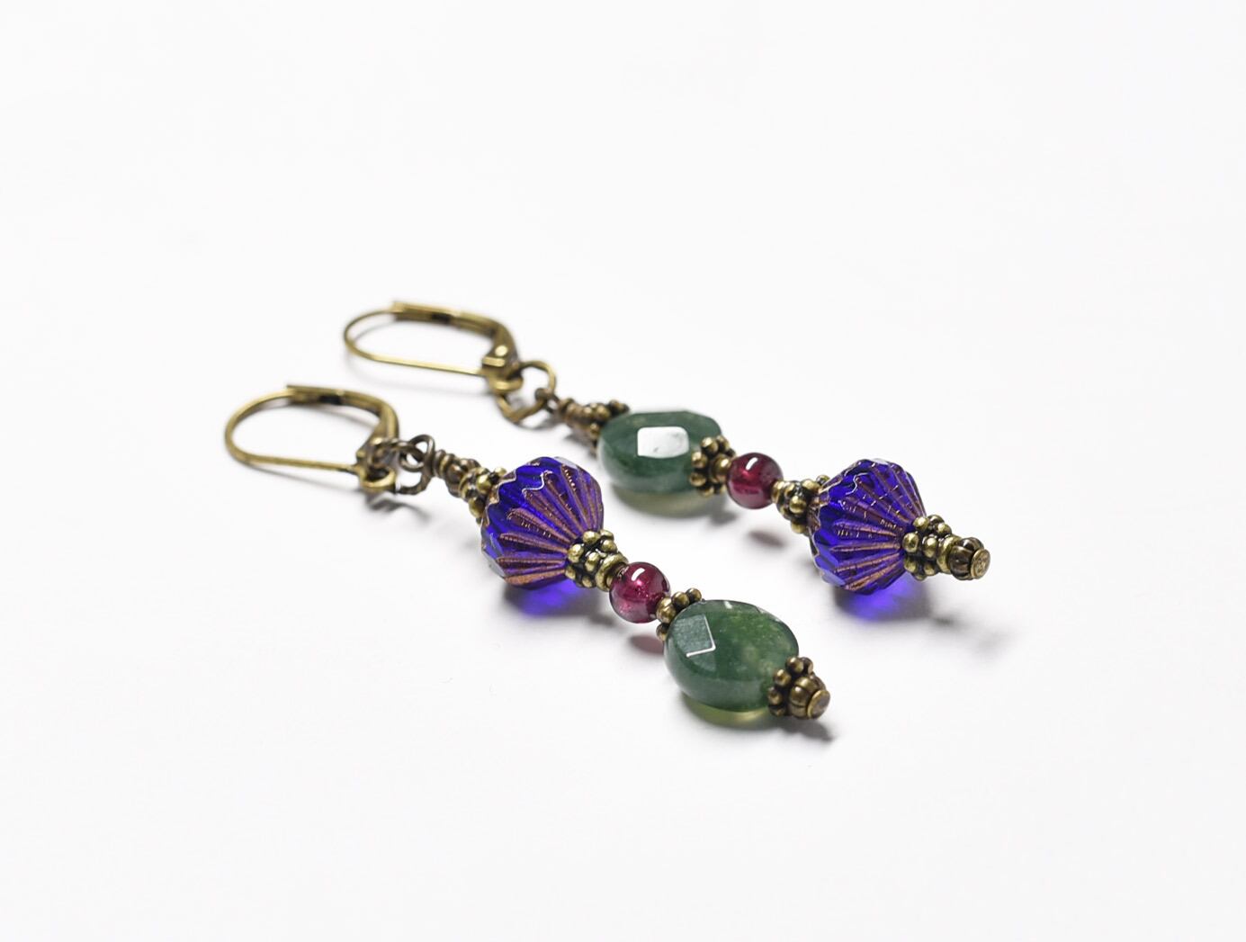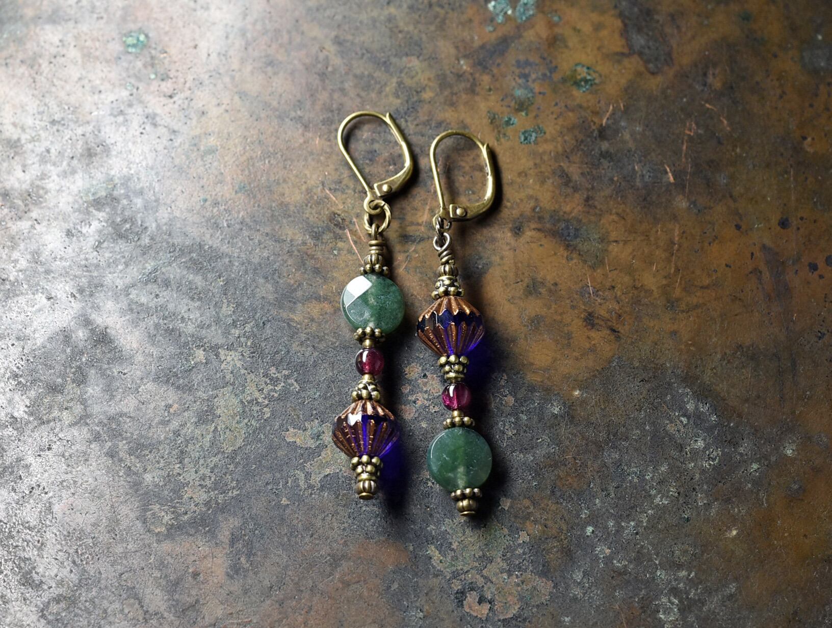 ミッドナイトブルーチェコビーズとインディアンアゲート、ガーネットのアンシメトリーピアス