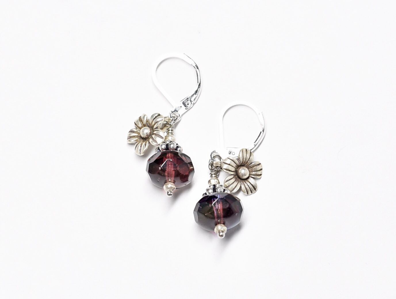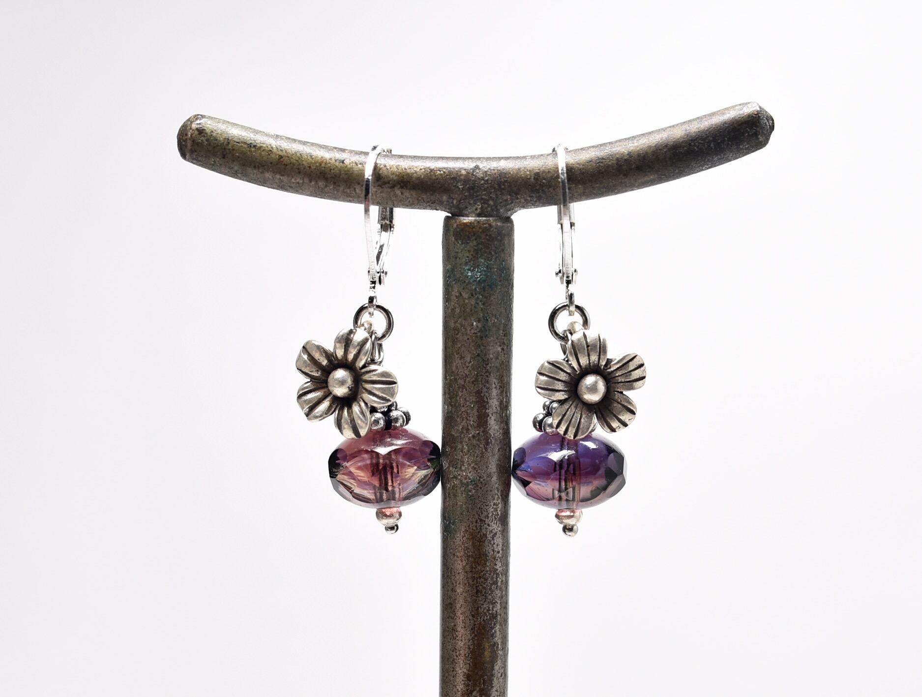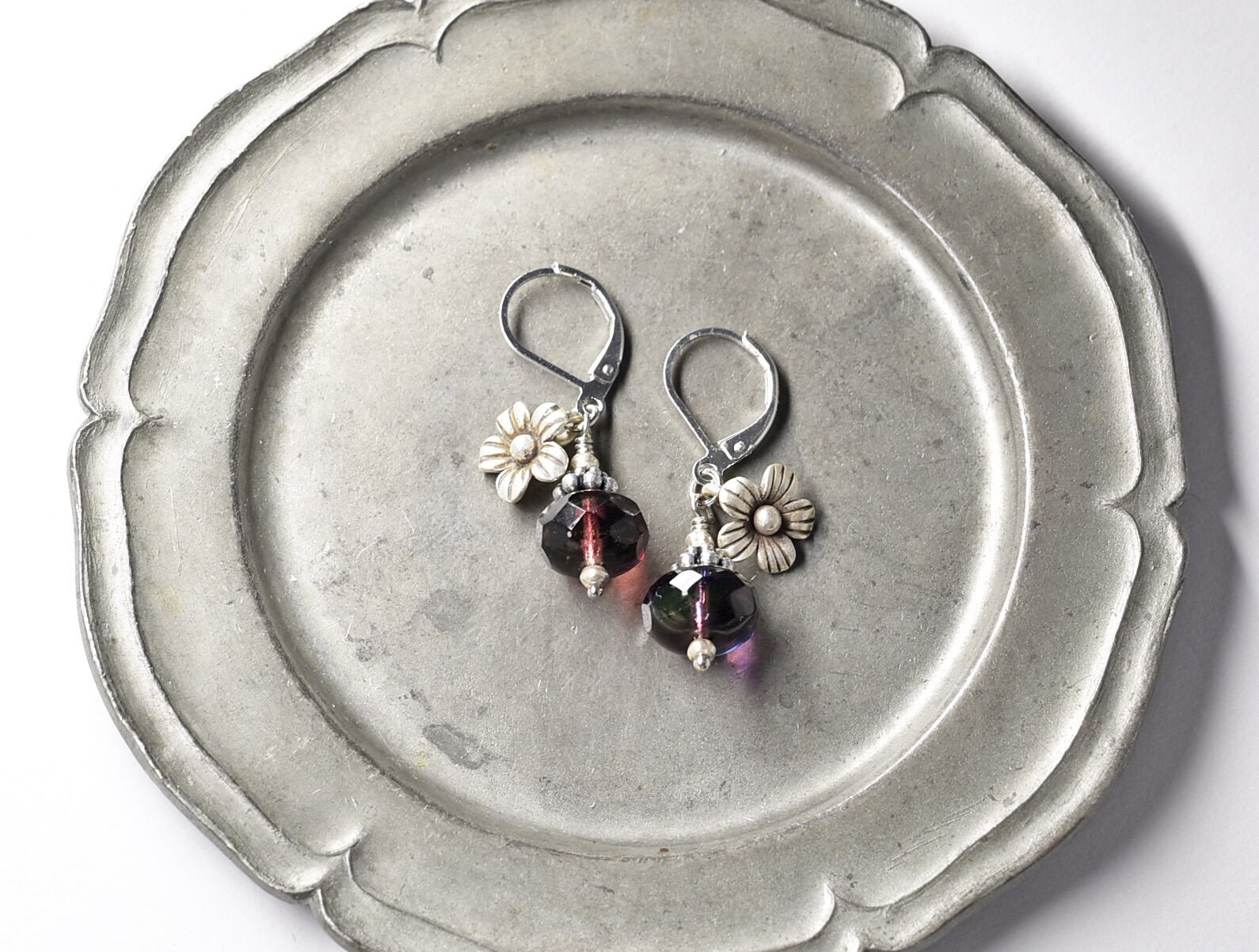 ウランガラスとお花カレンシルバーのピアス(レッドパープル)