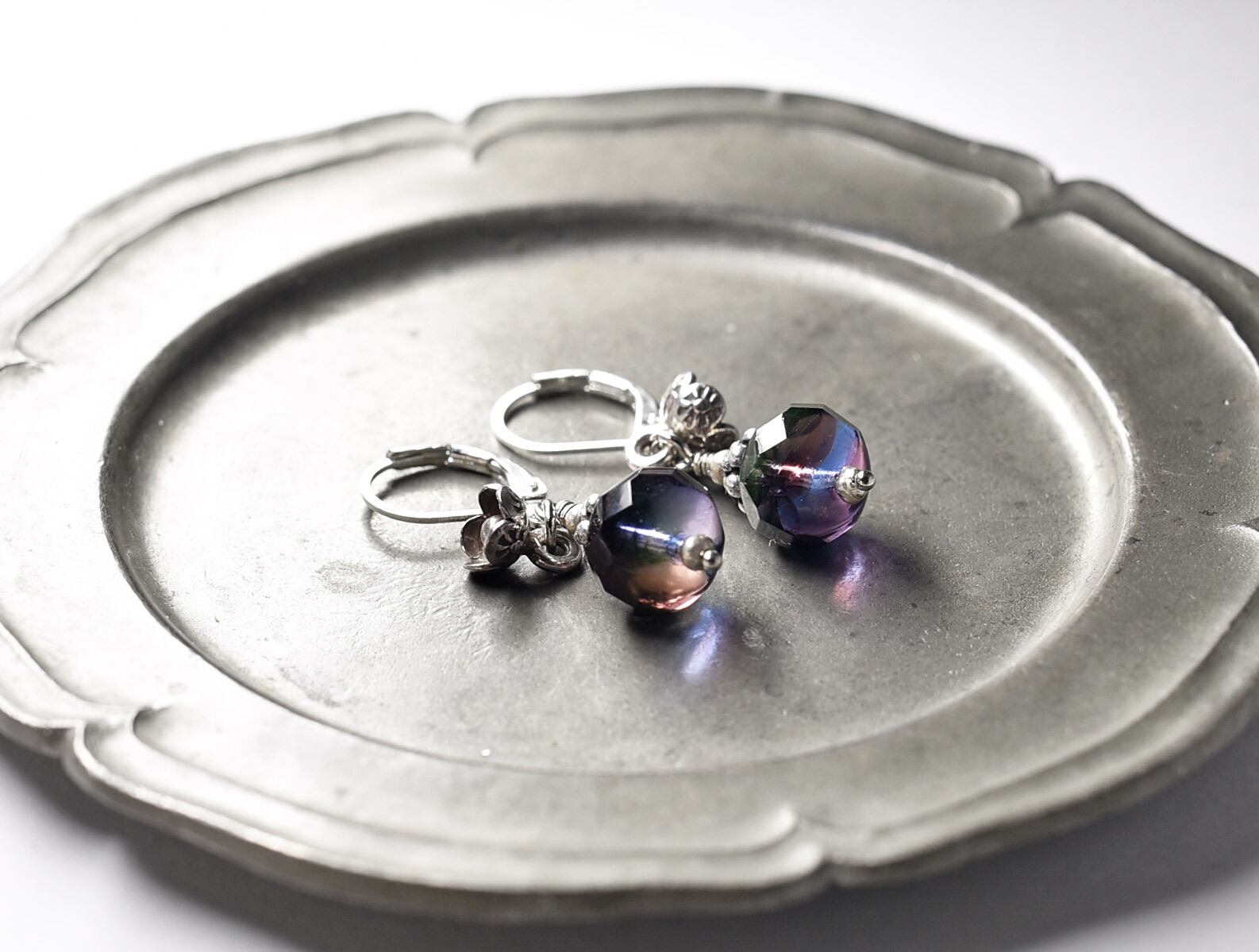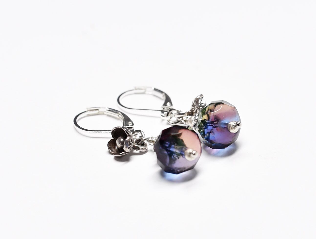 ウランガラスと小さなお花カレンシルバーのピアス(パープル&ブルー)