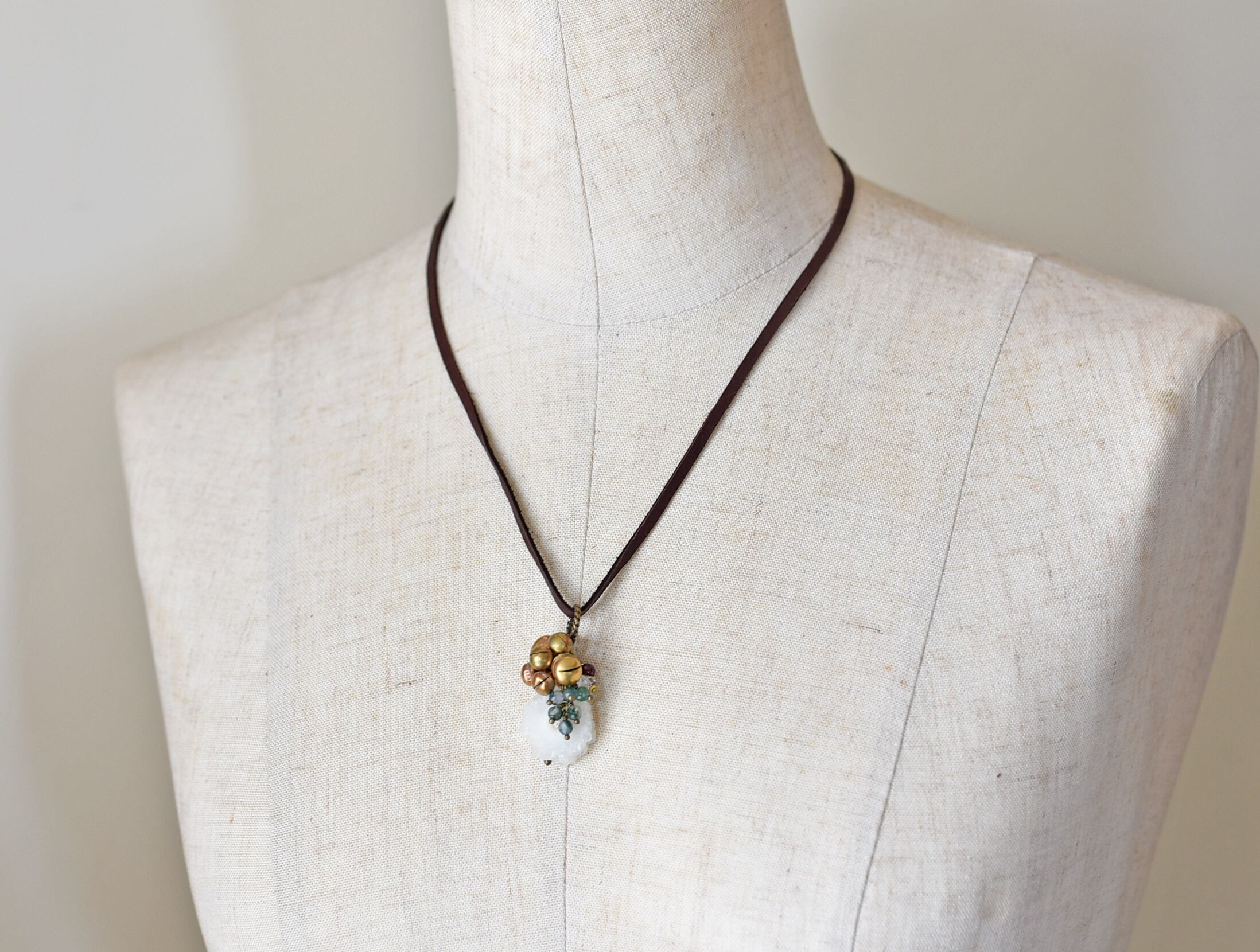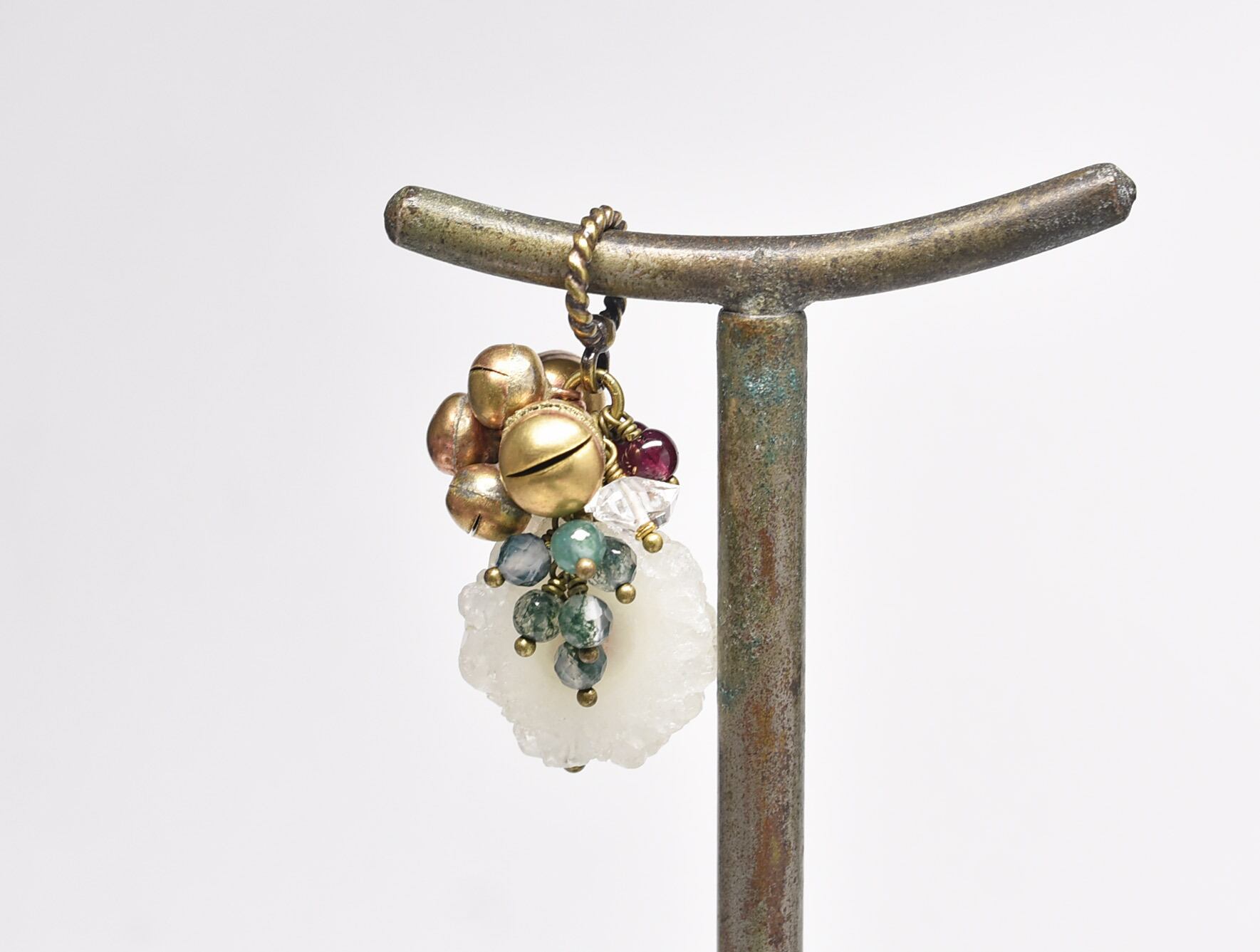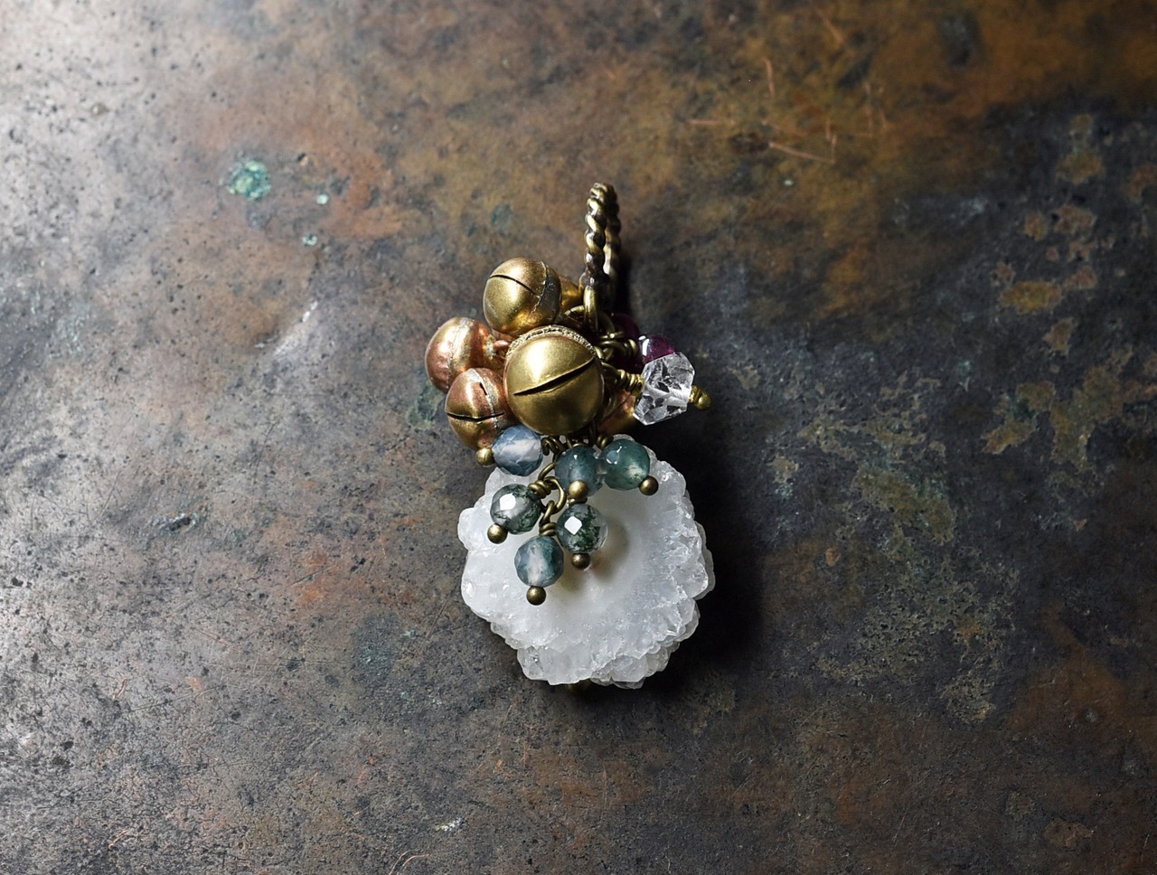 ソーラークォーツとたわわな鈴とモスアゲート、ハーキマーダイヤモンド、ガーネットを繋いだペンダントトップです。