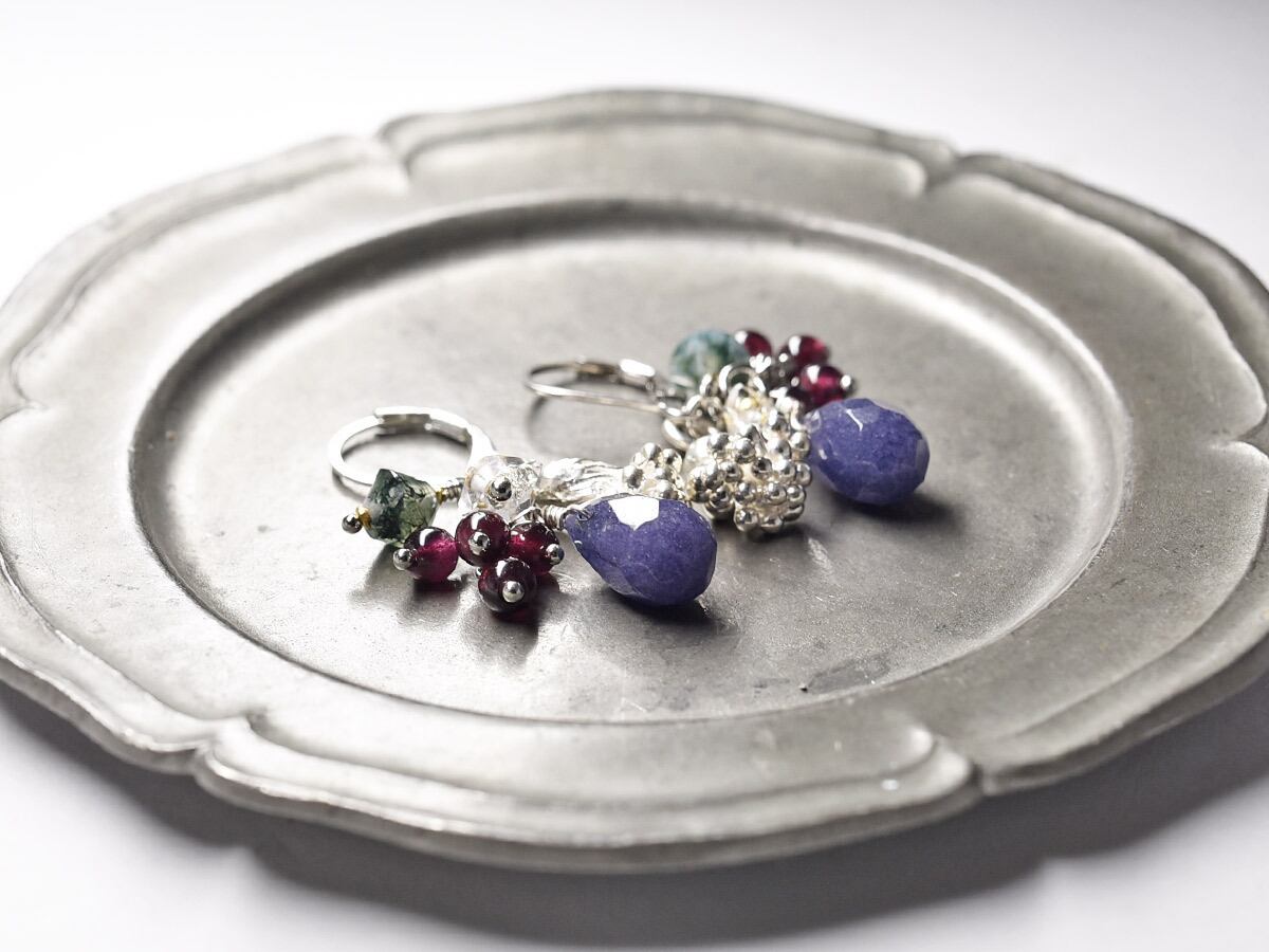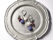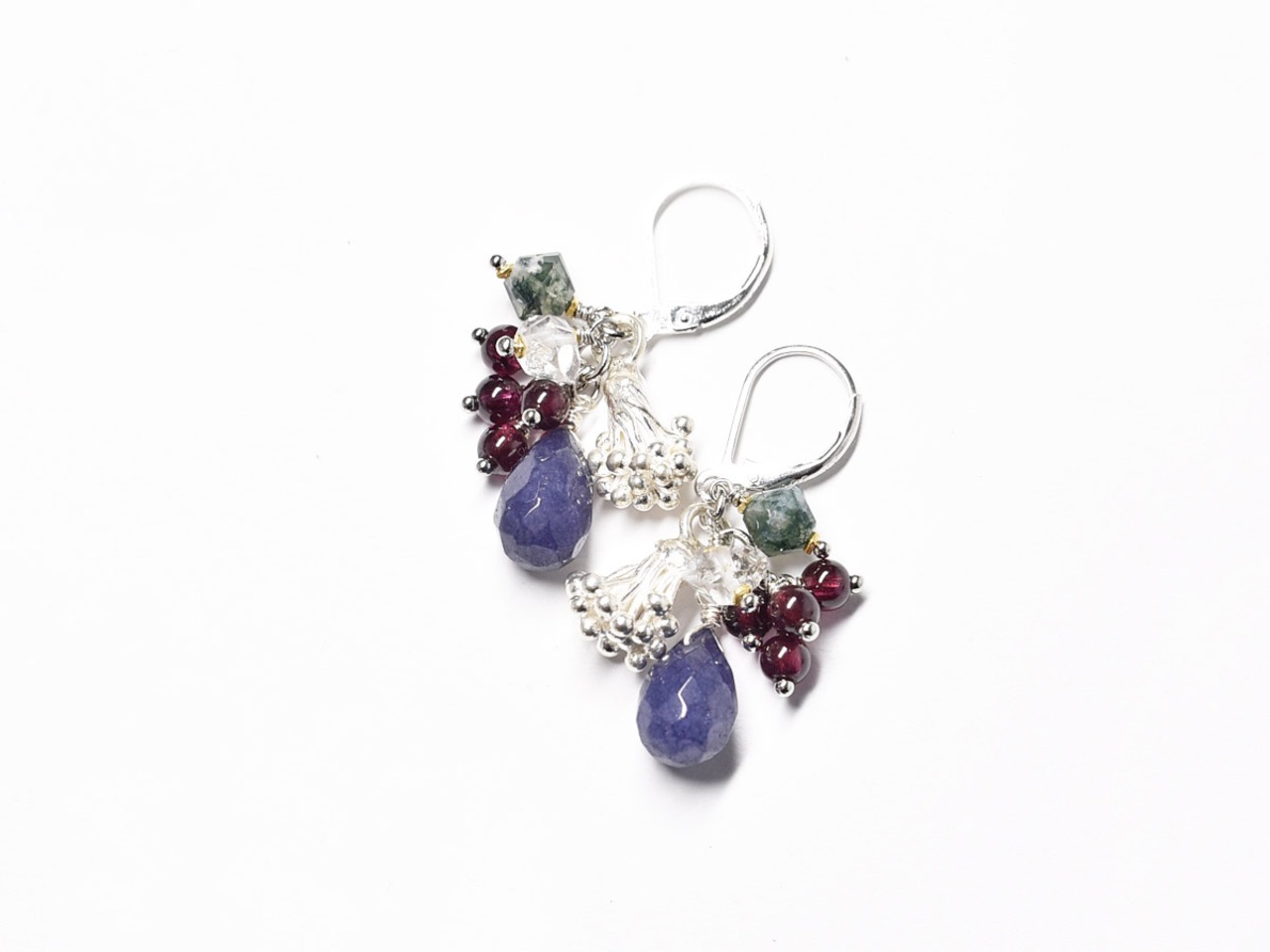 サファイアアゲート、ハーキマーダイヤモンド、ガーネット、モスアゲートと蕾カレンシルバーのピアス(再販)