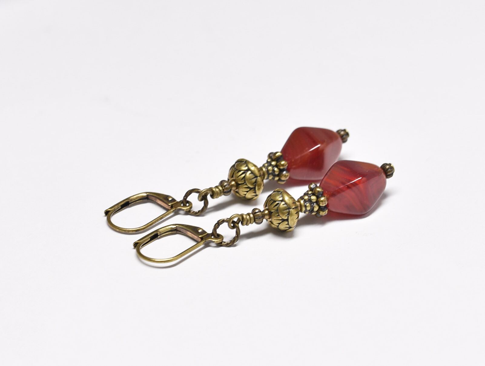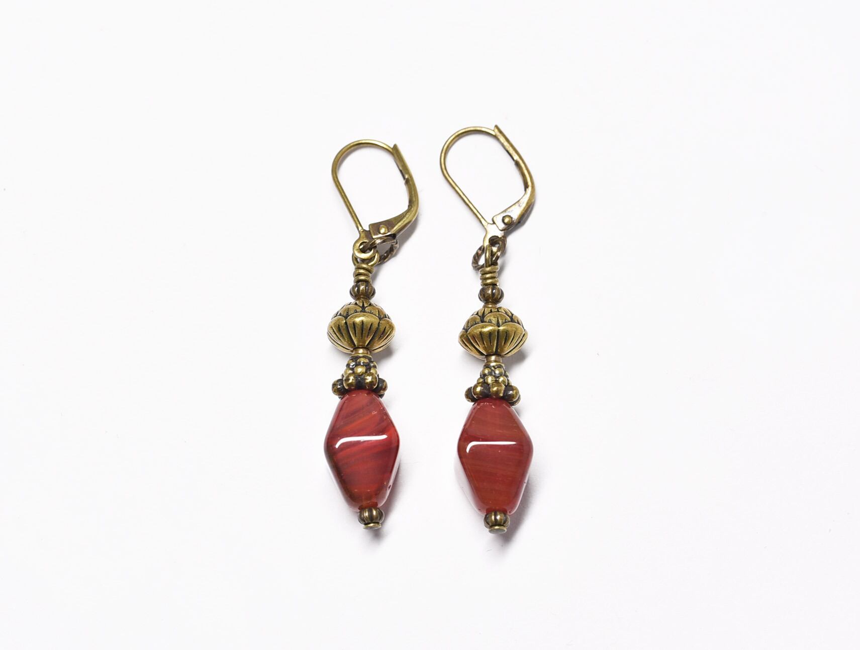 ダークレッドマーブルチェコビーズと蓮華ブラスビーズのピアス