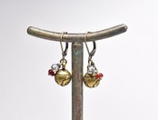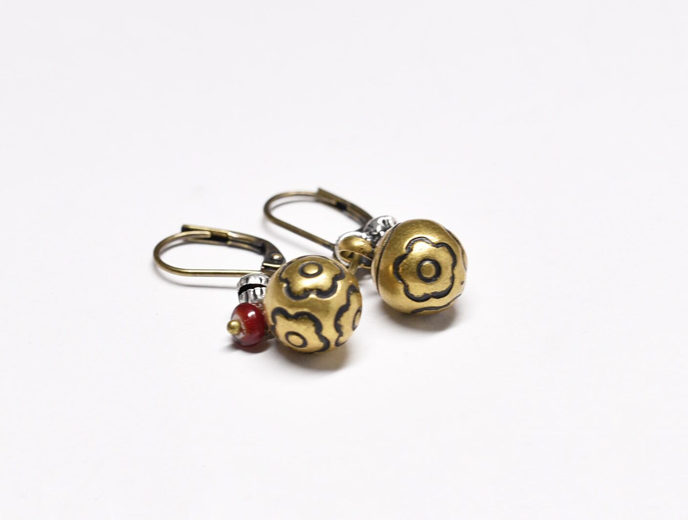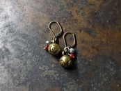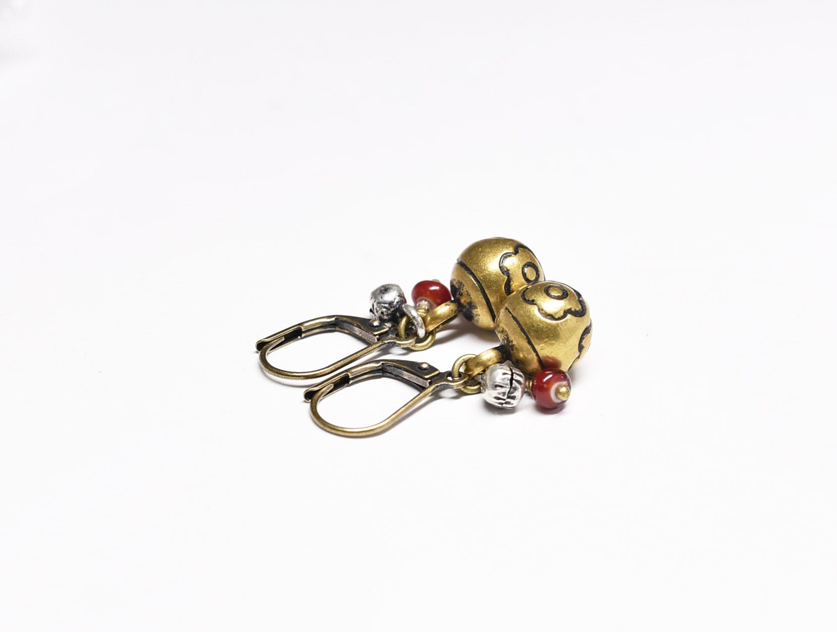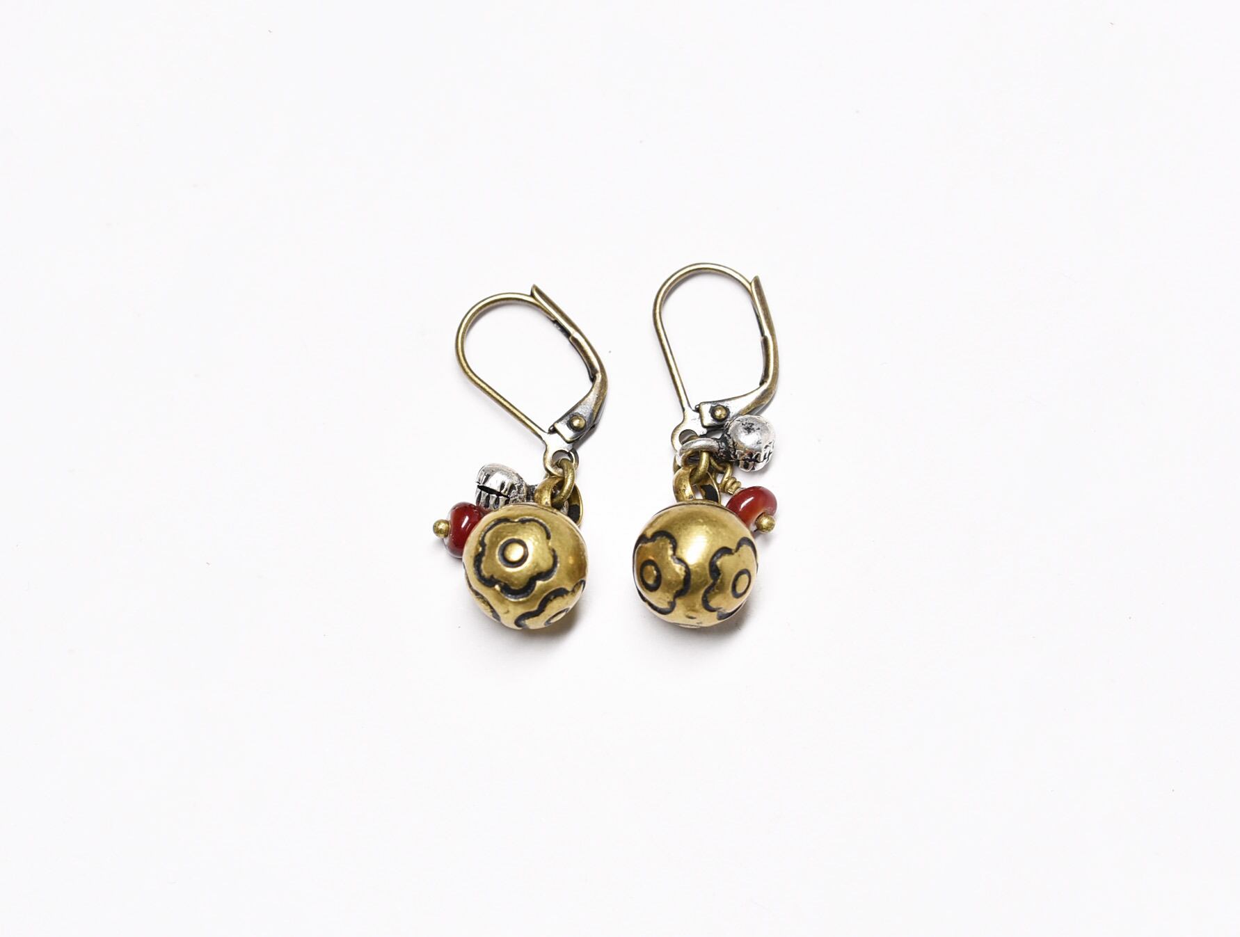 ミャオ族の真鍮ボタンとインドシルバー鈴、濃赤ホワイトハーツを繋いだ小ぶりなピアスです。