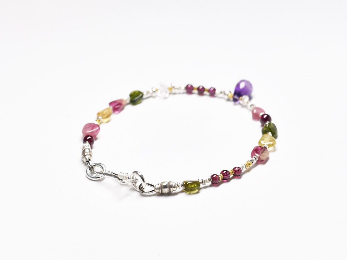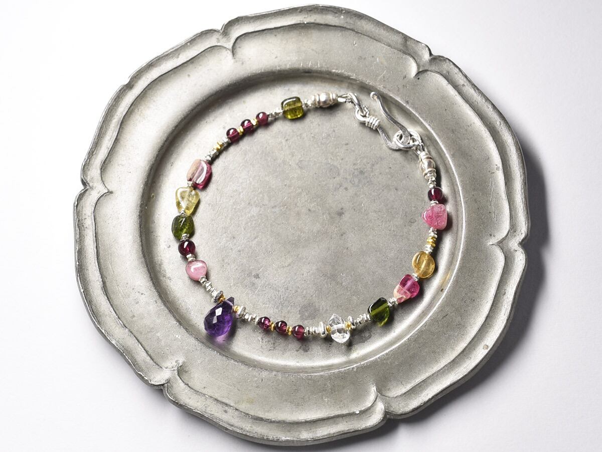 アメジストとトルマリン、ガーネット、ハーキマーダイヤモンドとカレンシルバーを繋いだブレスです。