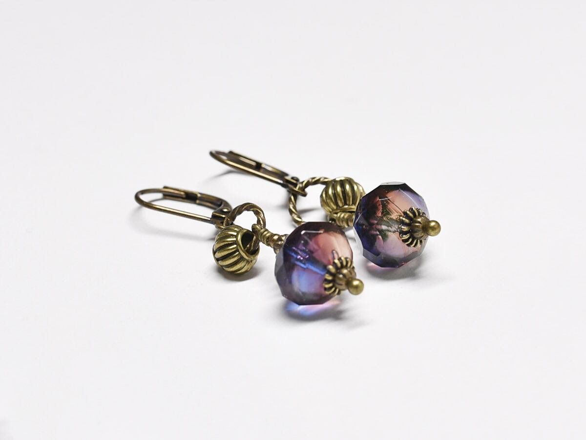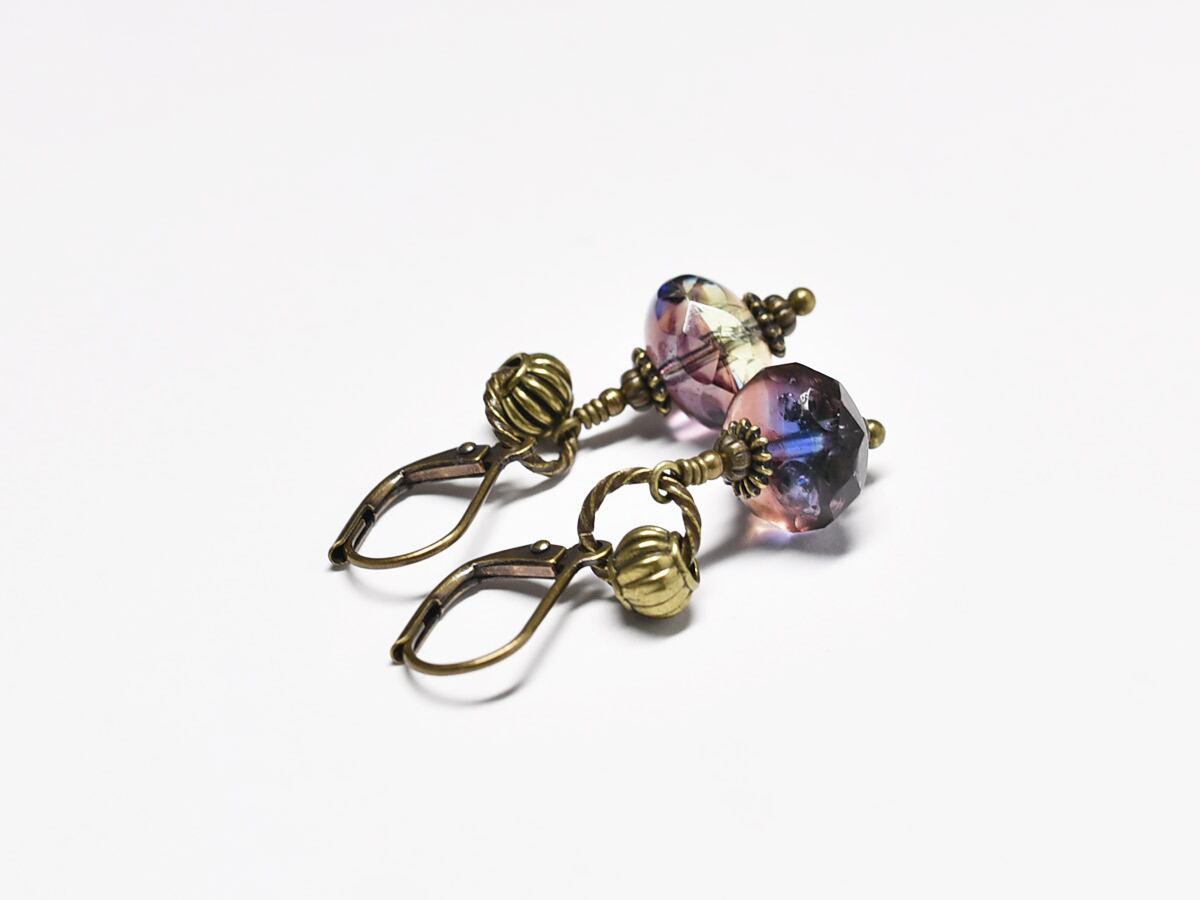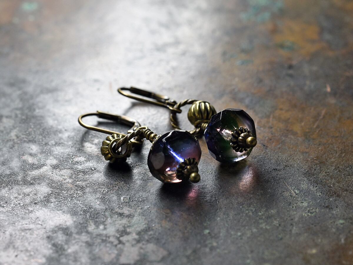多面体が施された数種類の色合いがミックされたビーズはウランガラスです。
