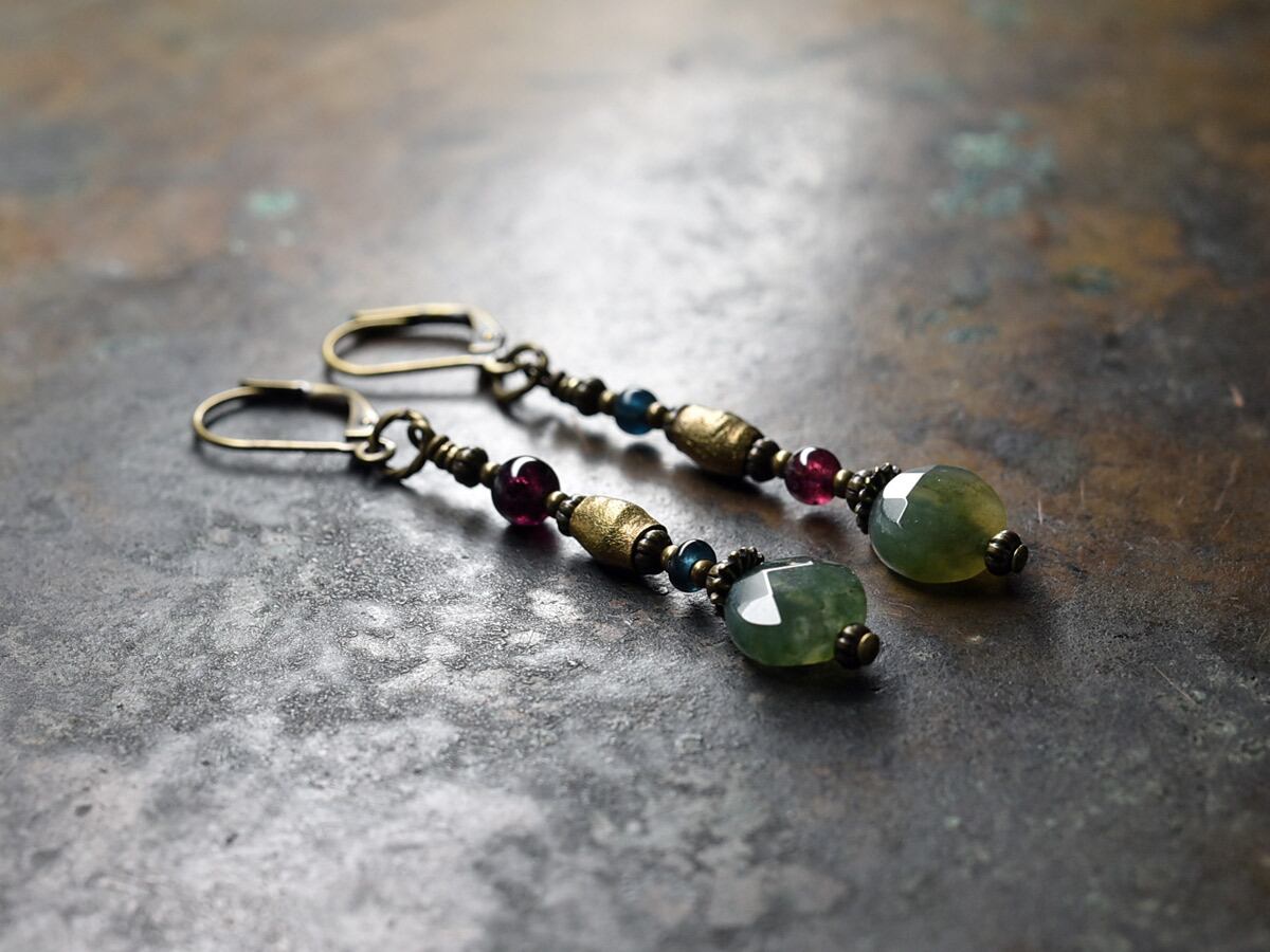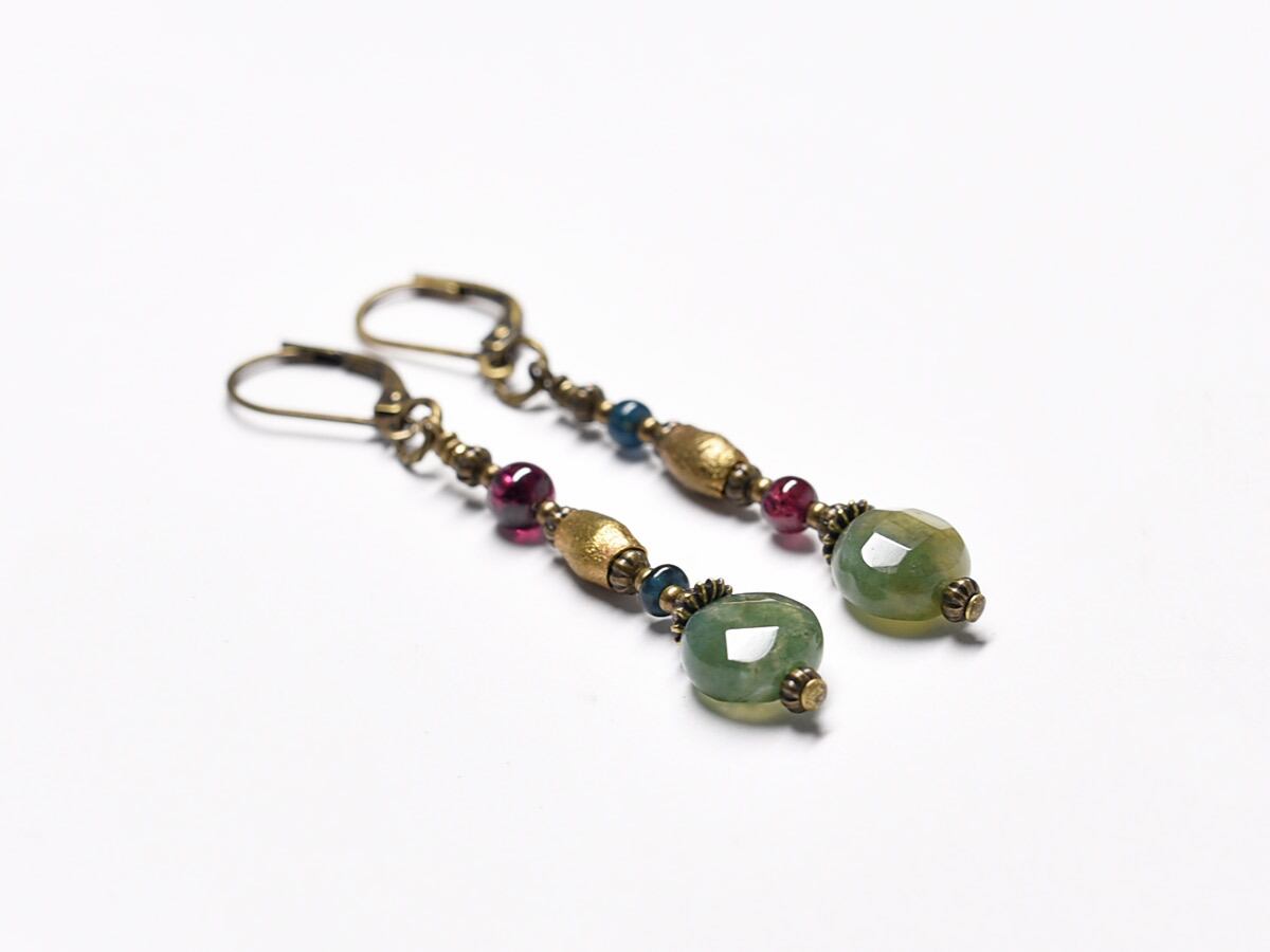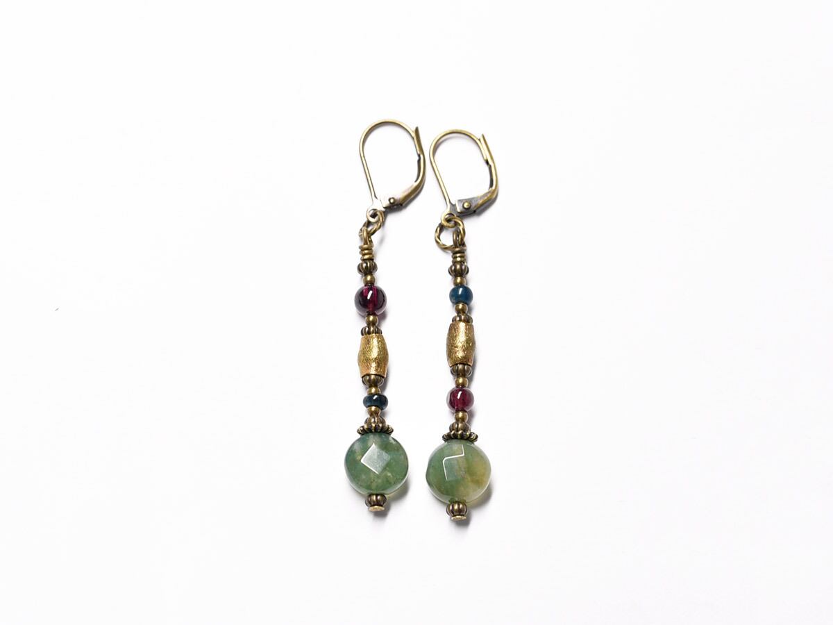インディアンアゲートとアフリカンブラス、ガーネットとインディゴブルービーズを繋いだピアスです。
