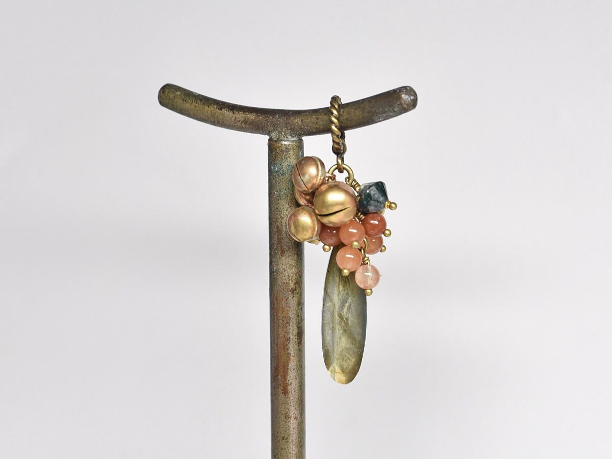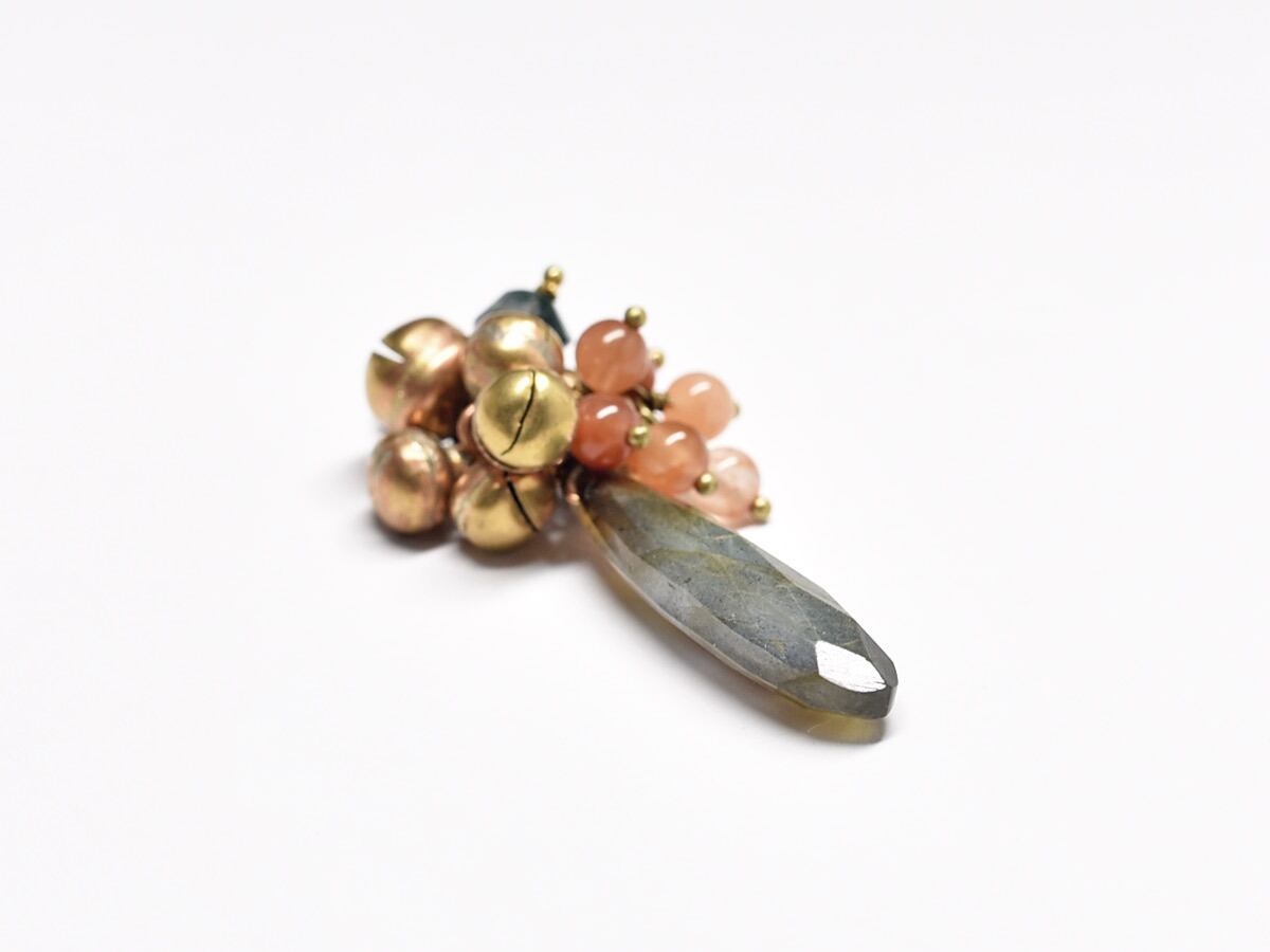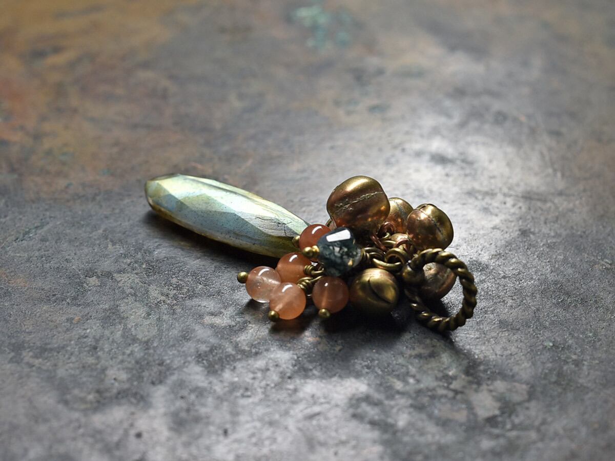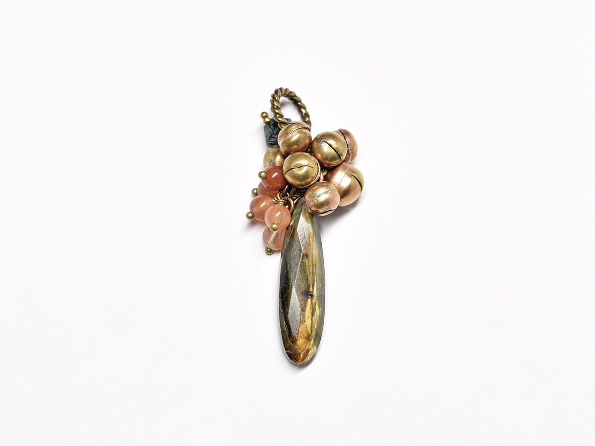 ラブラドライト、たわわな鈴とルチルクォーツ、モスアゲートを繋いだペンダントトップです。