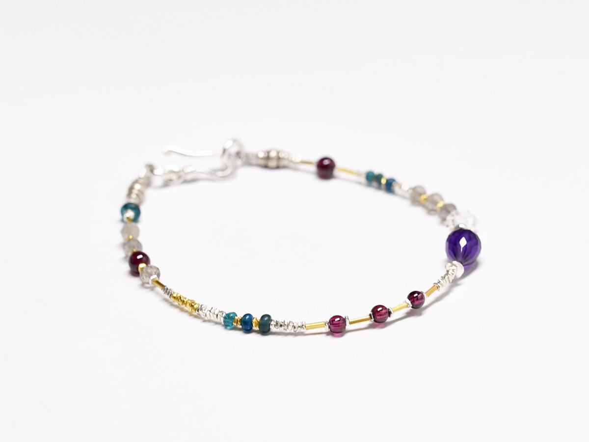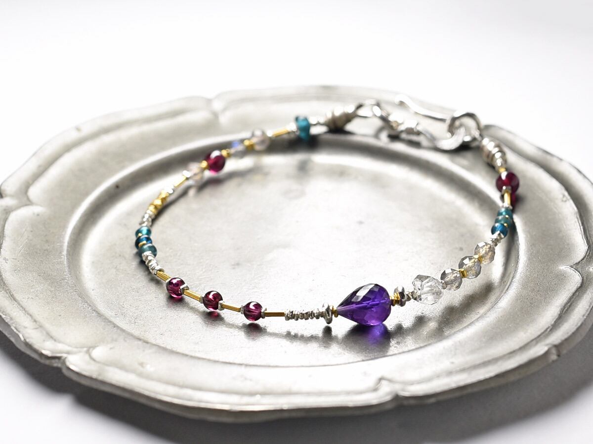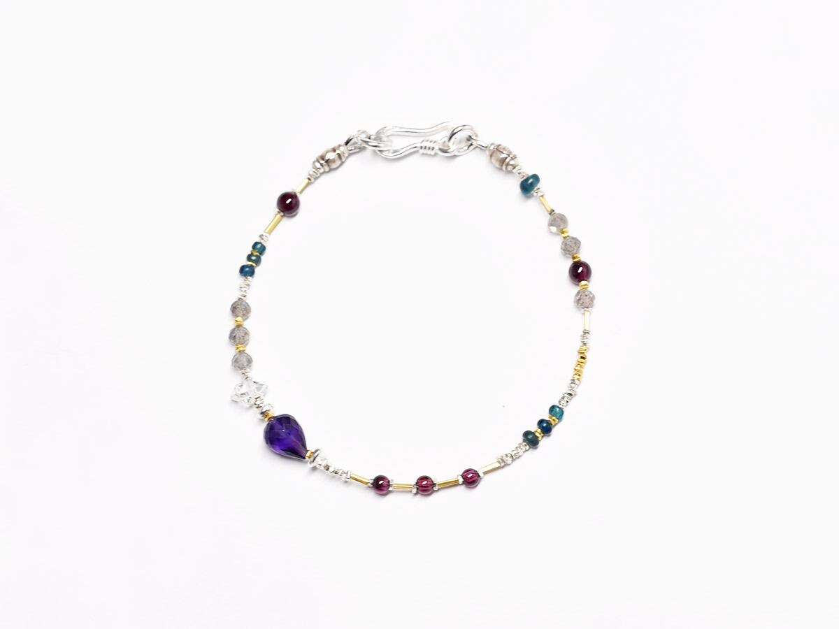 雫アメジストとハーキマーダイヤモンド、ガーネット、ラブラドライト、インディゴブルービーズ、カレンシルバービーズを繋いだブレスです。