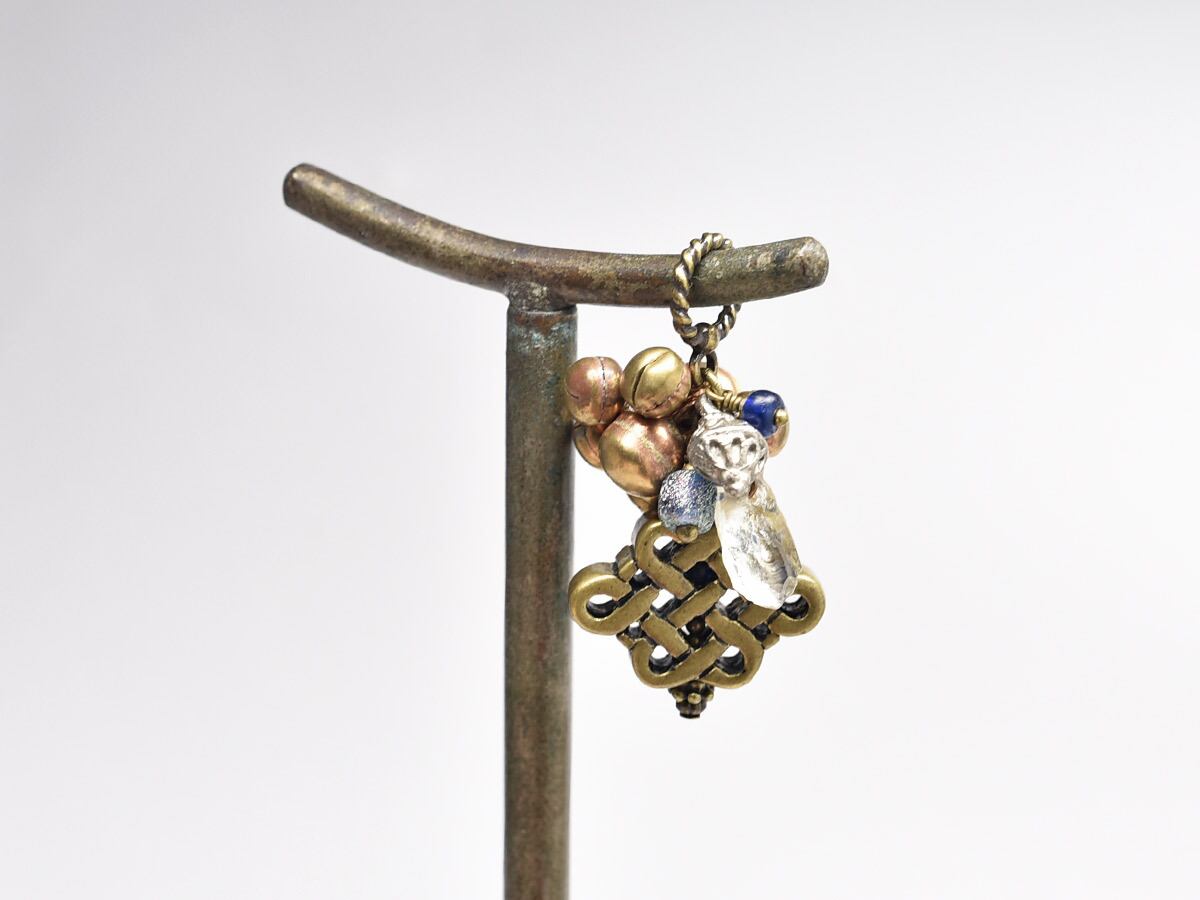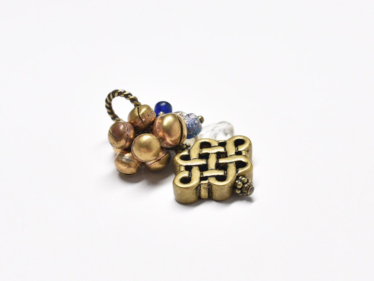 エンドレスノットとターコイズ、古代水晶、銀化ローマングラス、ダークブルーのアンティークビーズ、鈴を繋いだピアスです。