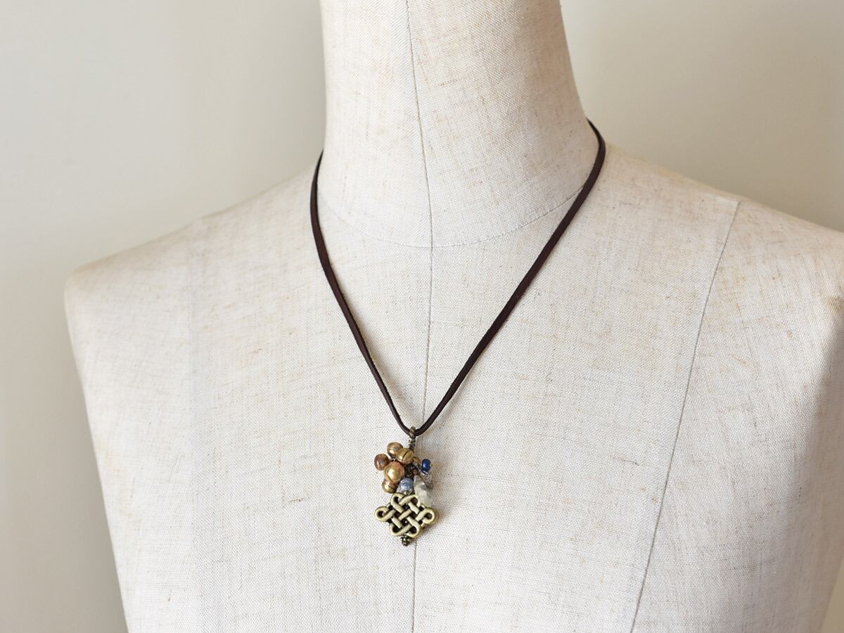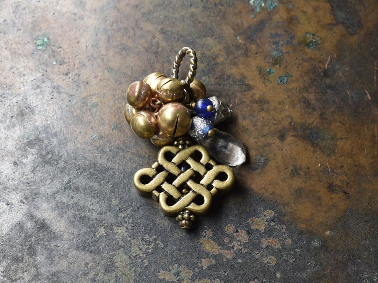 エンドレスノットと古代水晶、銀化ローマングラス、ダークブルービーズとたわわな鈴のペンダントトップ(真鍮)