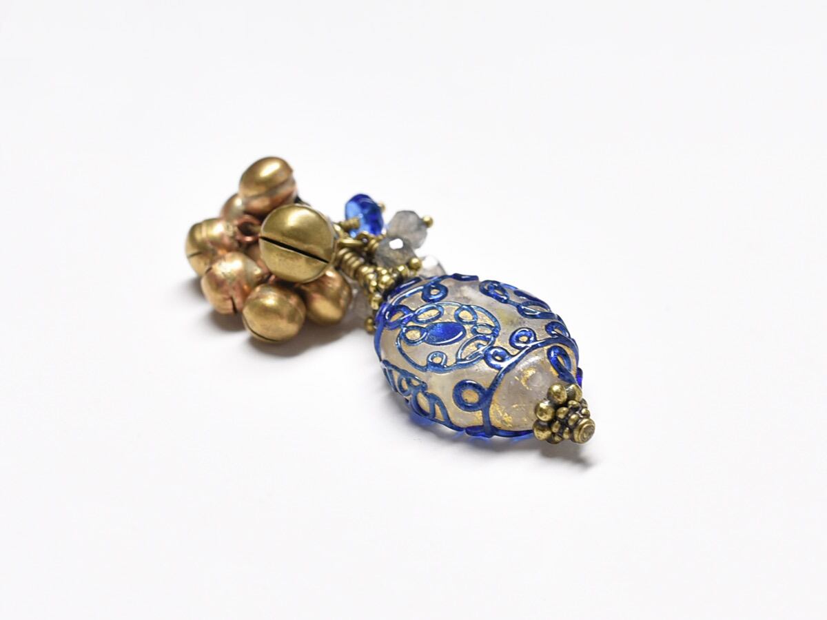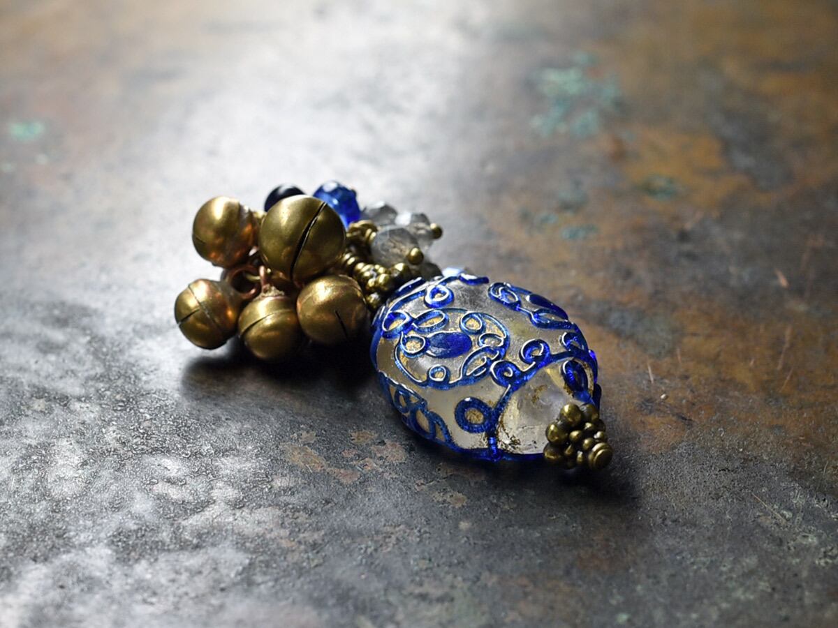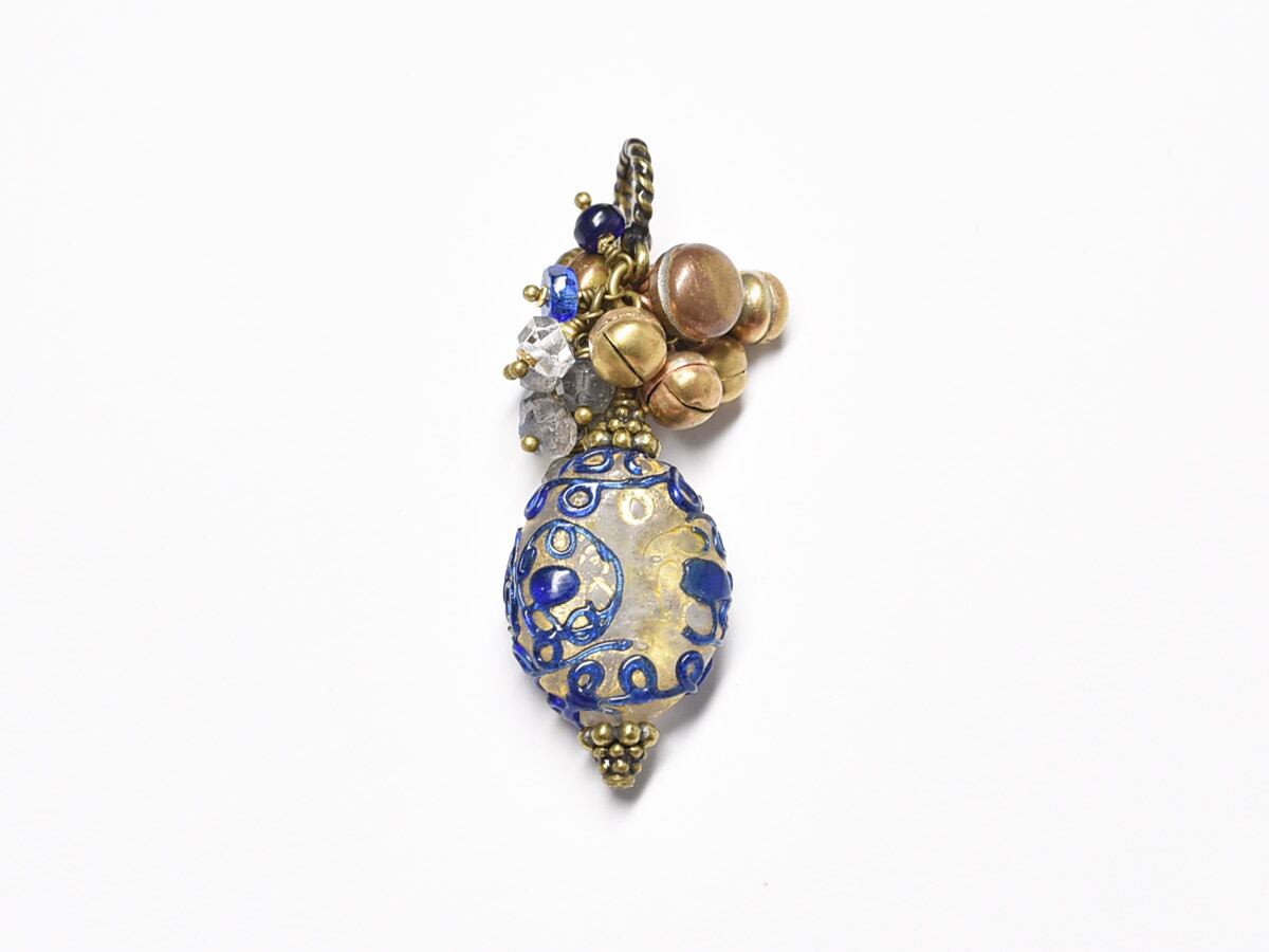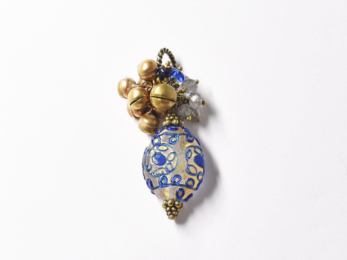 大きなアンティーク瑠璃色トレイルデコレーションの金箔装飾ビーズとたわわなラブラドライトと鈴、ハーキマーダイヤモンドのペンダントトップ