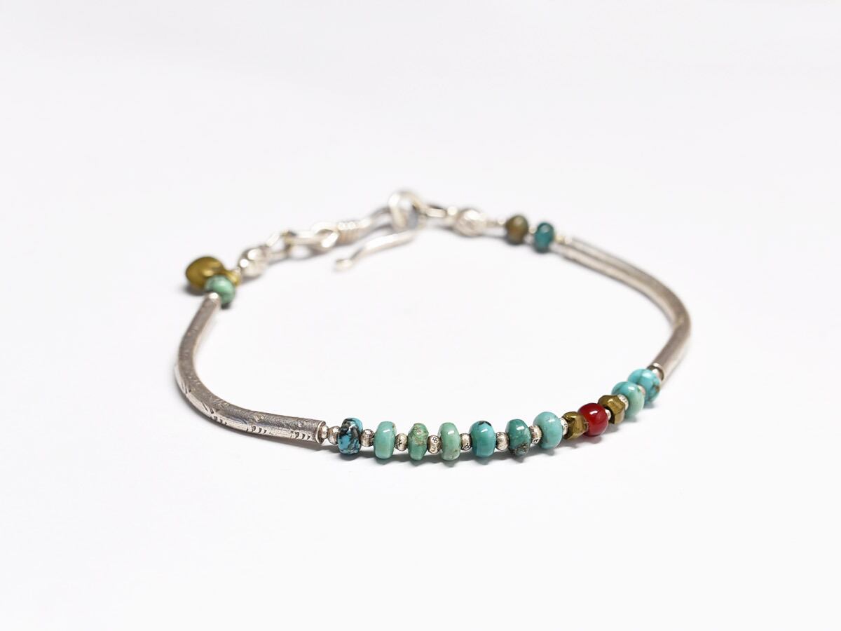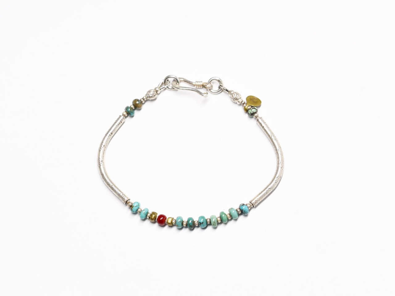 湾曲したカレンシルバーとターコイズ、濃赤ホワイトハーツ、oldオリッサブラスを繋いだ華奢なブレスです。