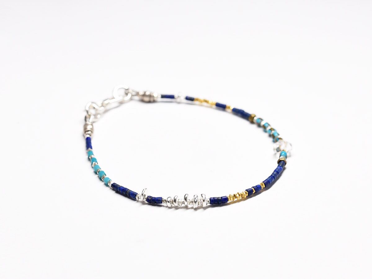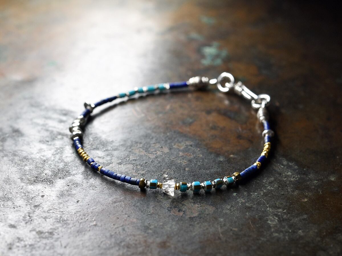 ハーキマーダイヤモンド、2種類のターコイズブルーホワイトハーツとラピス、小さなカレンシルバービーズを繋いだ華奢なブレスです。