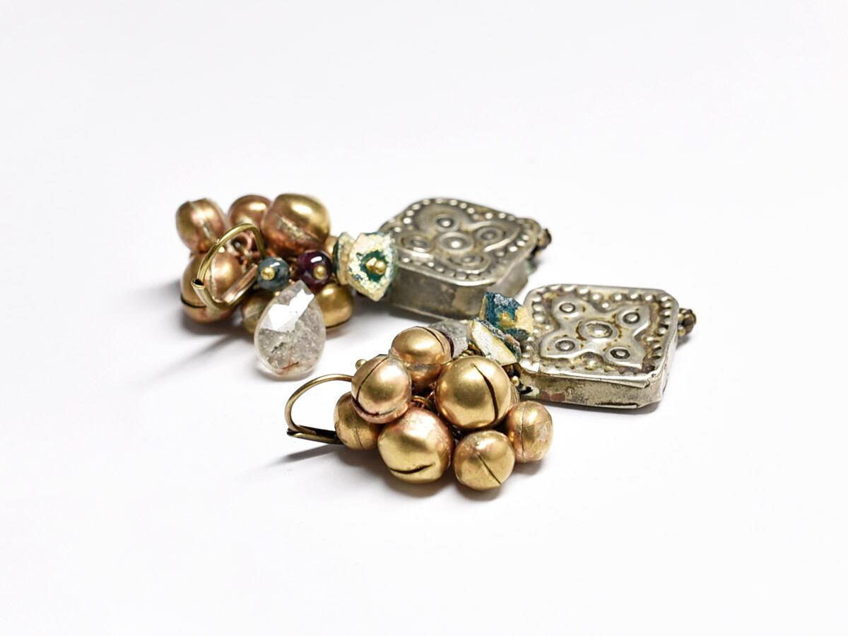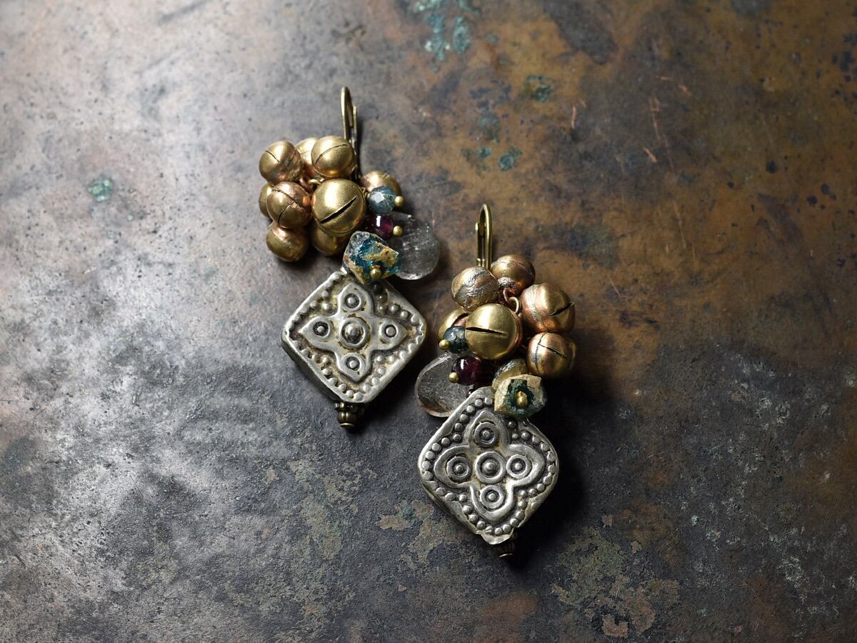 遠くの国、時代を経てやってきた古いパーツを楽しめるボリュームのあるピアスです。