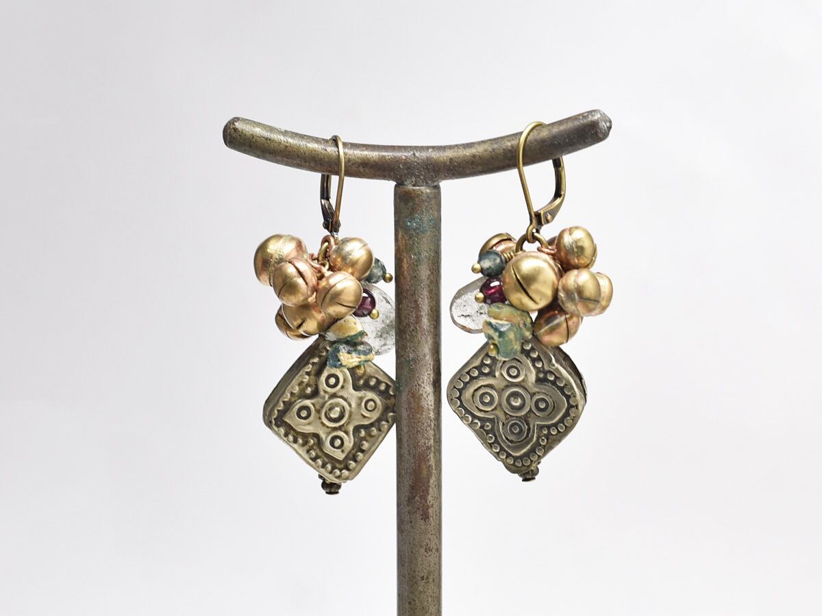 イエメンのoldパーツとたわわな鈴、ローマングラスと3種類のストーンビーズを繋いだピアスです。