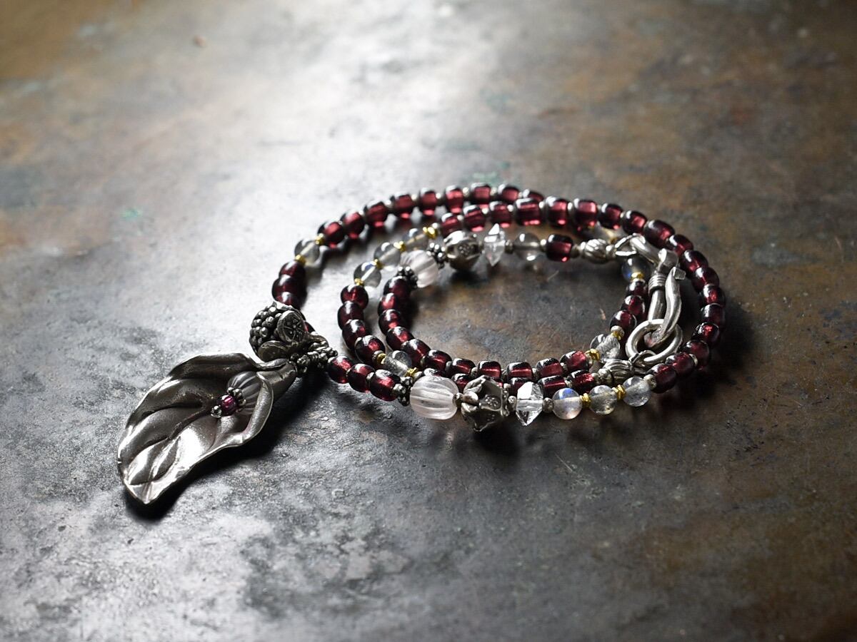 カレンシルバーのトップとパープルアンティークビーズ、グーズベリーとラブラドライト、ハーキマーダイヤモンドを繋いだネックレスです。