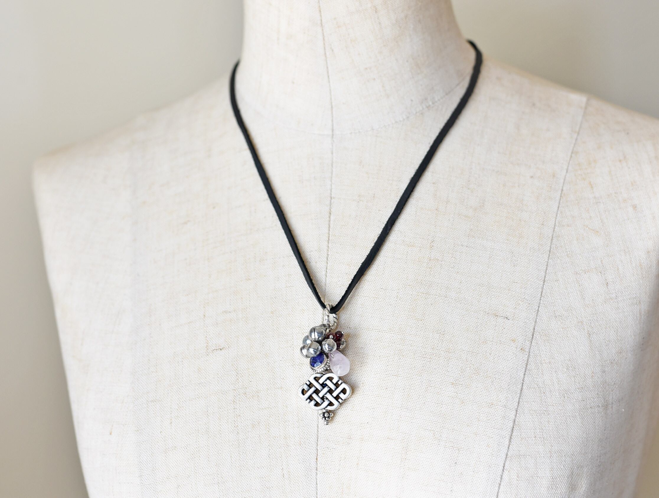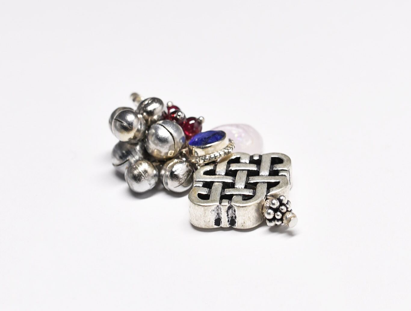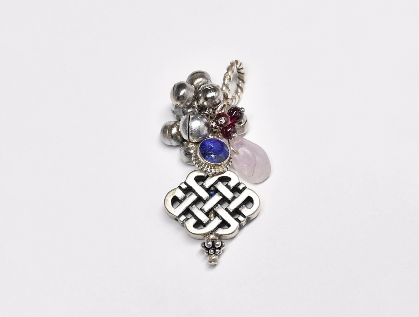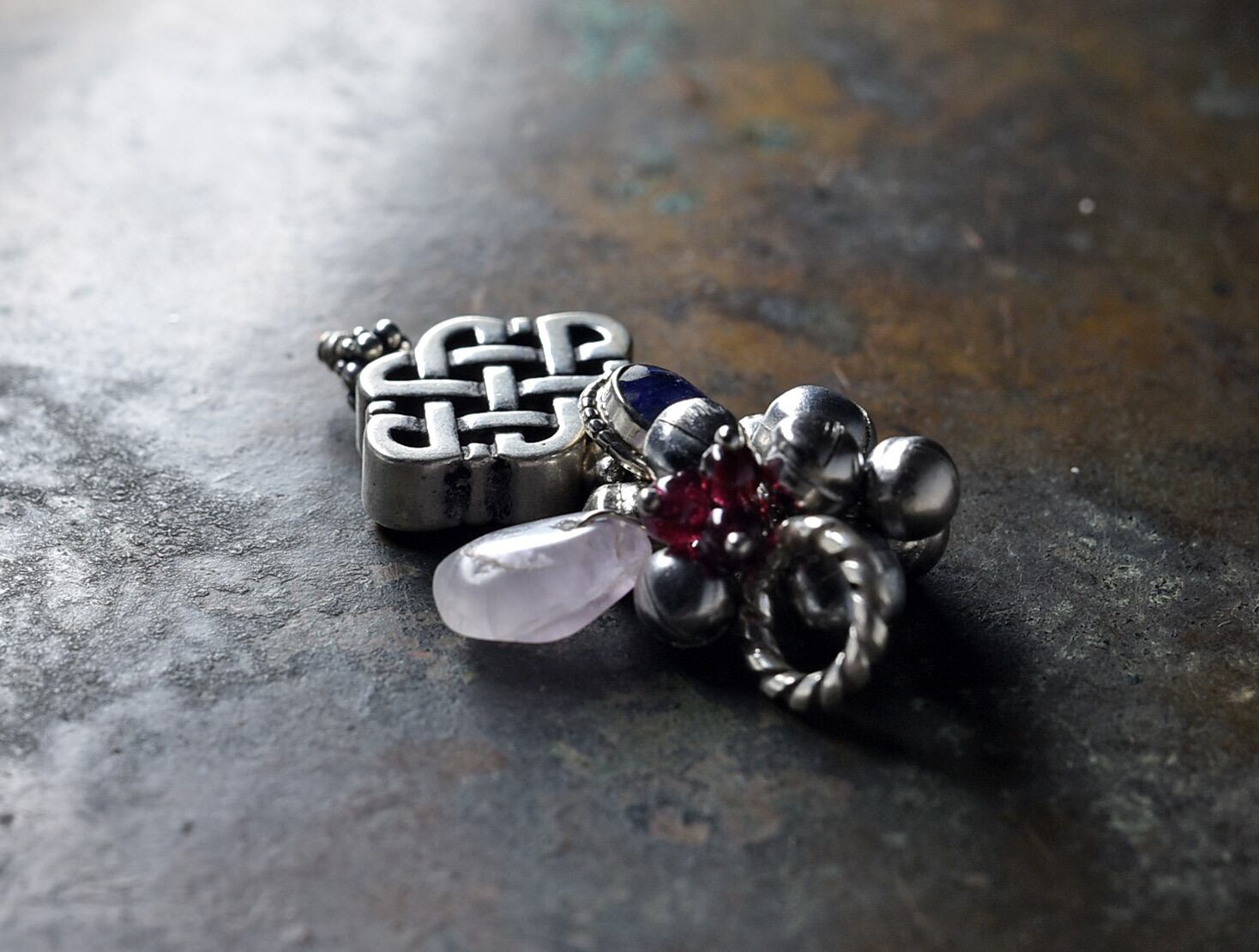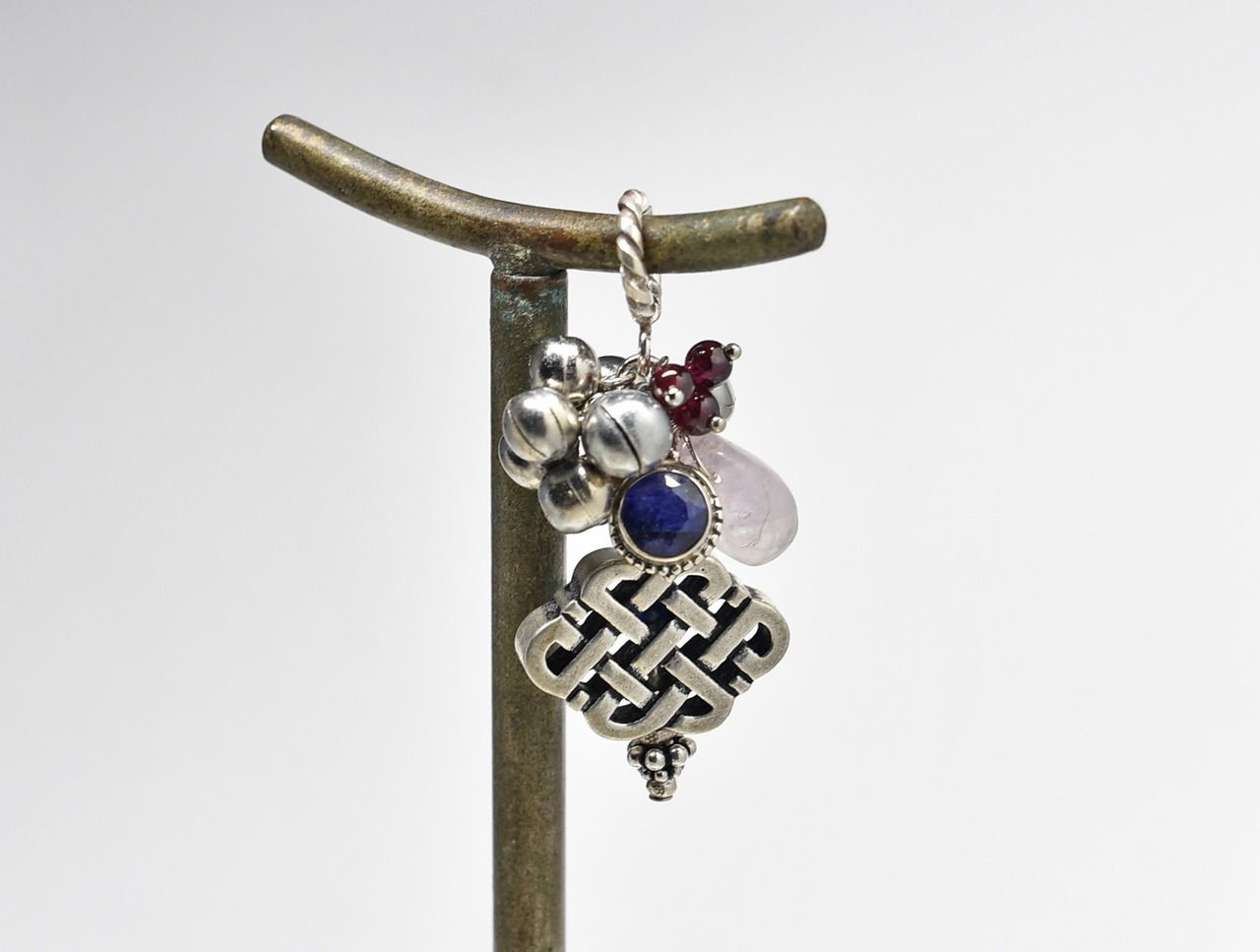 エンドレスノットとシルバー枠サファイアと古代アメジスト、ガーネット、鈴を繋いだペンダントトップです。