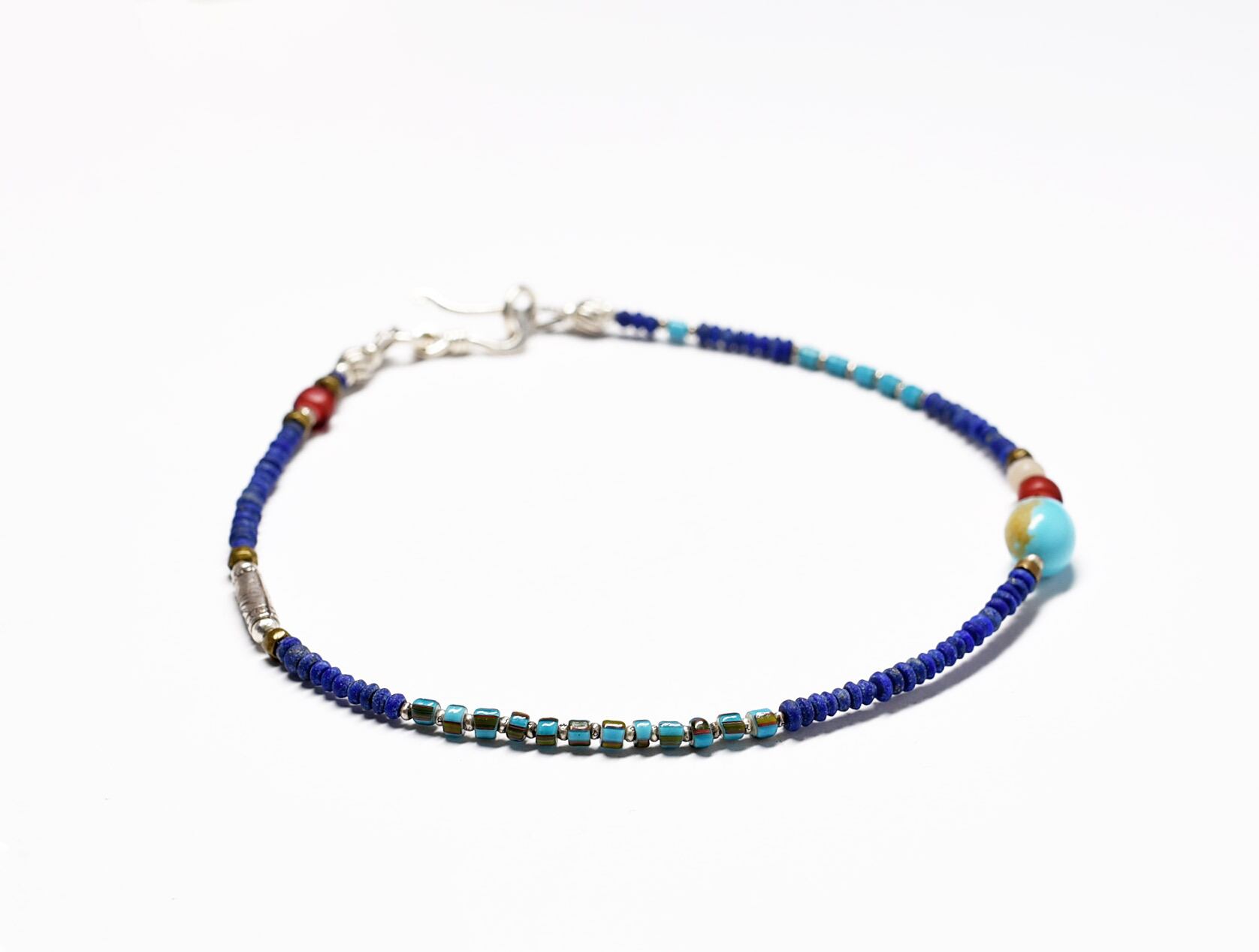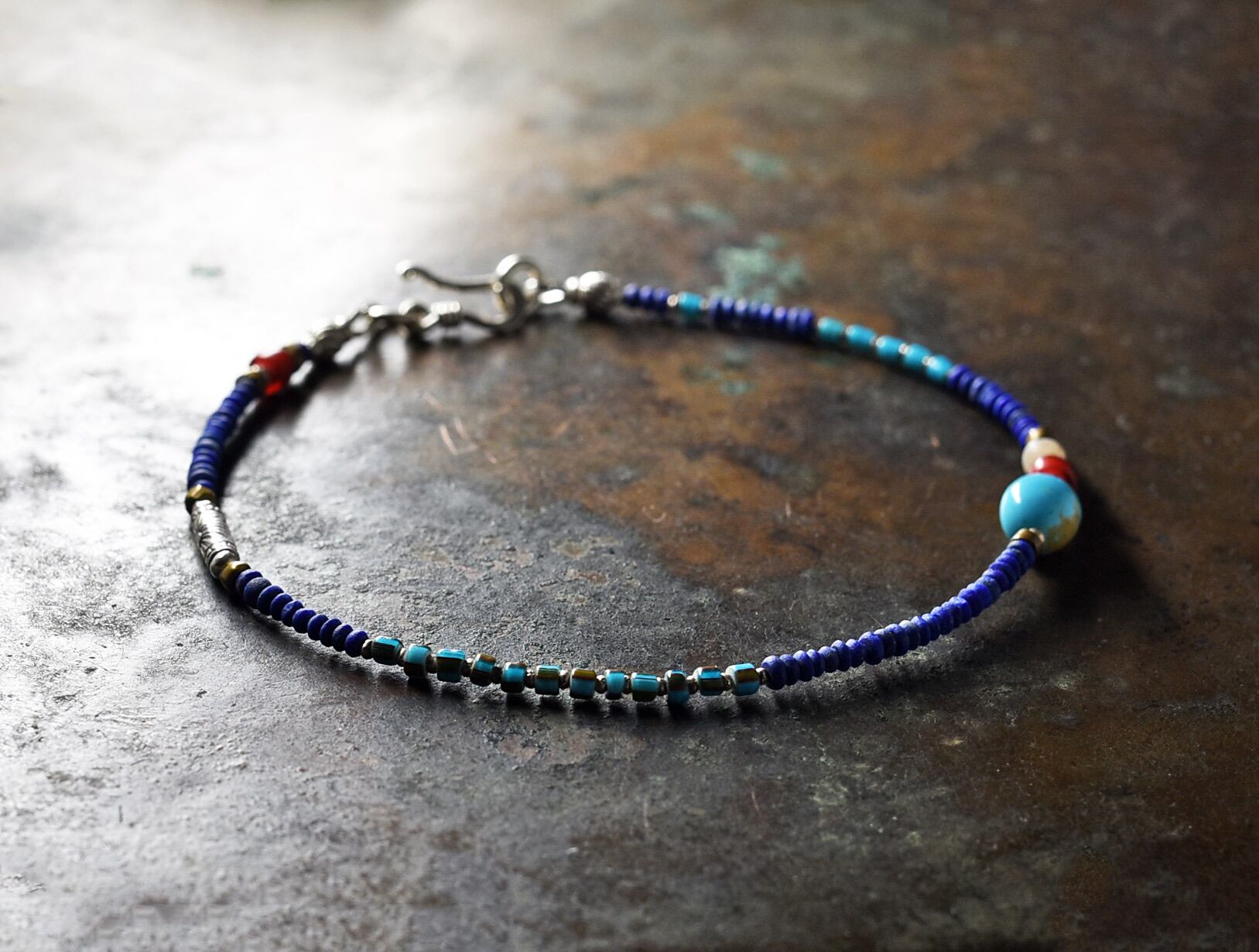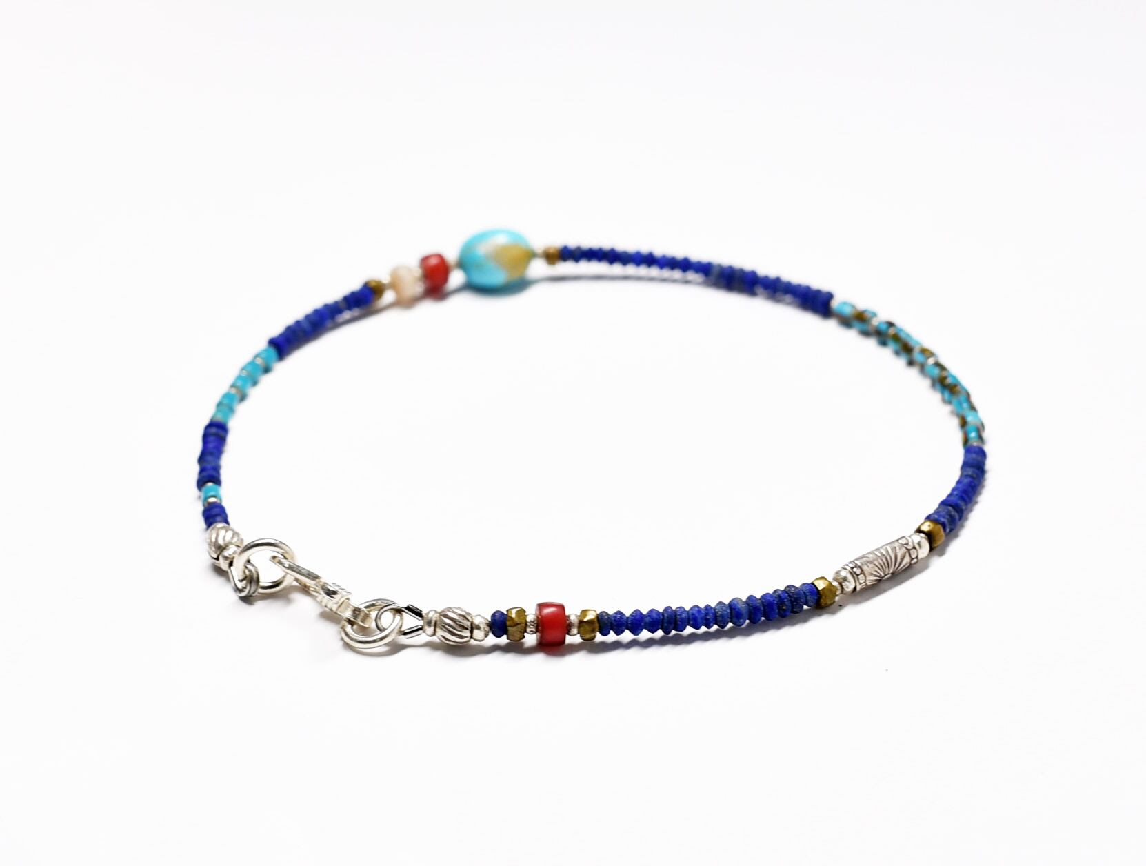 キングマンターコイズと古代瑪瑙、金赤ホワイトハーツ、2種類のターコイズブルーホワイトハーツとラピスoldオリッサブラスを繋いだ華奢なアンクレットです。