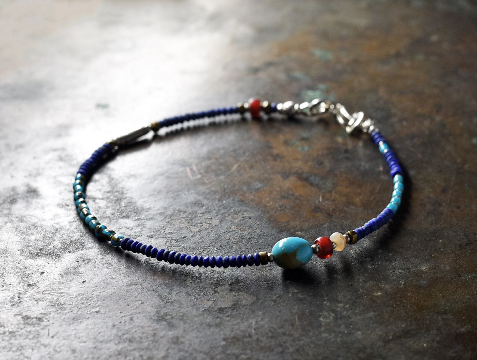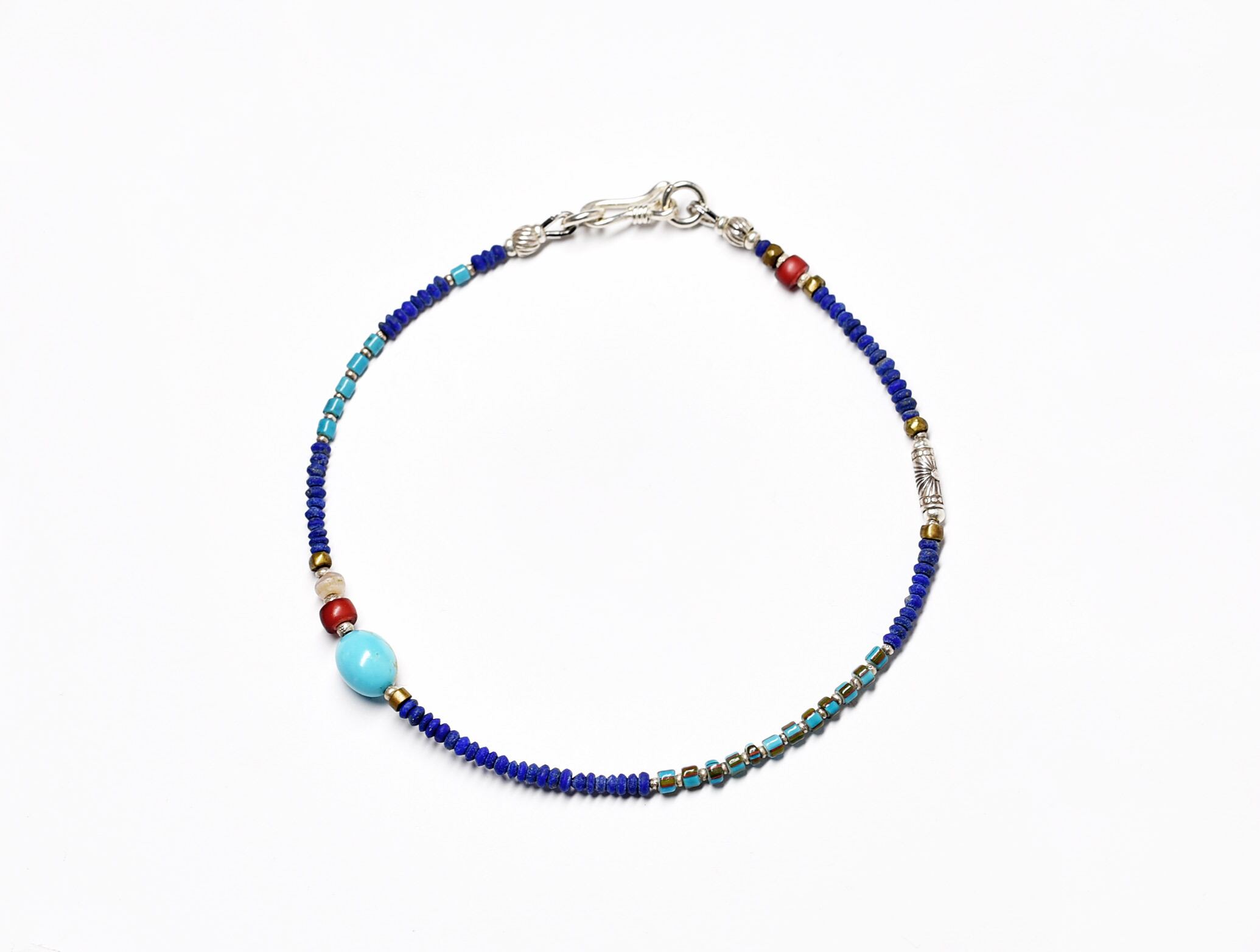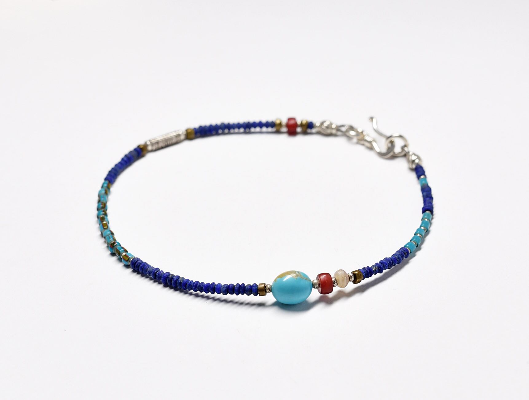 キングマンターコイズと古代瑪瑙、金赤ホワイトハーツ、2種類のターコイズブルーホワイトハーツとラピスoldオリッサブラスを繋いだ華奢なアンクレットです。
