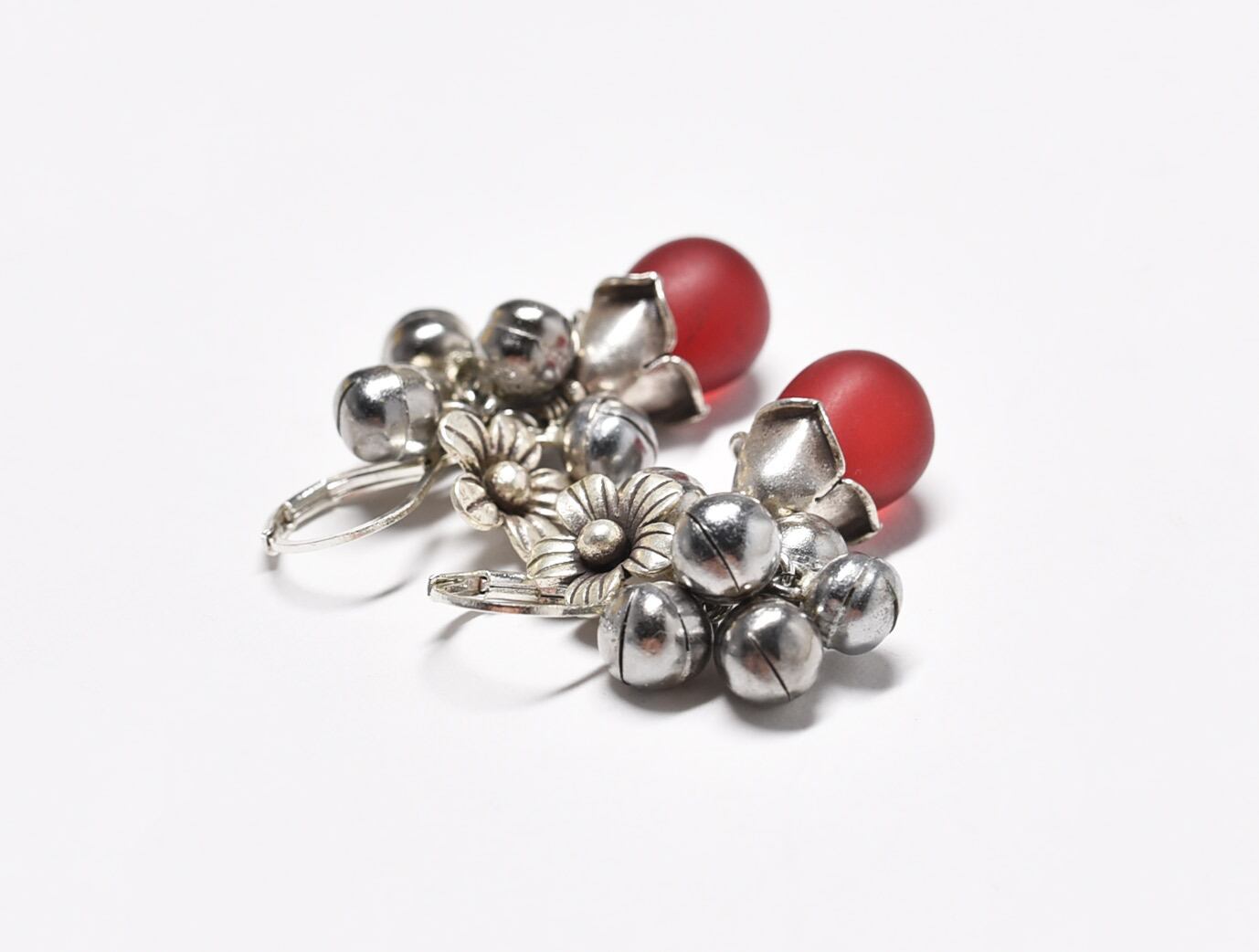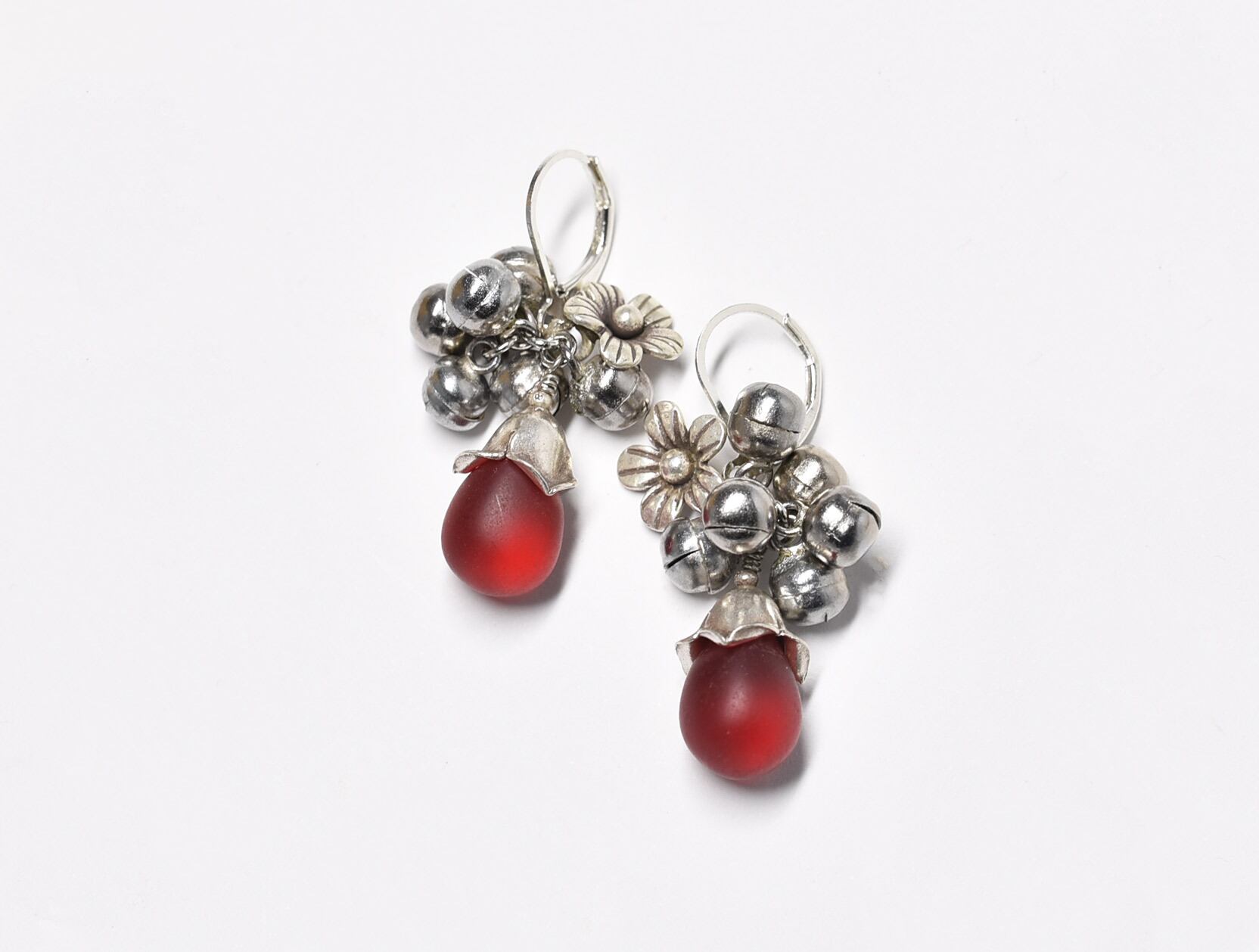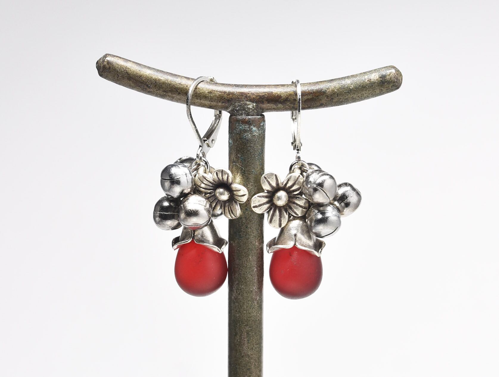 真っ赤なウエディングビーとたわわな鈴、お花カレンシルバーのピアス