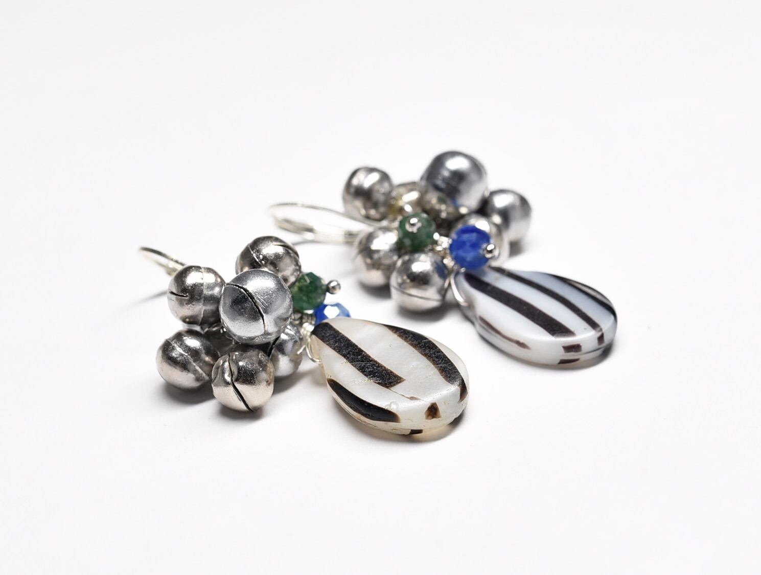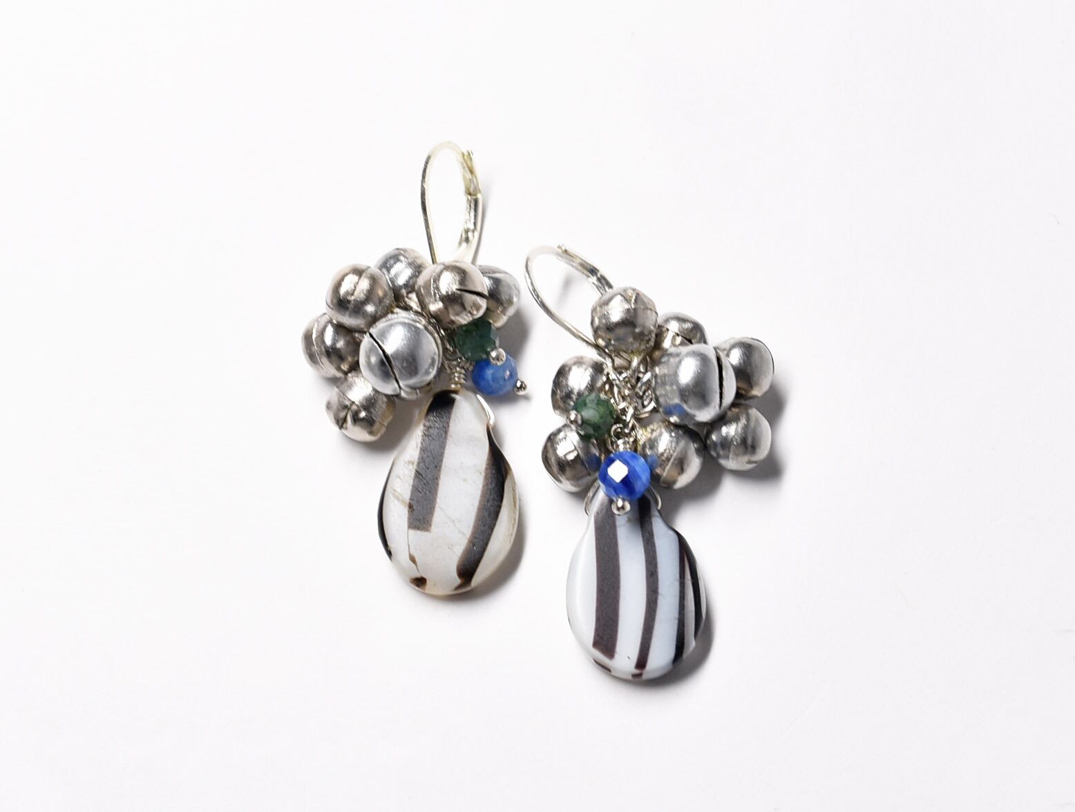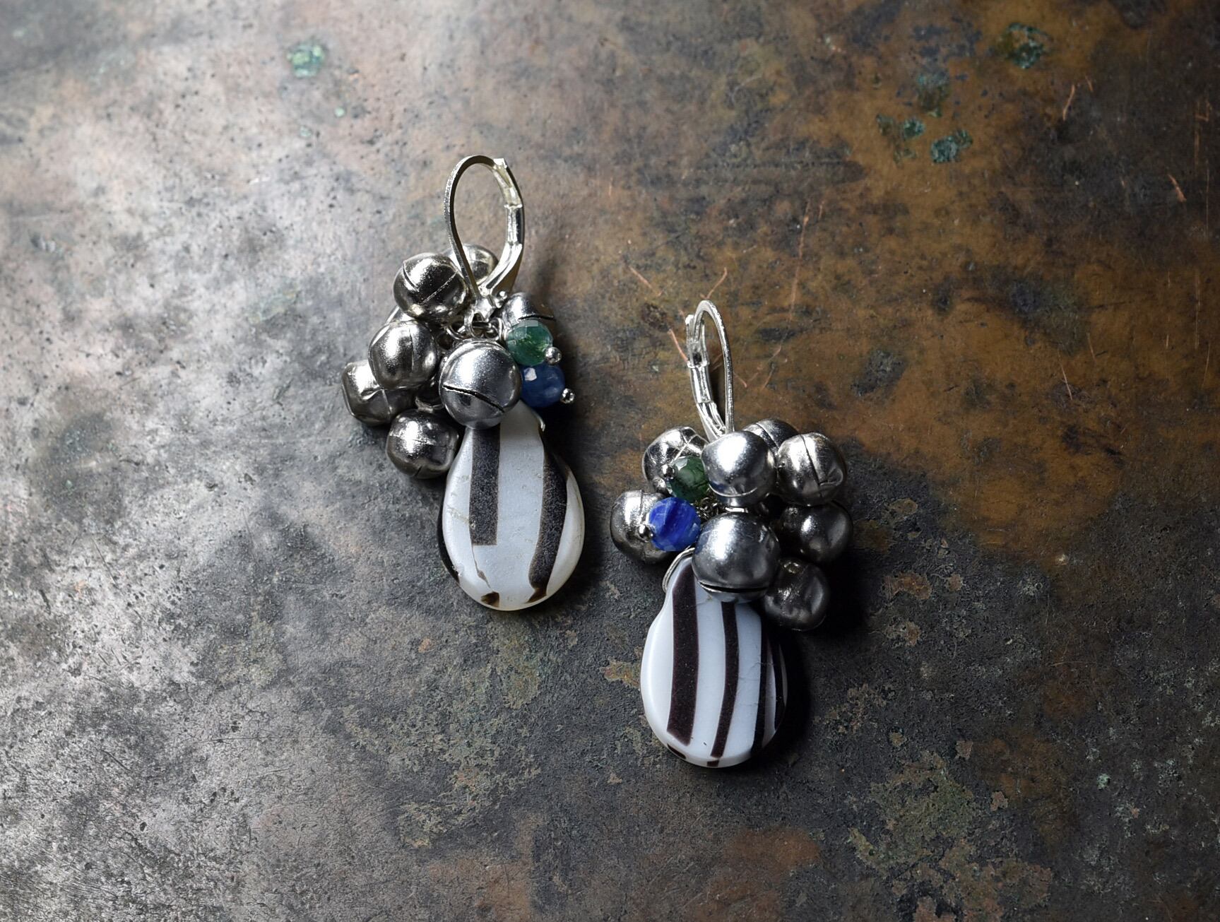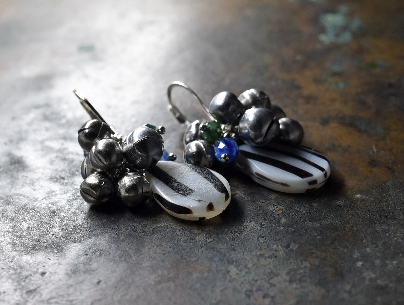 ウエディングビーズと呼ばれるボヘミアのアンティークビーズとたわわな鈴、カイヤナイトとモスアゲートを繋いだピアスです。