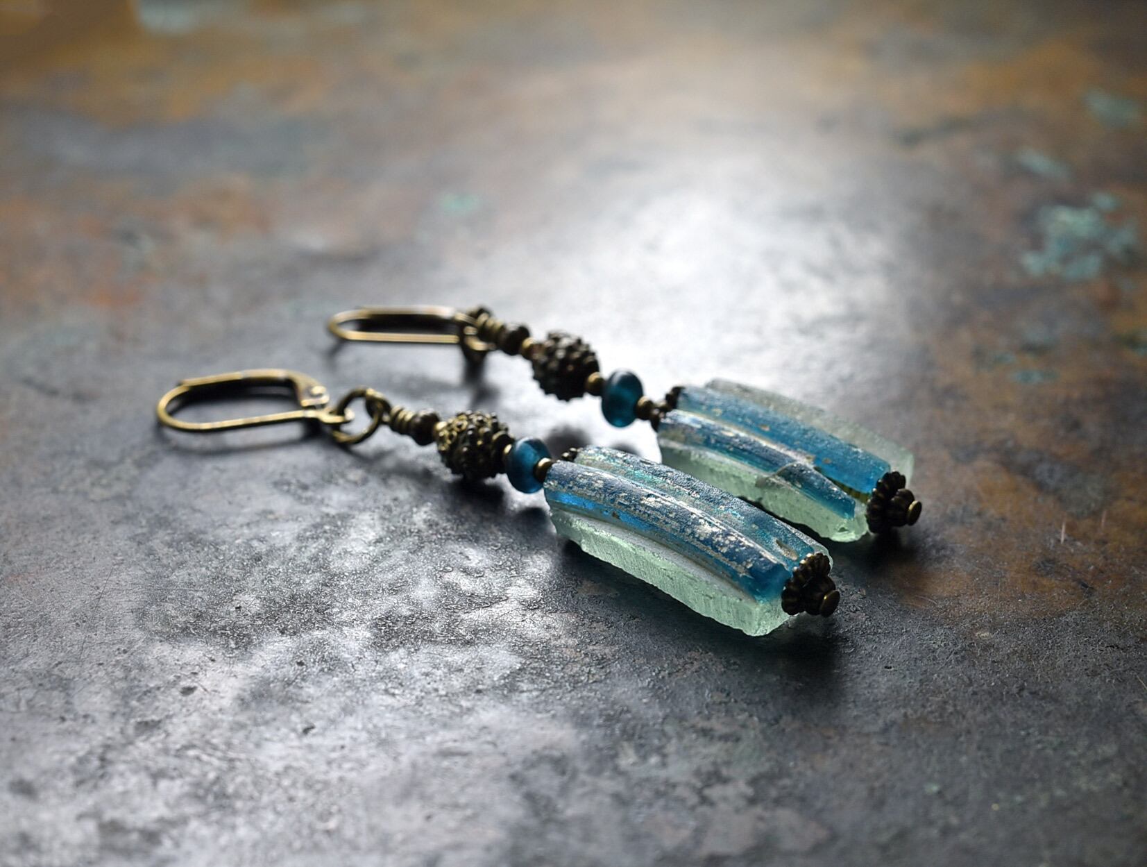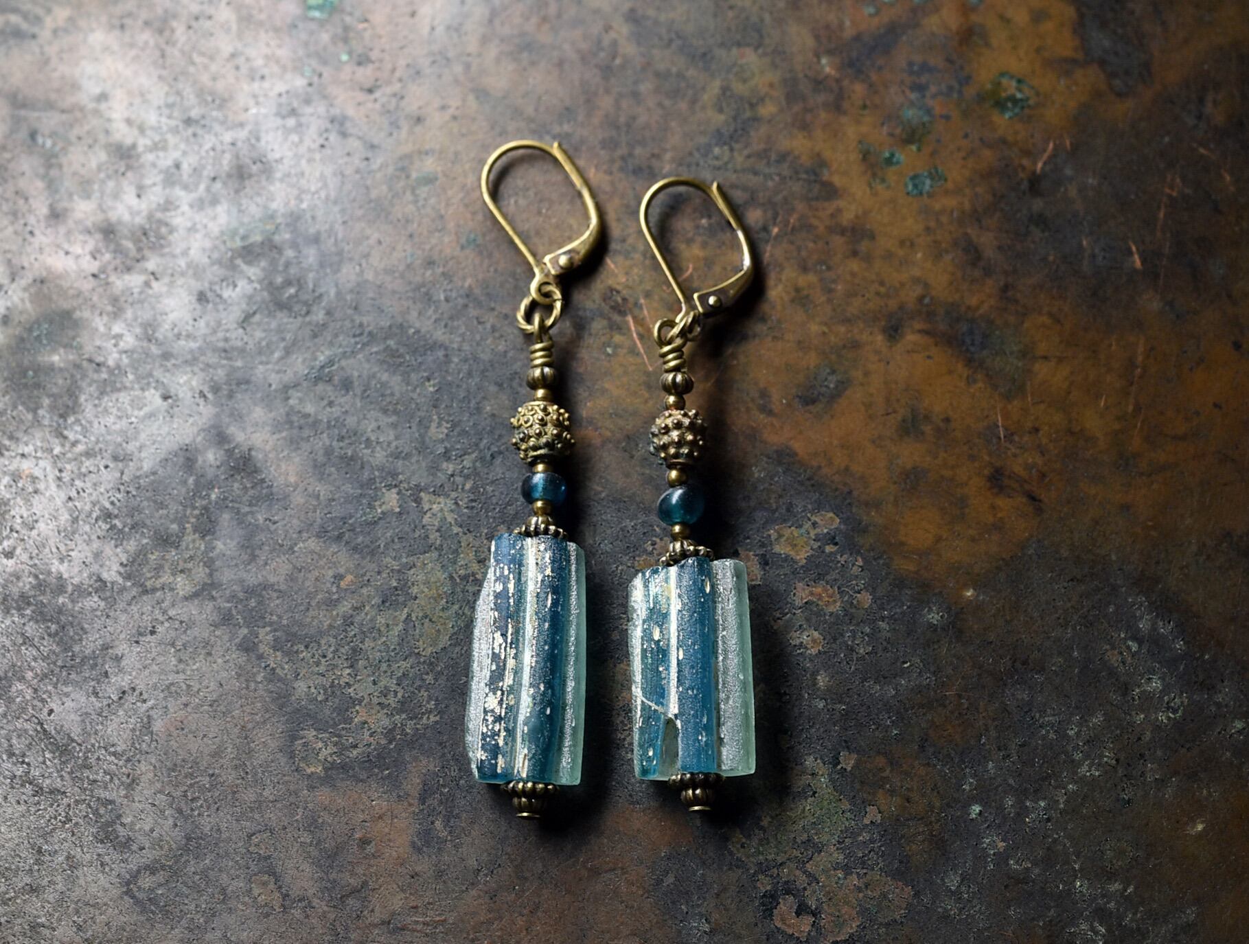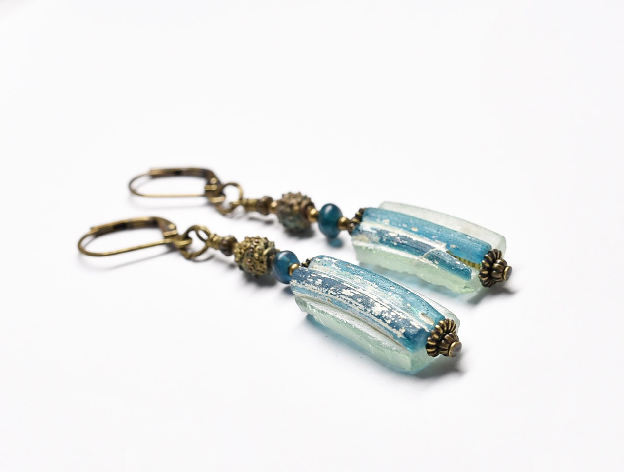 古代ガラスと古いパーツが奏でる枯れた味わいを楽しめる、少し長めなピアスです。