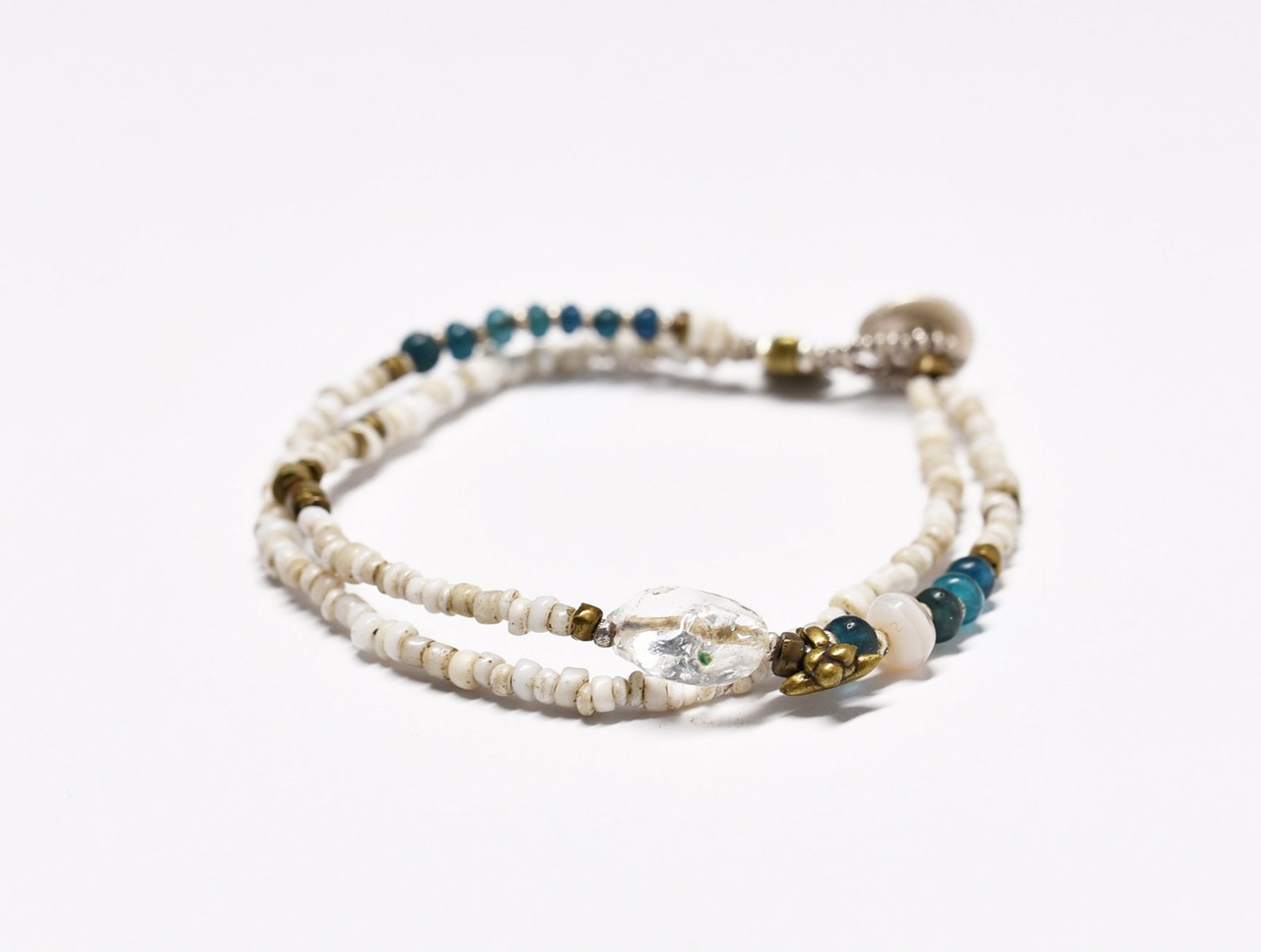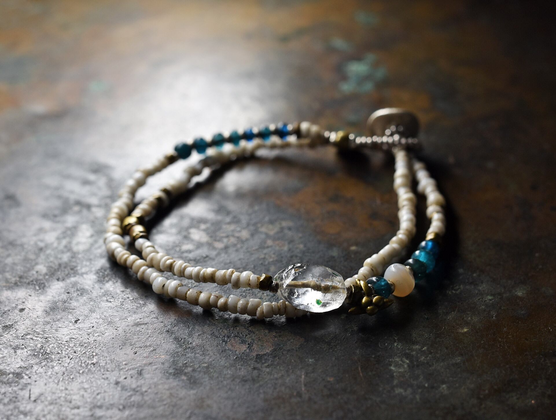 古代施釉水晶と古代瑪瑙、エメラルド&インディゴブルーアンティークビーズ、ホワイトシードビーズのブレス