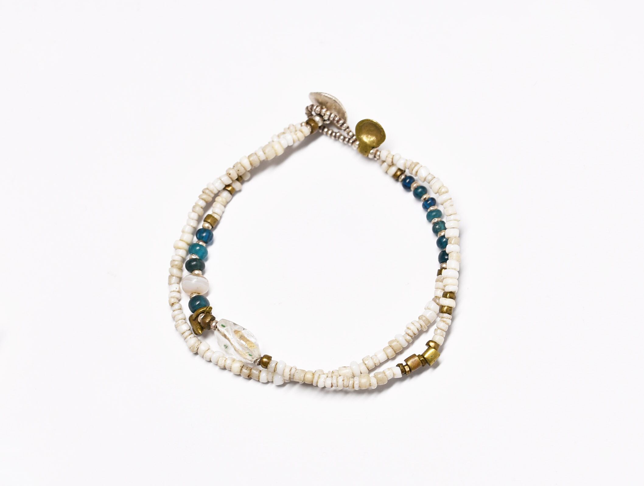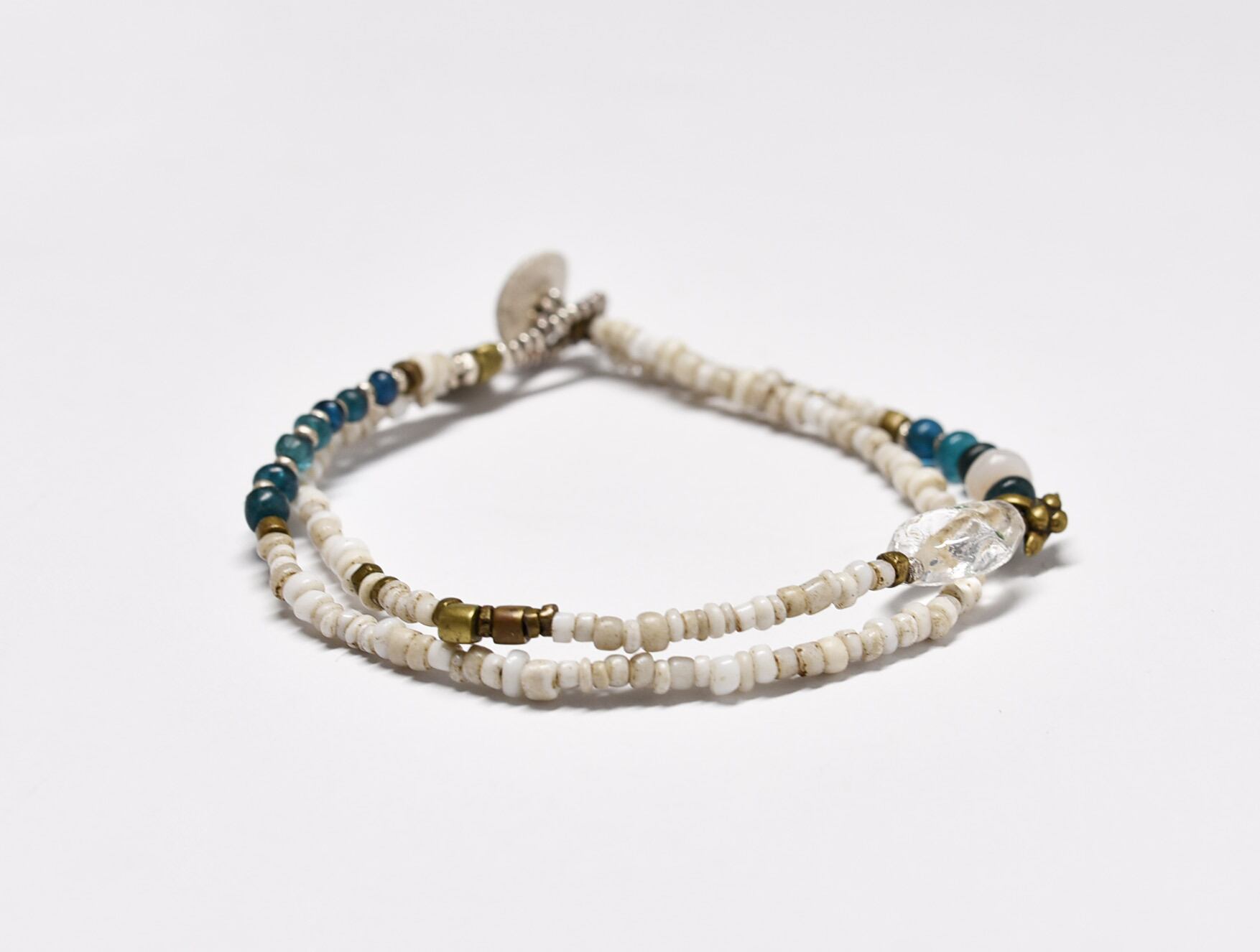 古代施釉水晶、古代瑪瑙、エメラルドブルーとインディゴブルー、ホワイトのアンティークビーズoldオリッサブラスを繋いだブレスです。