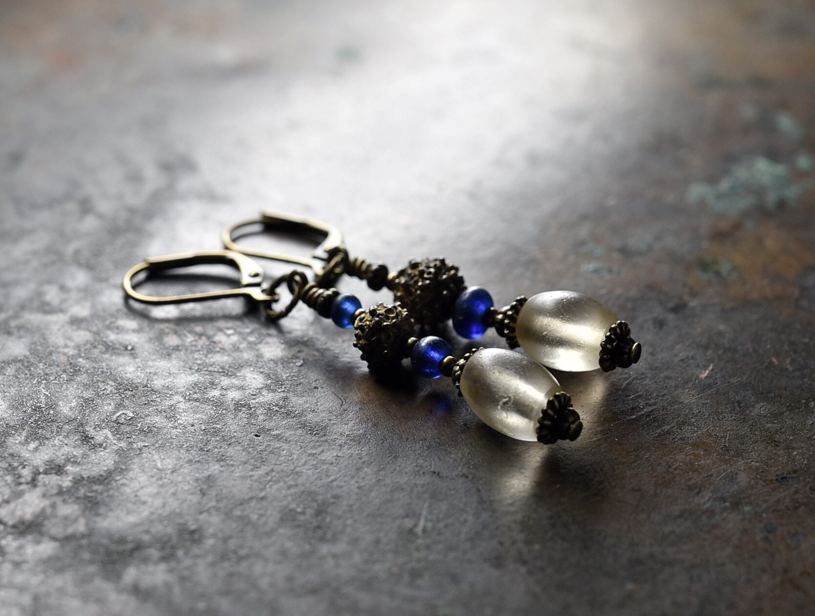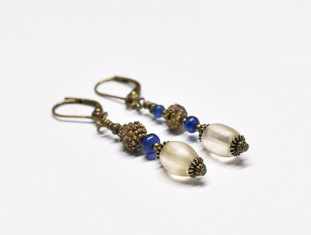 アンティークボヘミアビーズとダークブルービーズ、民族ブラスのアンシメトリーピアス