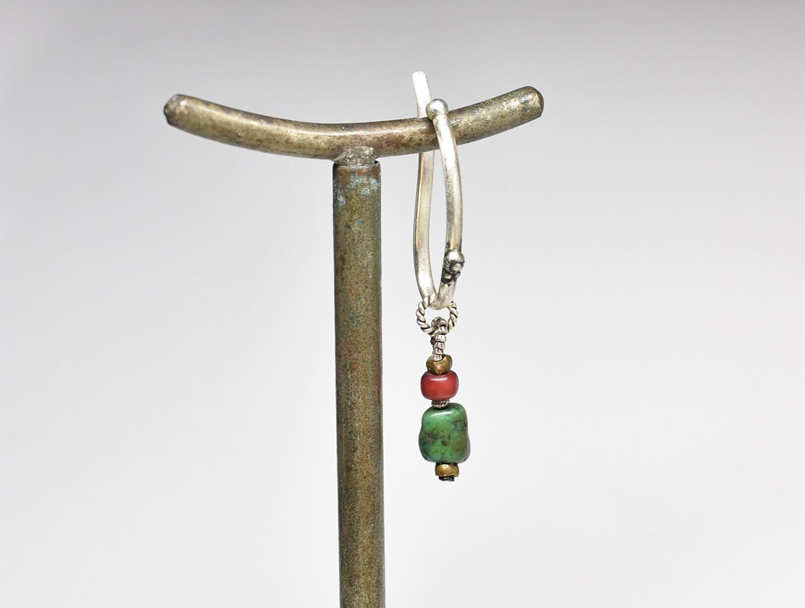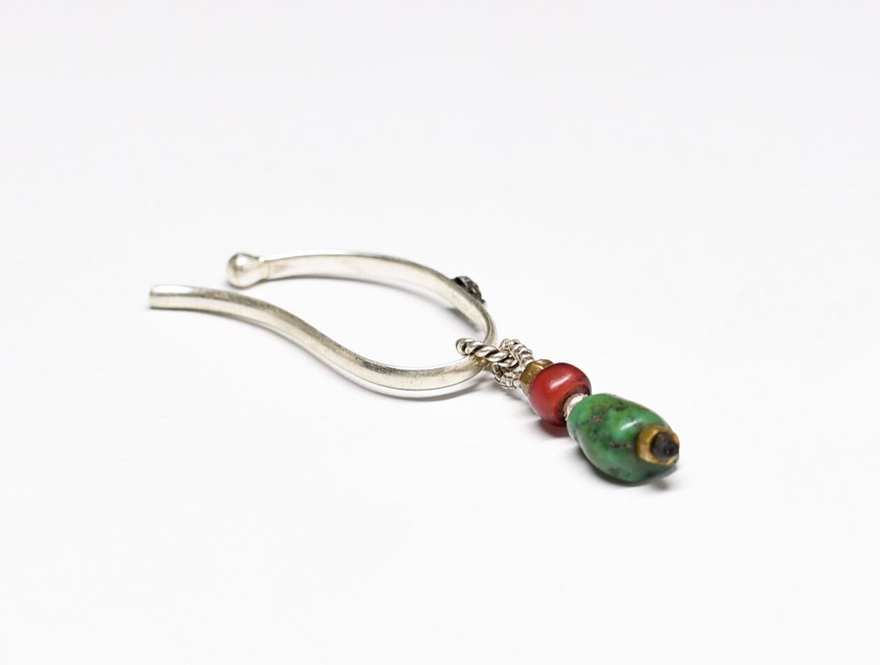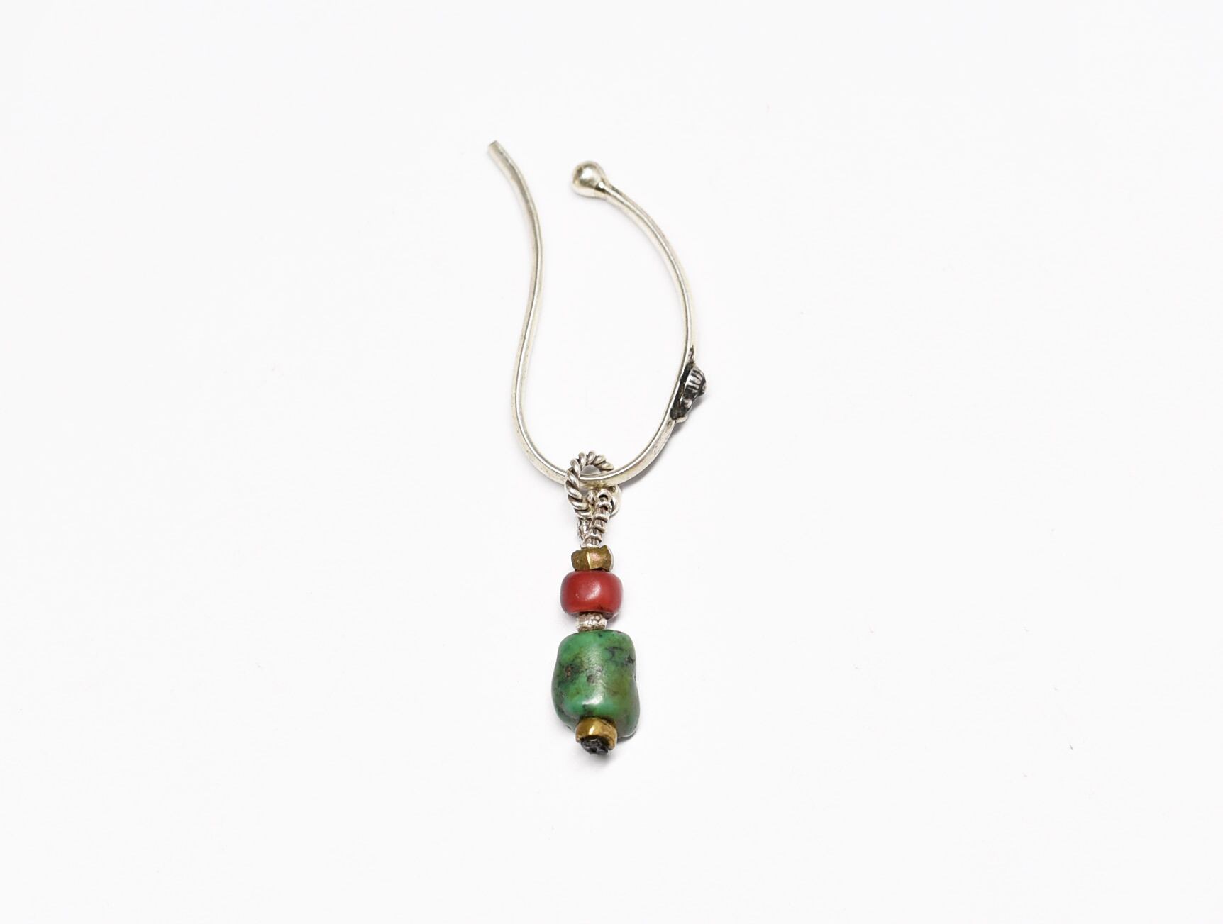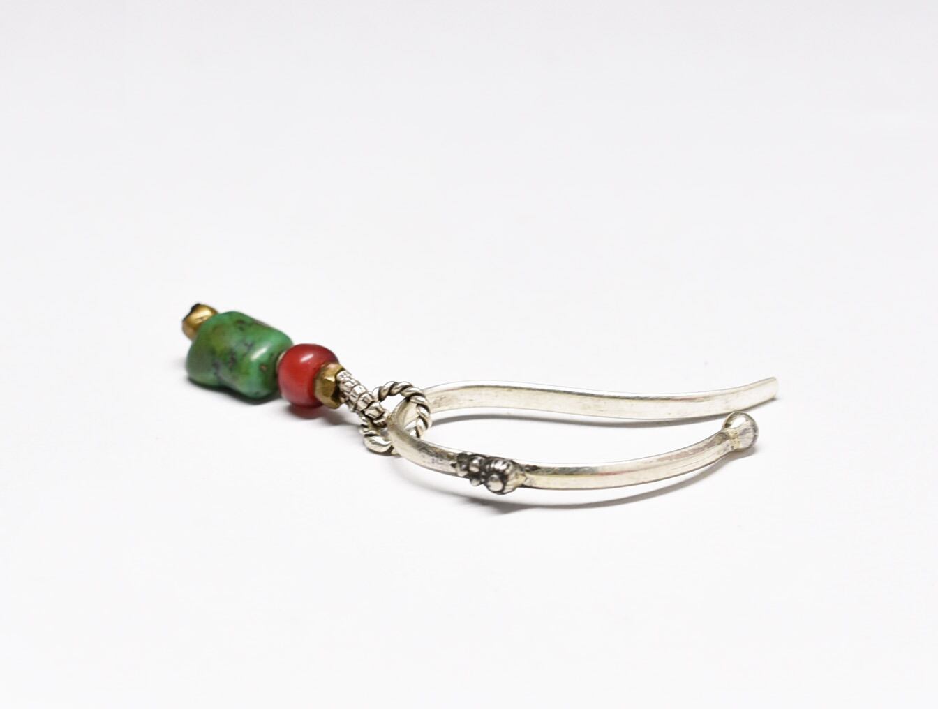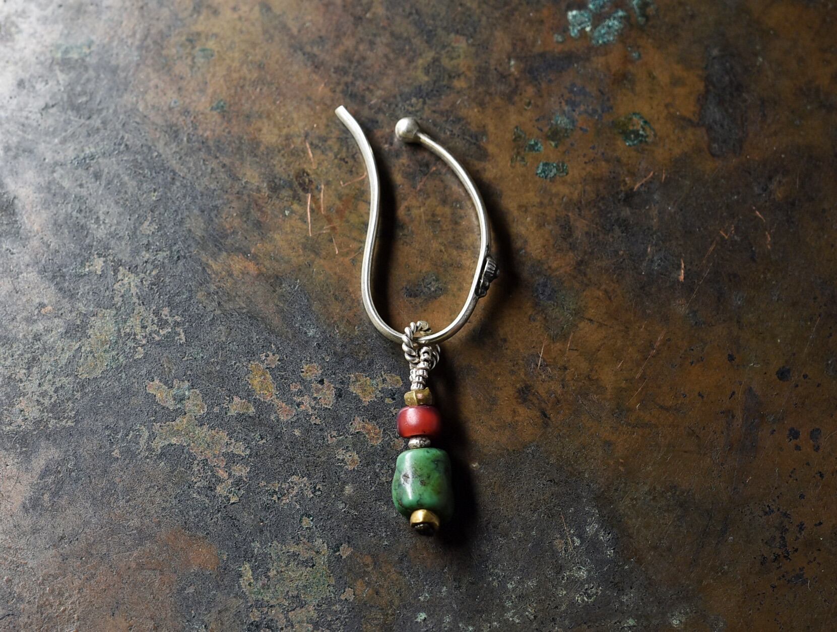 oldチベタンターコイズと金赤ホワイトハーツ、oldオリッサブラス、カレンシルバーを繋いだインドシルバーのイヤーカフです。