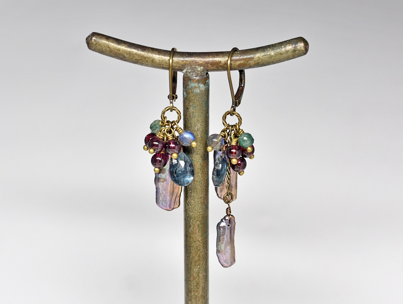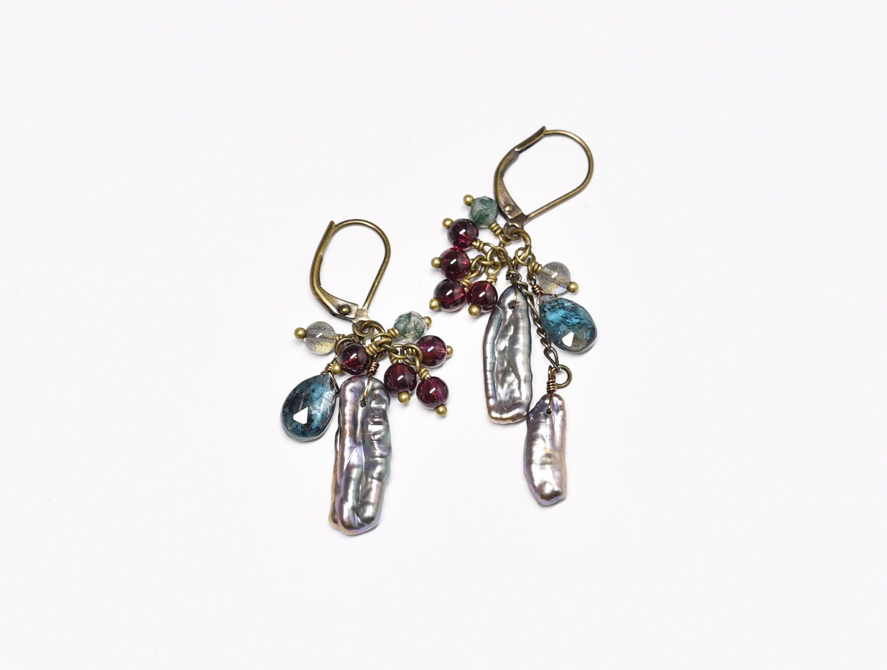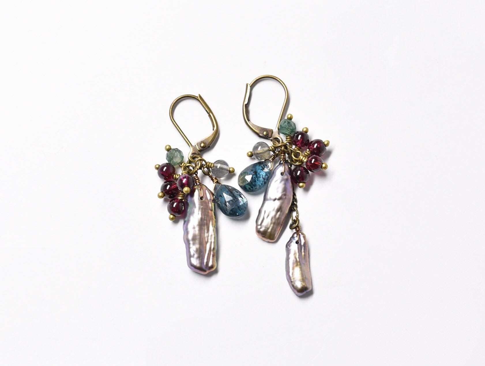 バロックパールとガーネット、インディゴブルーカイヤナイト、ラブラドライト、モスアゲートのアンシメトリーに繋いだピアスです。