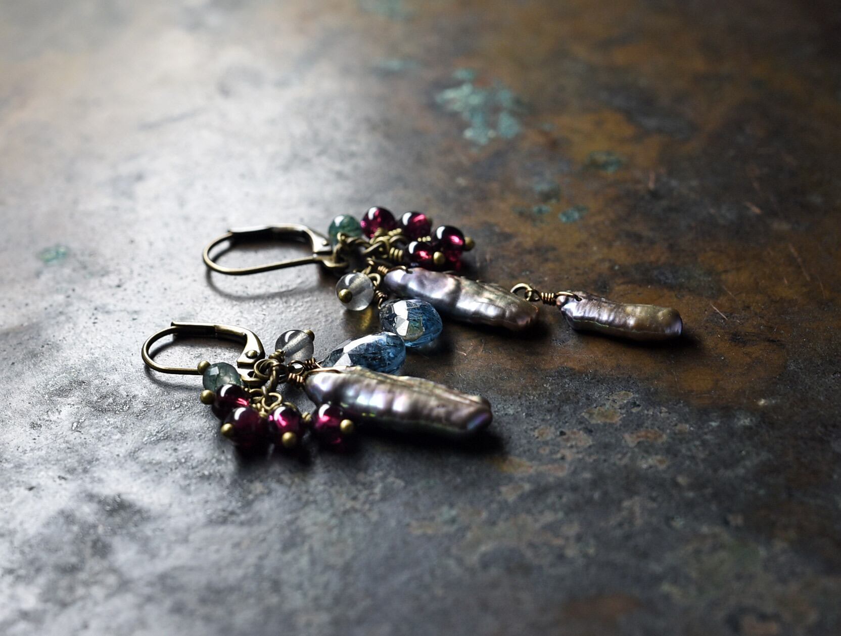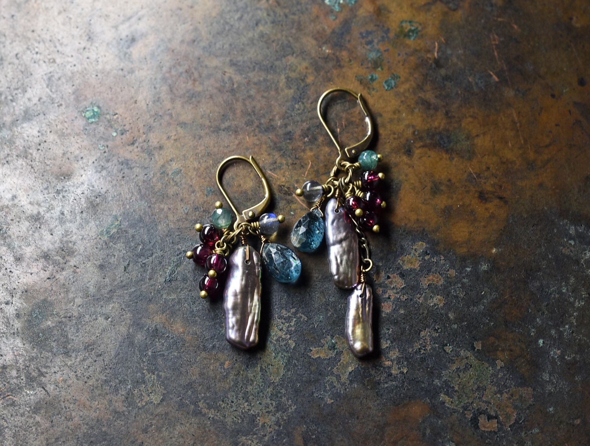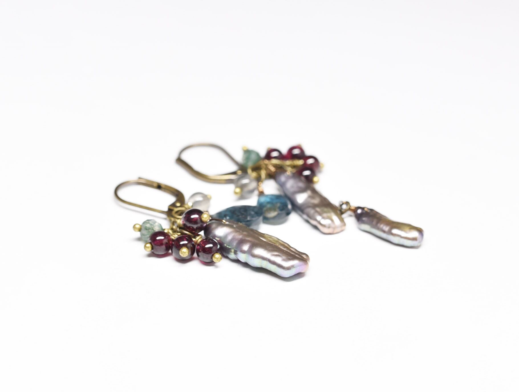 バロックパールとガーネット、インディゴブルーカイヤナイト、ラブラドライト、モスアゲートのアンシメトリーに繋いだピアスです。