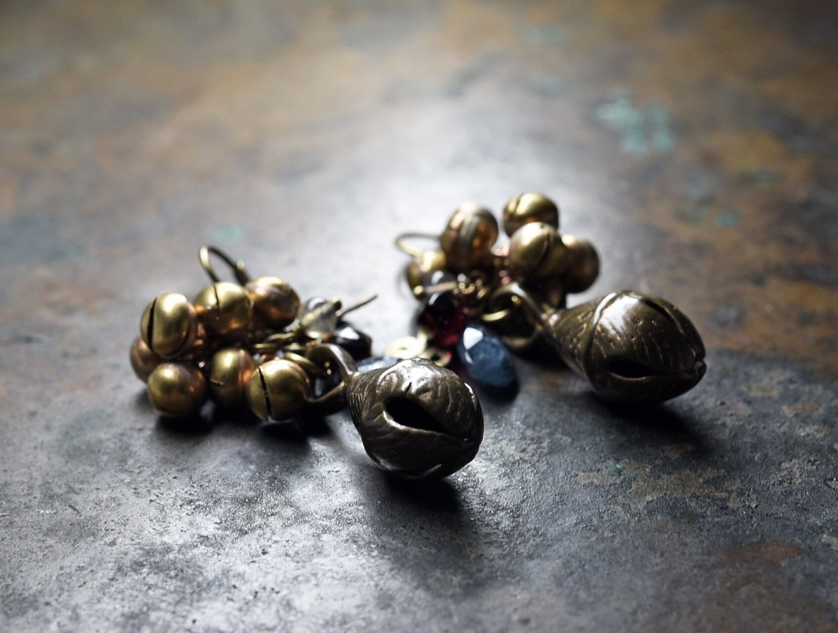 インドの大きな鈴と、たわわな鈴、3種類のストーンビーズ、アフガンパーツのピアス
