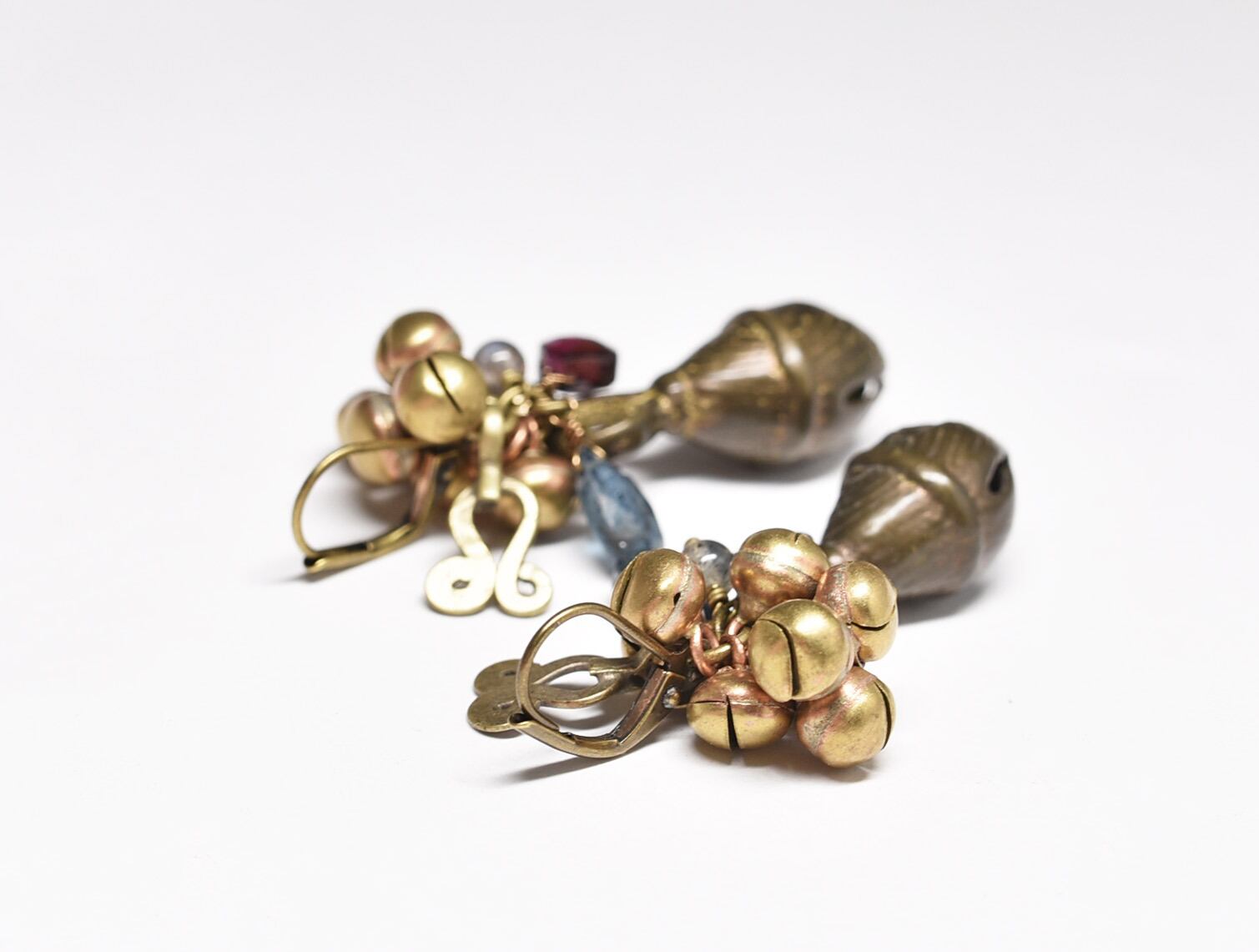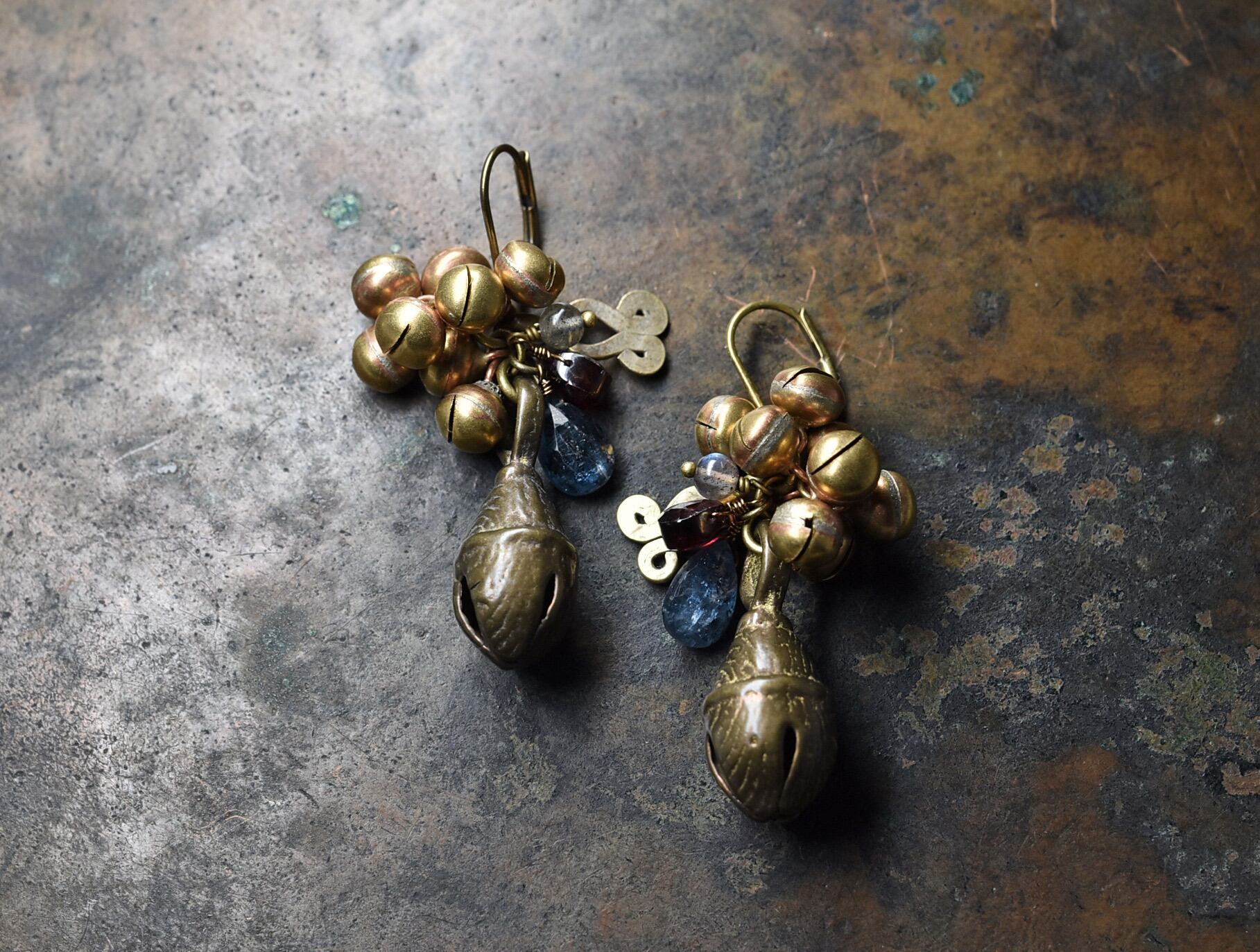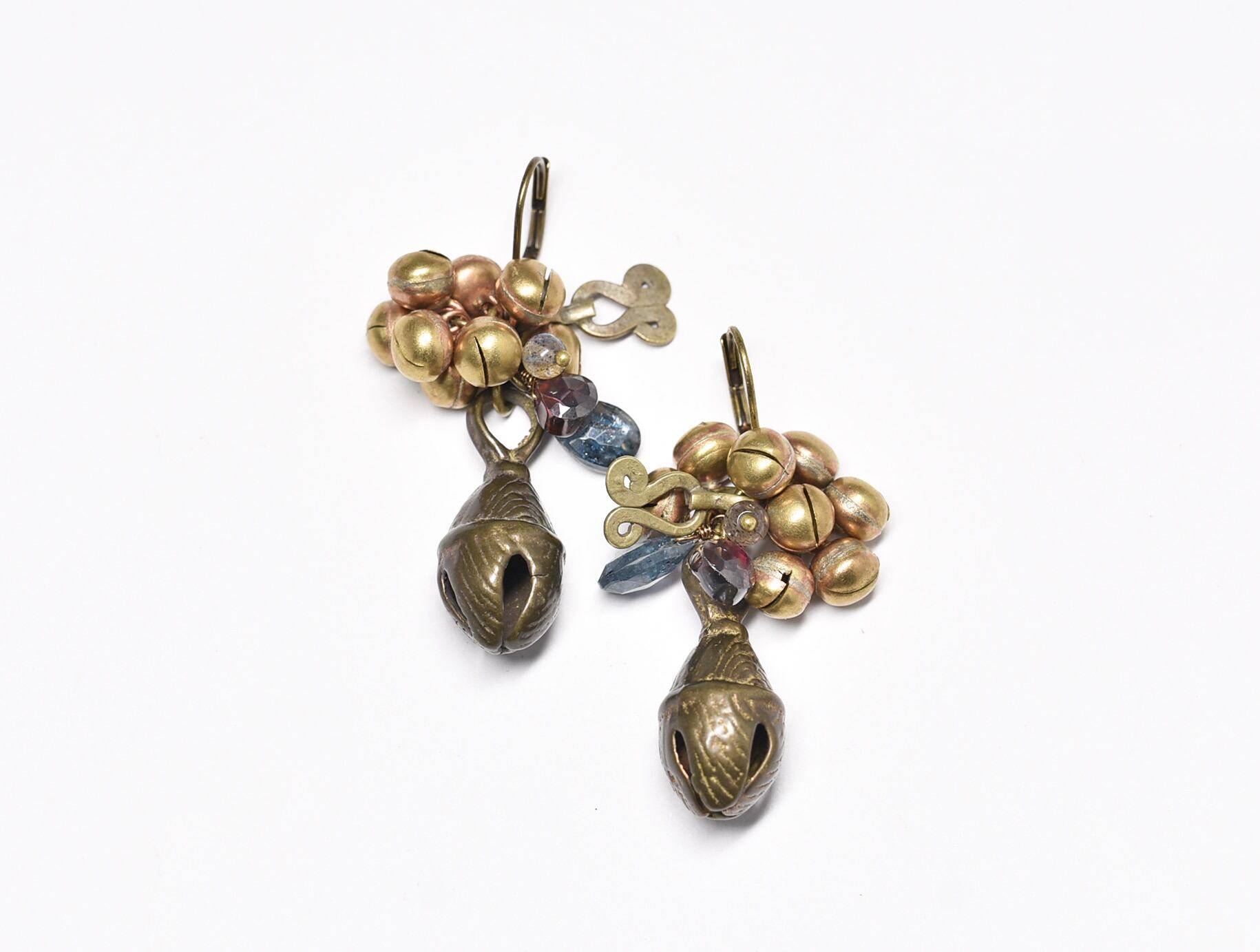 インドの大きな鈴と、たわわな鈴、3種類のストーンビーズ、アフガンパーツを繋いだピアスです。