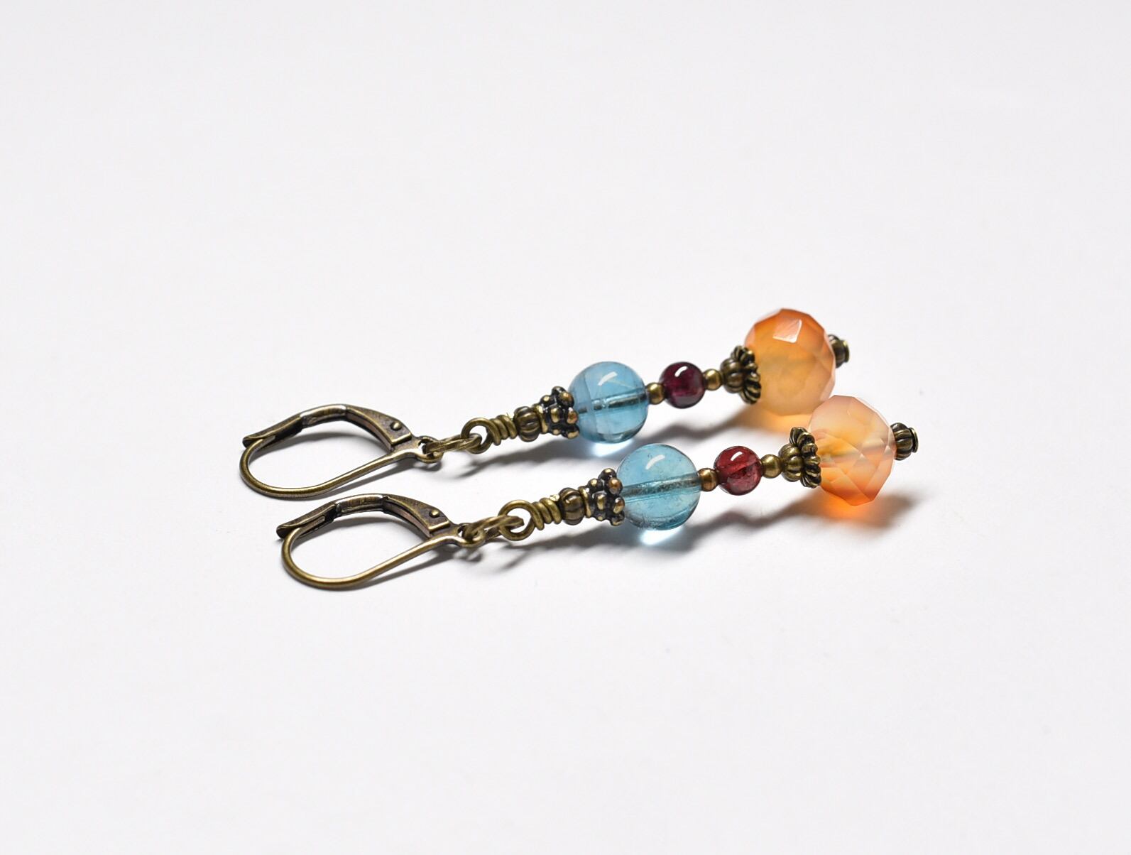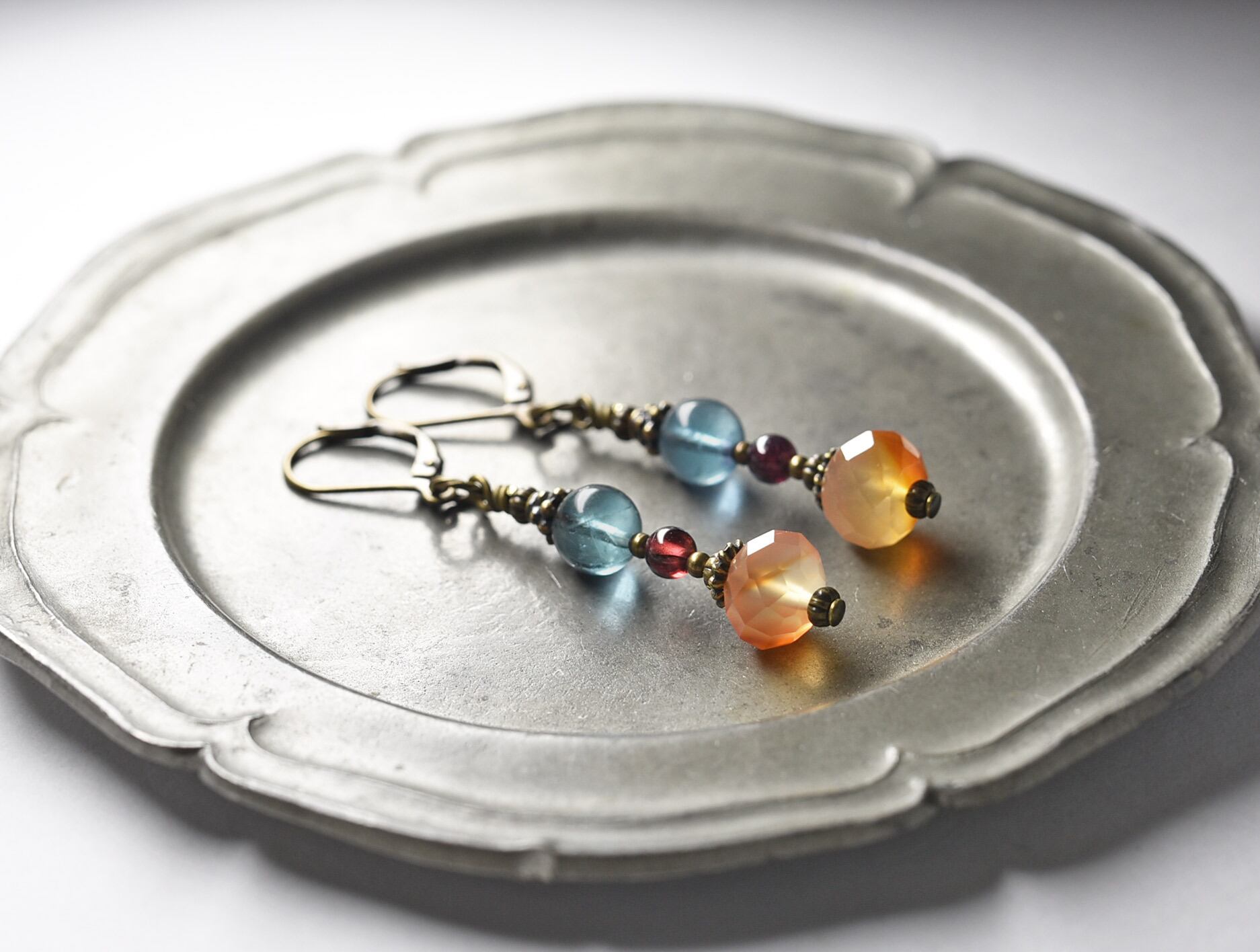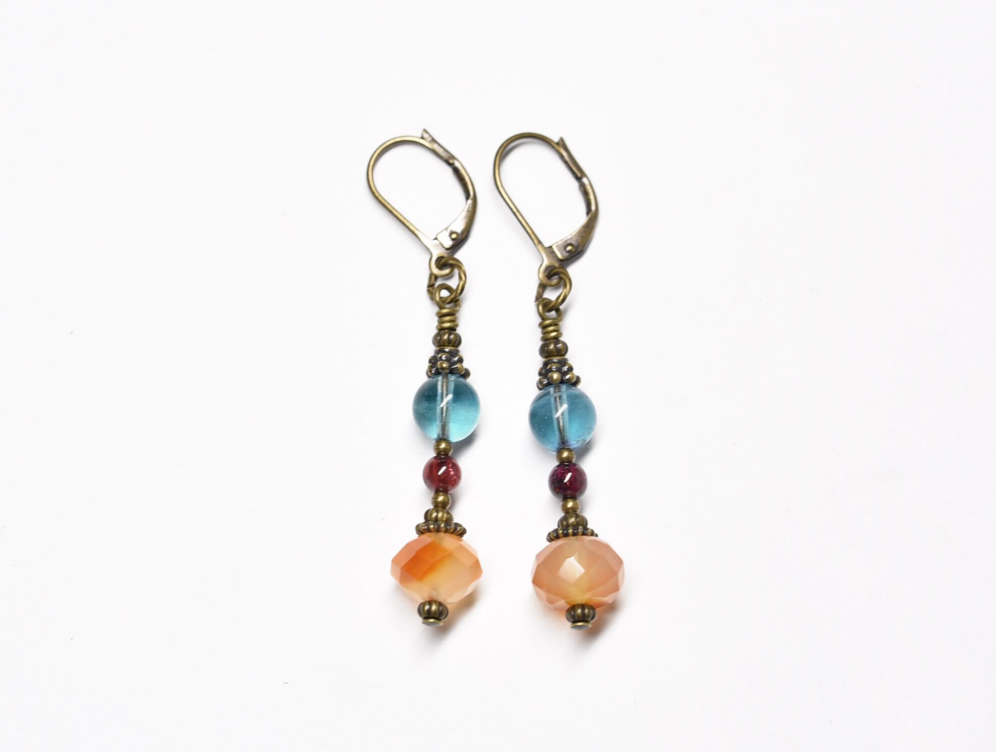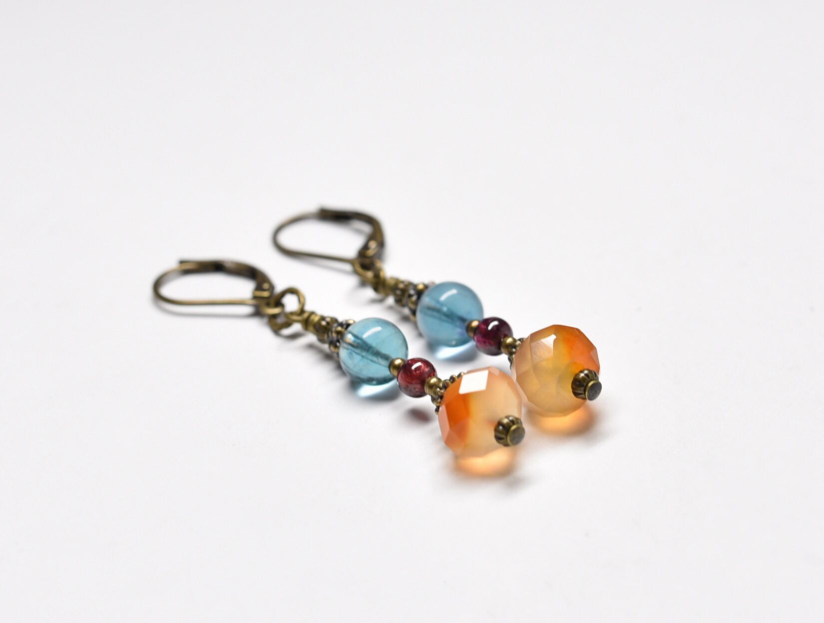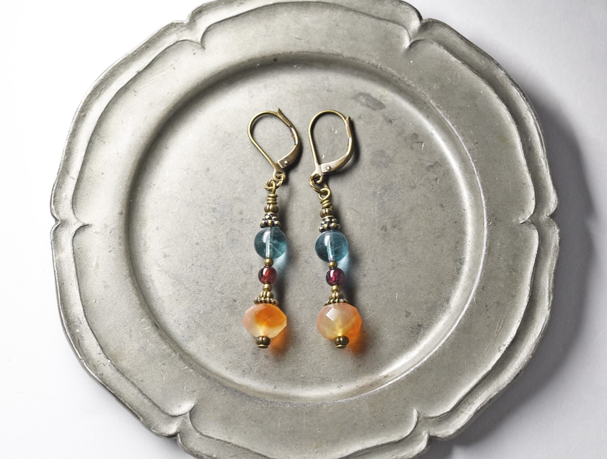 カーネリアンとガーネット、ブルーグリーンフローライトのピアス