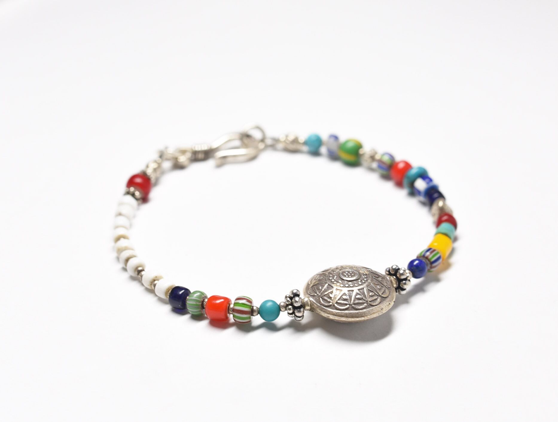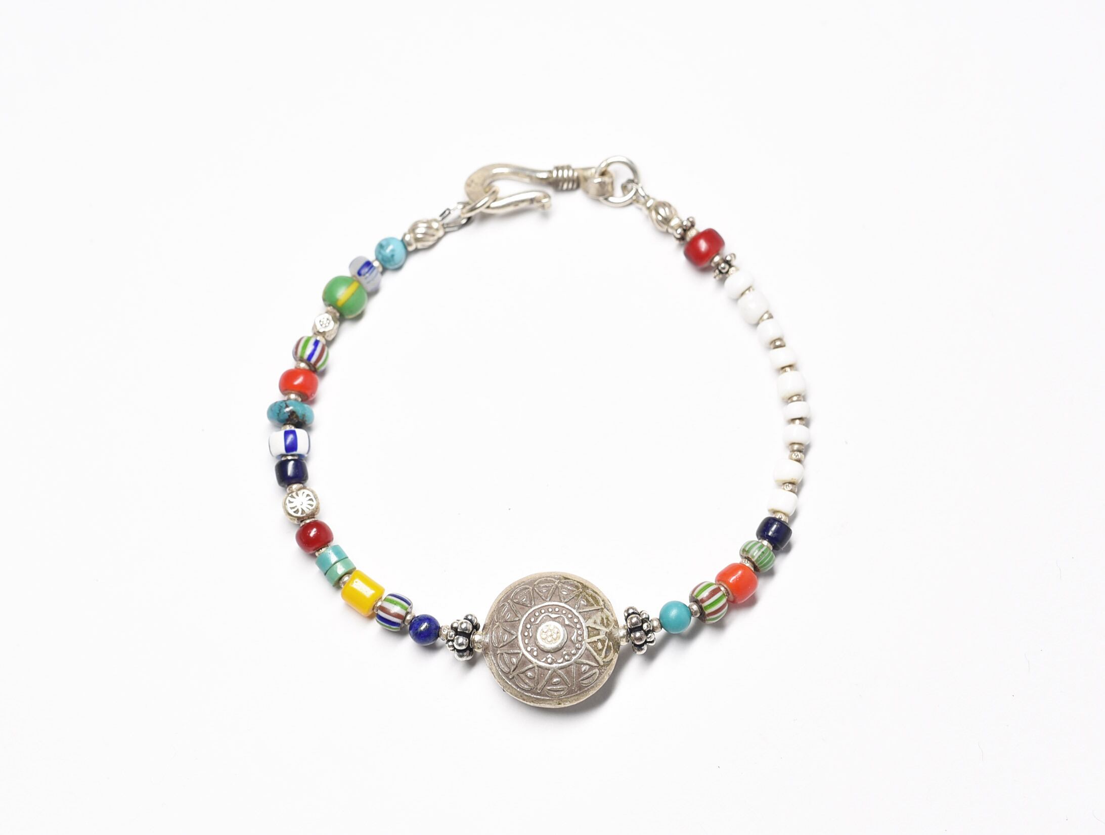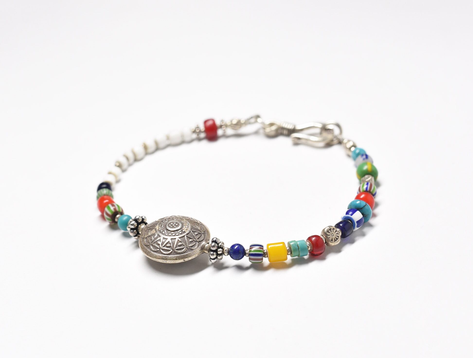 魔法陣のようなカレンシルバーをトップに、色んなベネチア産のアンティークビーズや天然石、カレンシルバービーズをミックスした賑やかなブレスです。