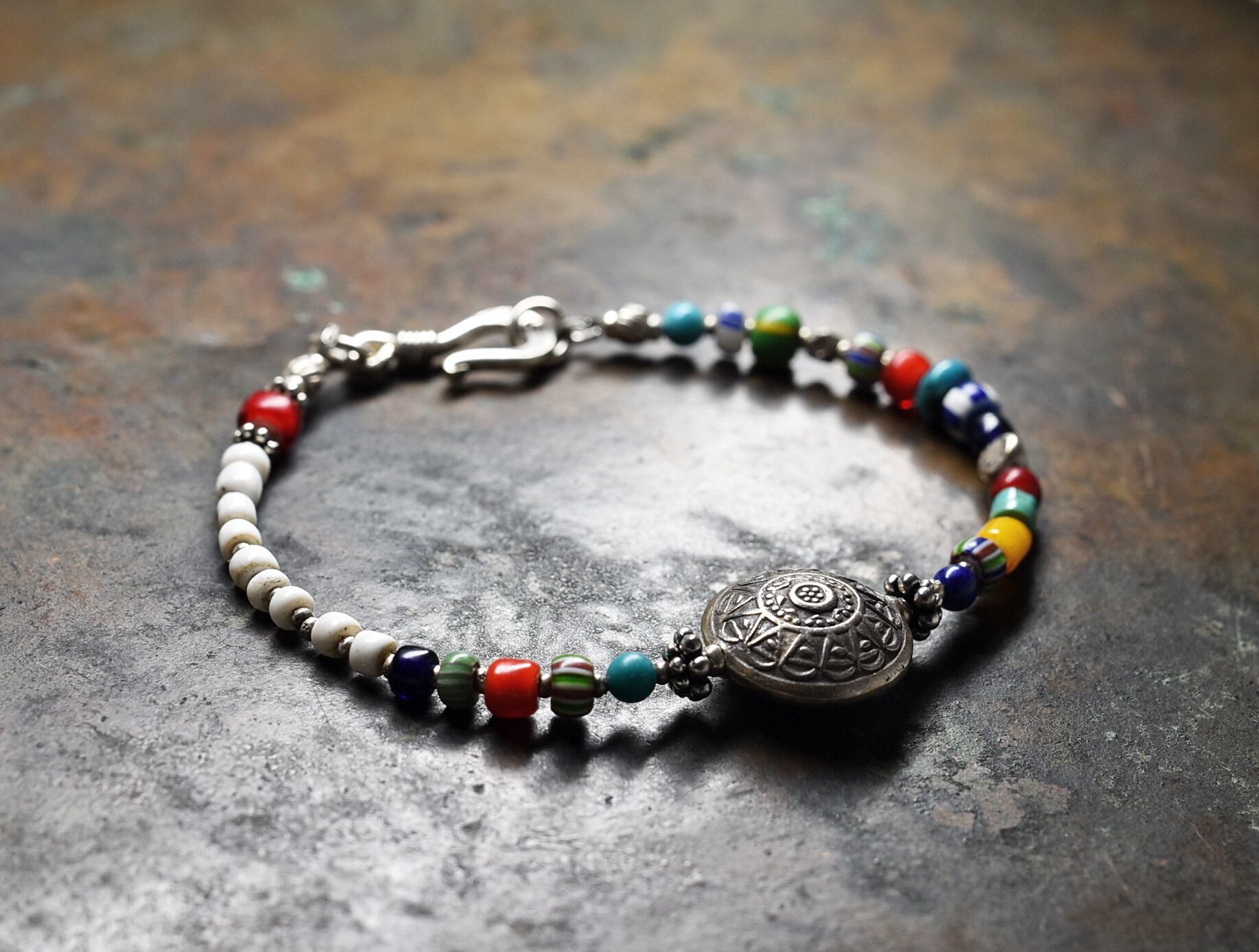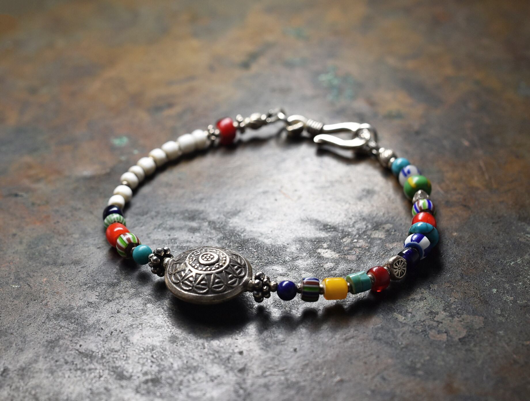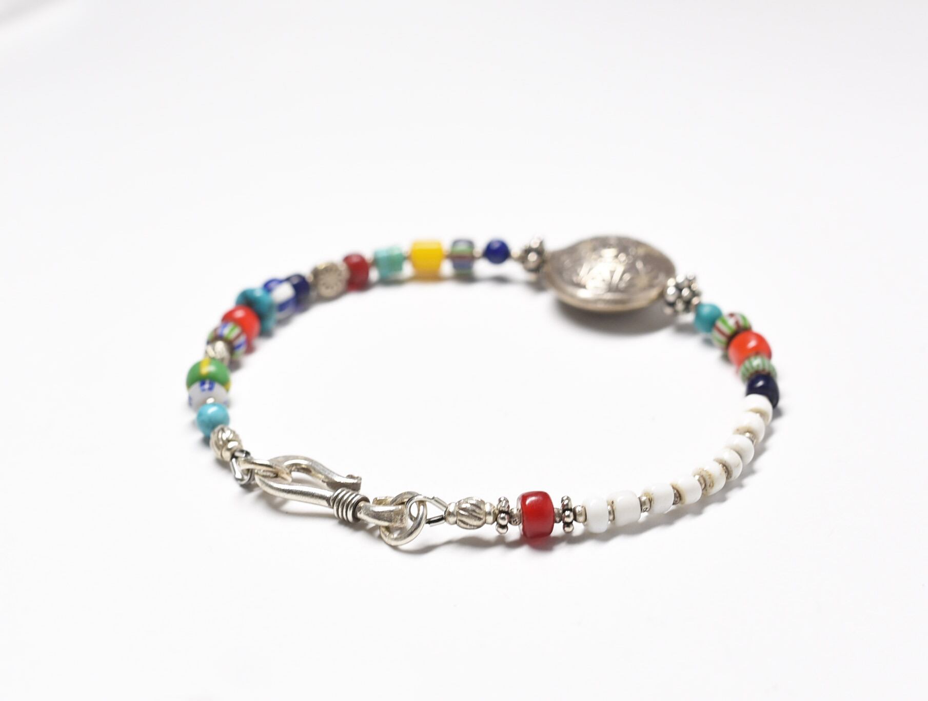 魔法陣のようなカレンシルバーをトップに、色んなベネチア産のアンティークビーズや天然石、カレンシルバービーズをミックスした賑やかなブレスです。