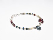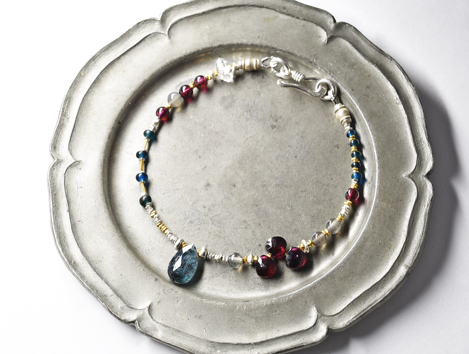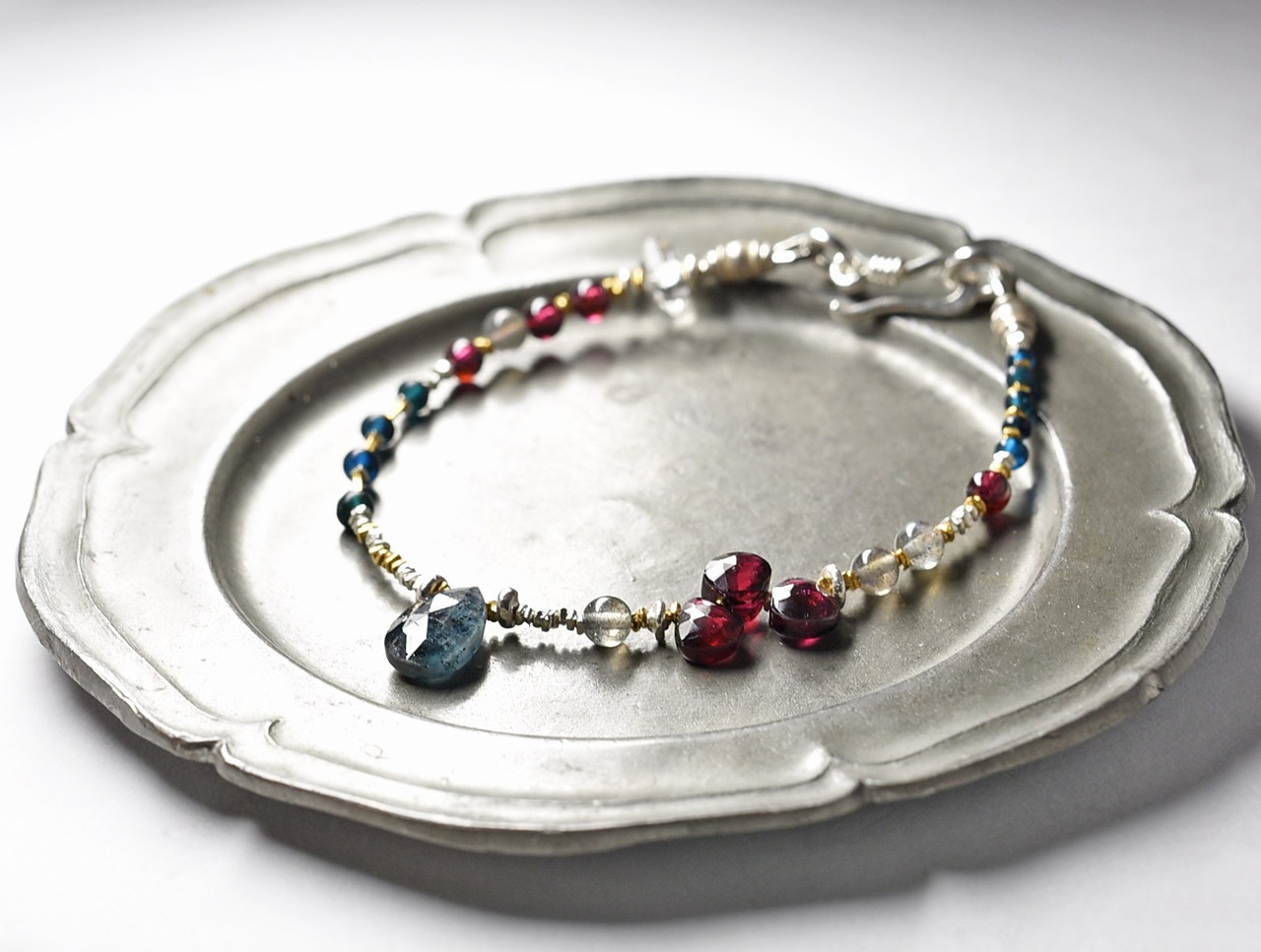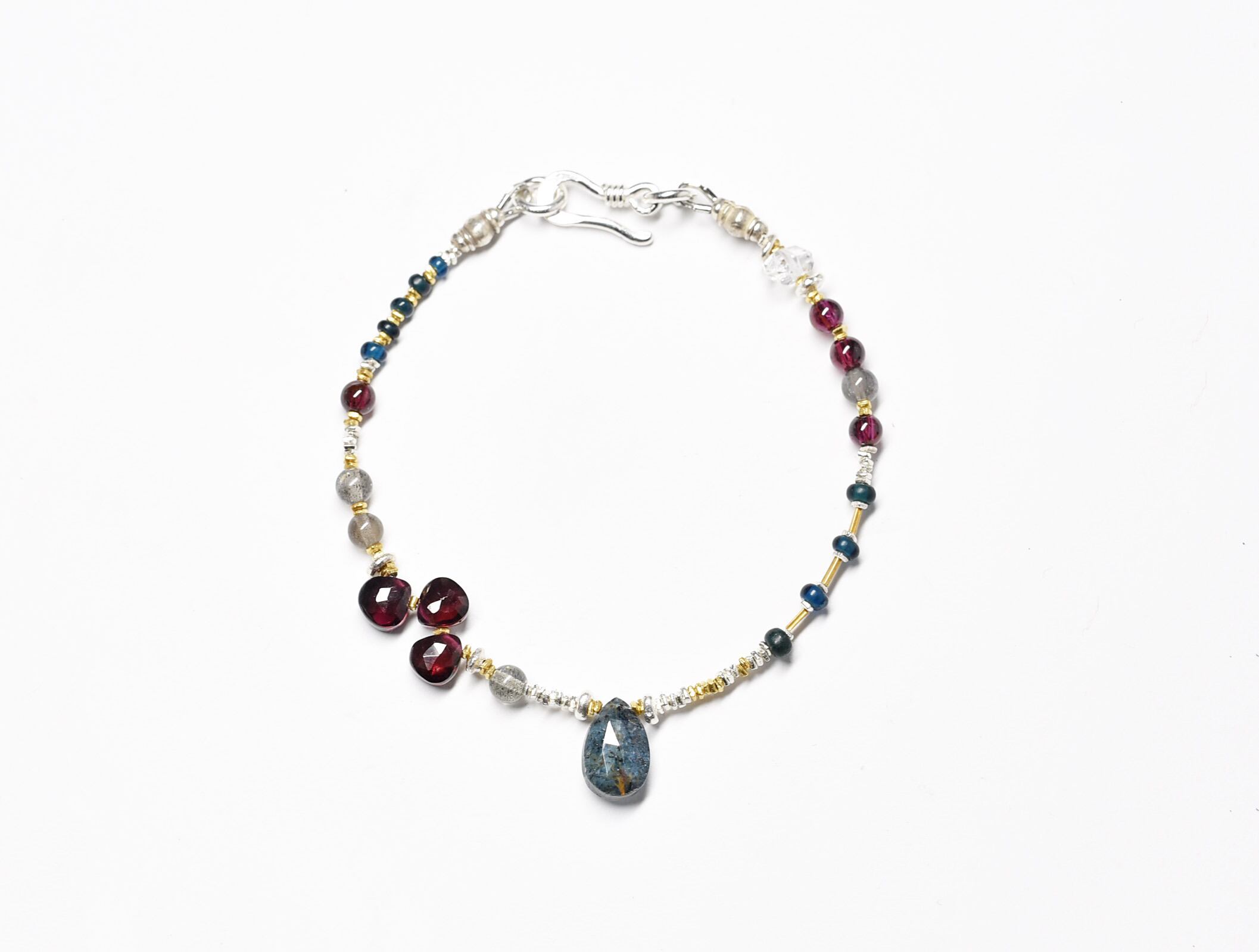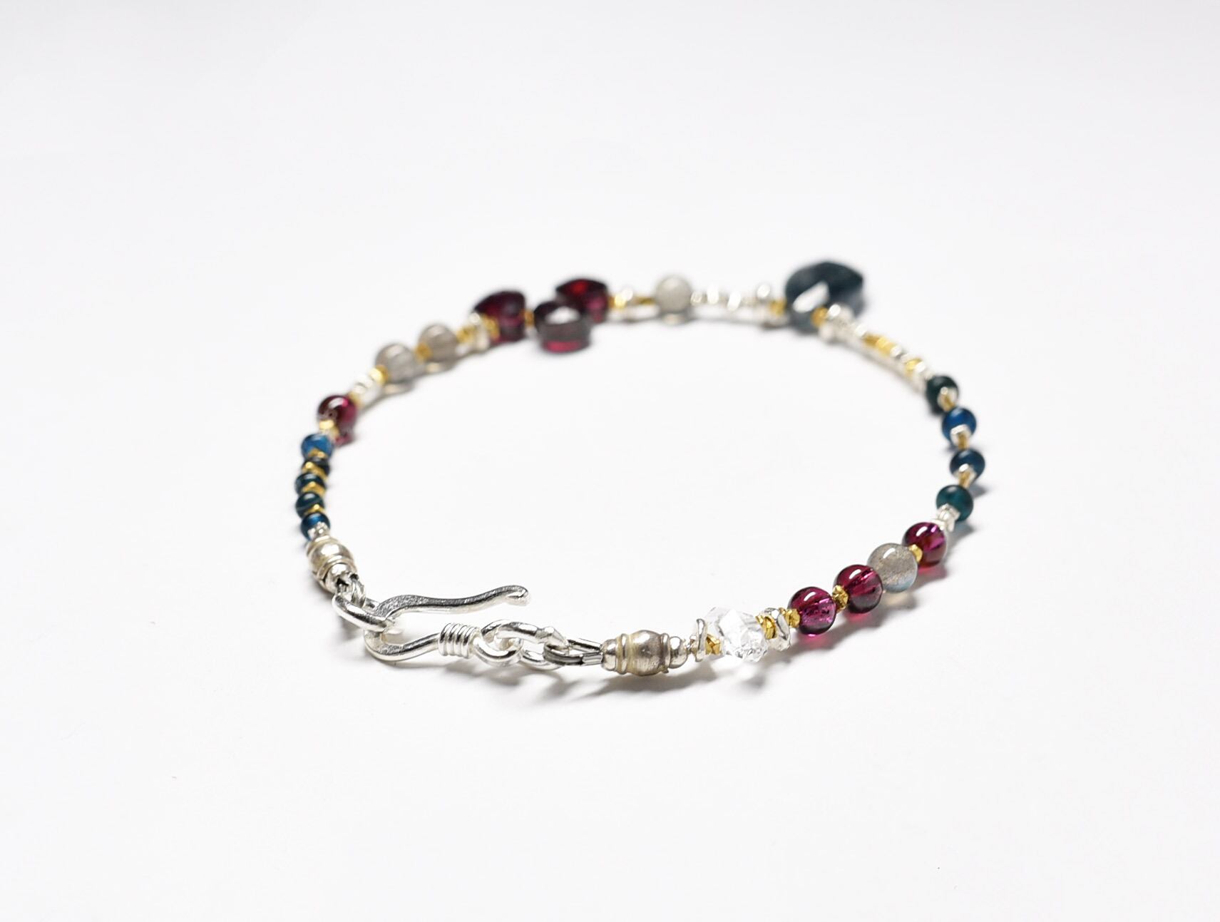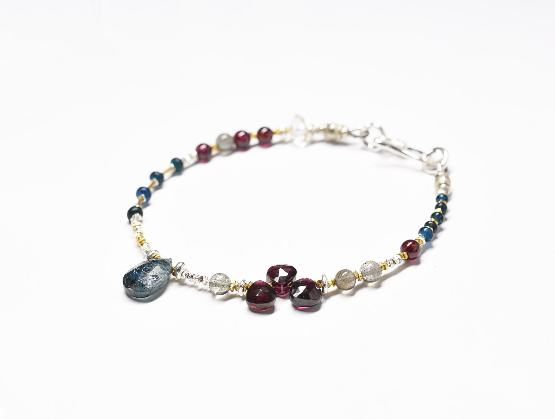 カイヤナイトとハーキマーダイヤモンド、ガーネット、ラブラドライト、インディゴブルービーズ、カレンシルバービーズを繋いだブレスです。