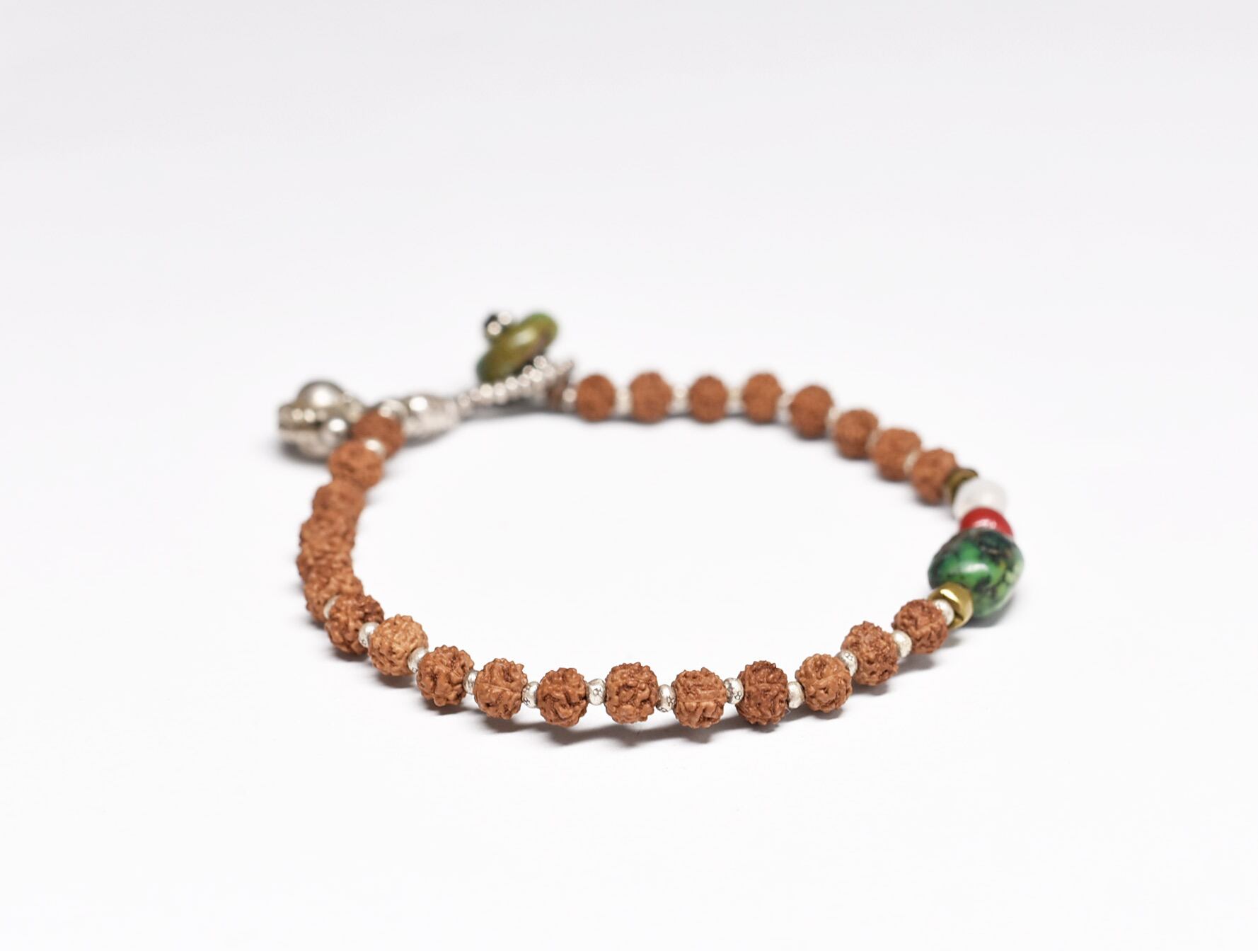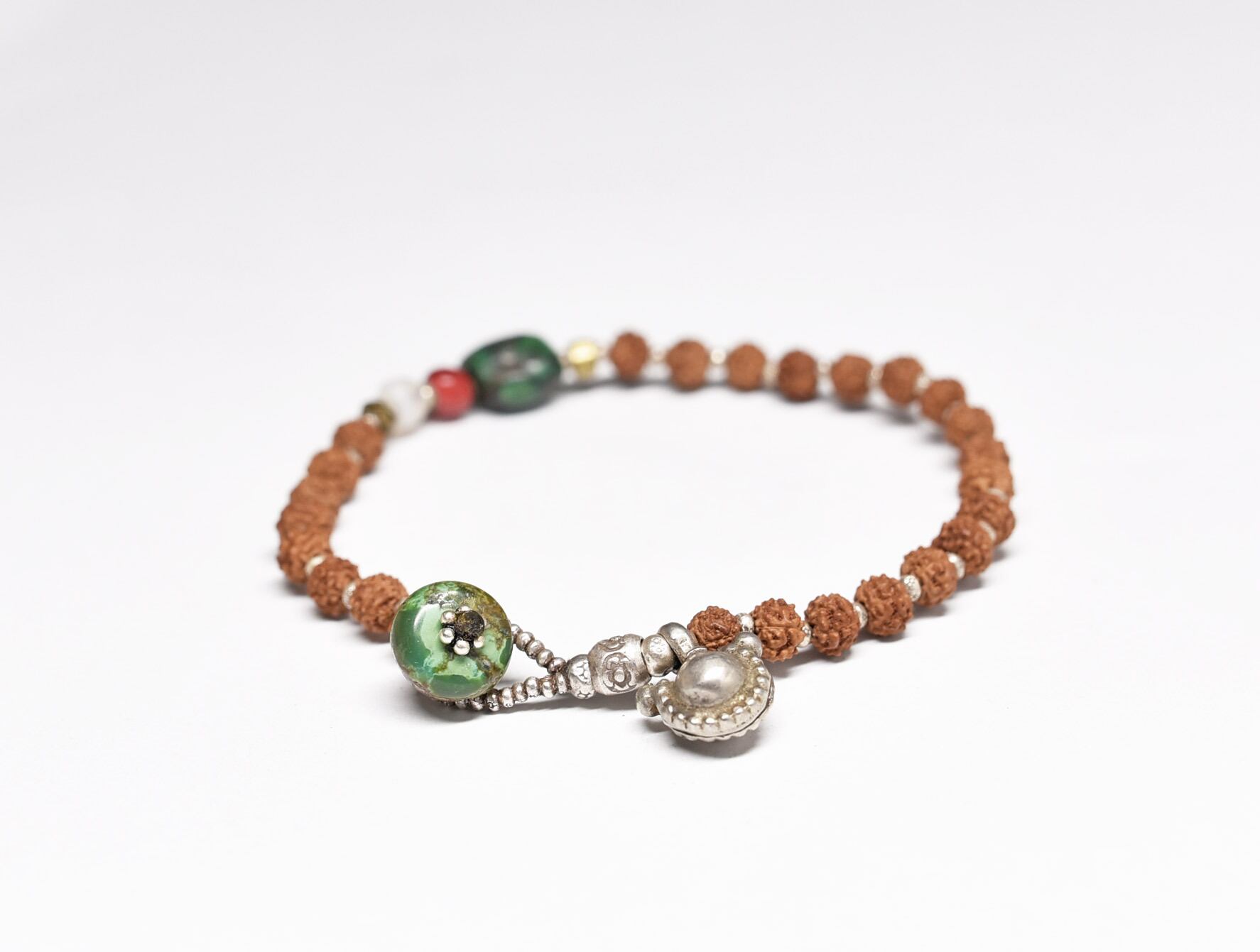 小さなルドラクシャと、oldチベタンターコイズ、古代瑪瑙、金赤ホワイトハーツ、oldオリッサブラスなどを繋いだブレスです。